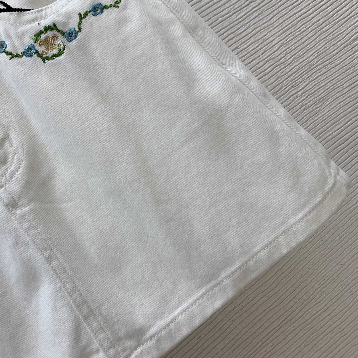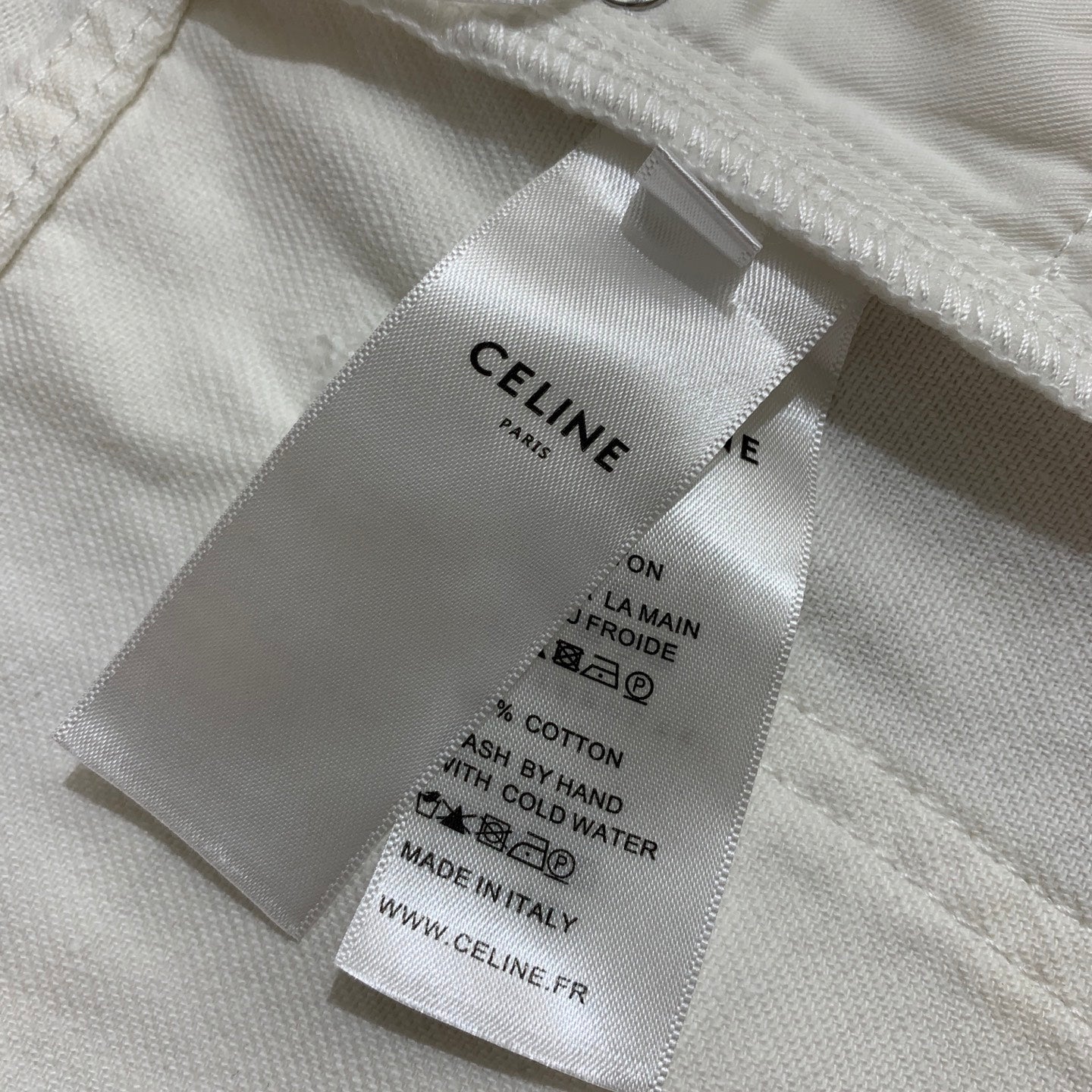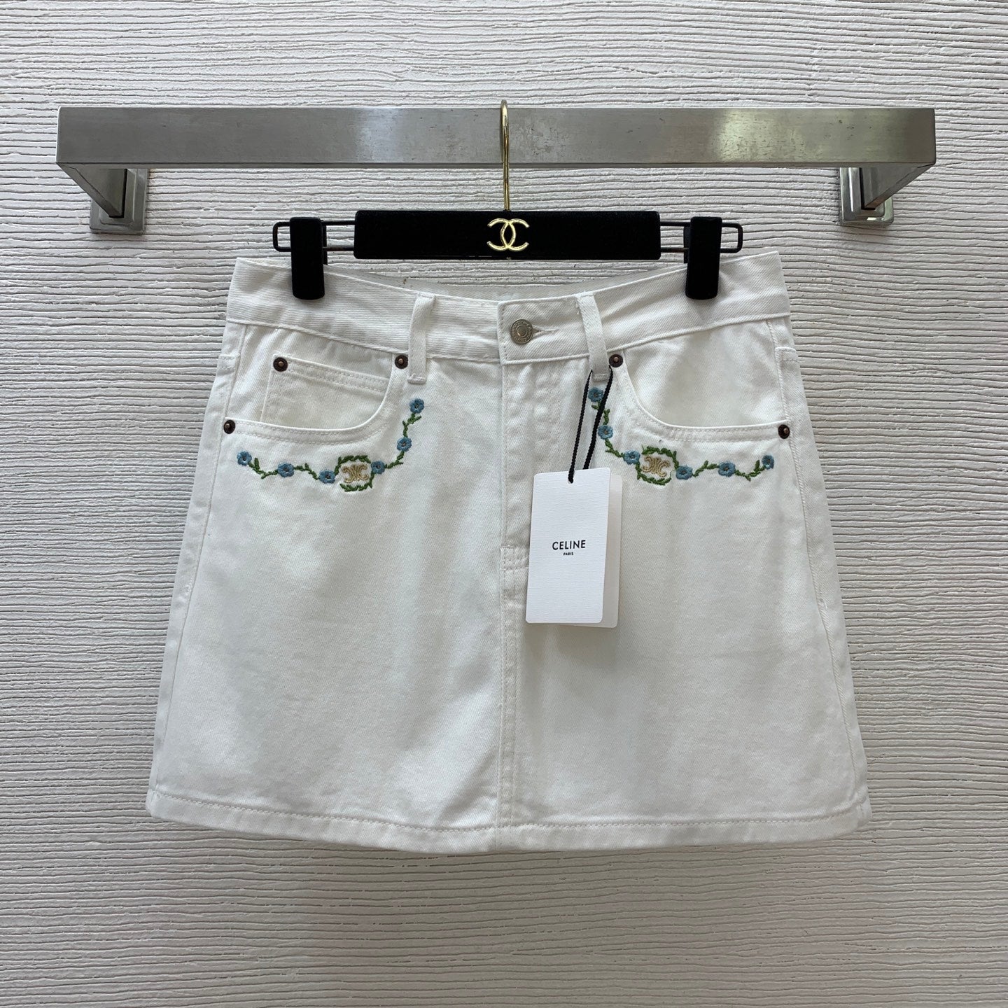 Elevate your wardrobe with Celine's exclusive high-end denim skirt, featuring the signature logo hardware and exquisite embroidered floral accents. This stylish, high-waisted design offers a flattering slim fit, perfect for any occasion. Available in chic off-white, this skirt comes in sizes 26, 27, 28, and 29, with size 27 featuring a waist measurement of 74 cm, a hip measurement of 94 cm, and a skirt length of 37 cm. Make a statement with this versatile piece that combines luxury and comfort effortlessly.