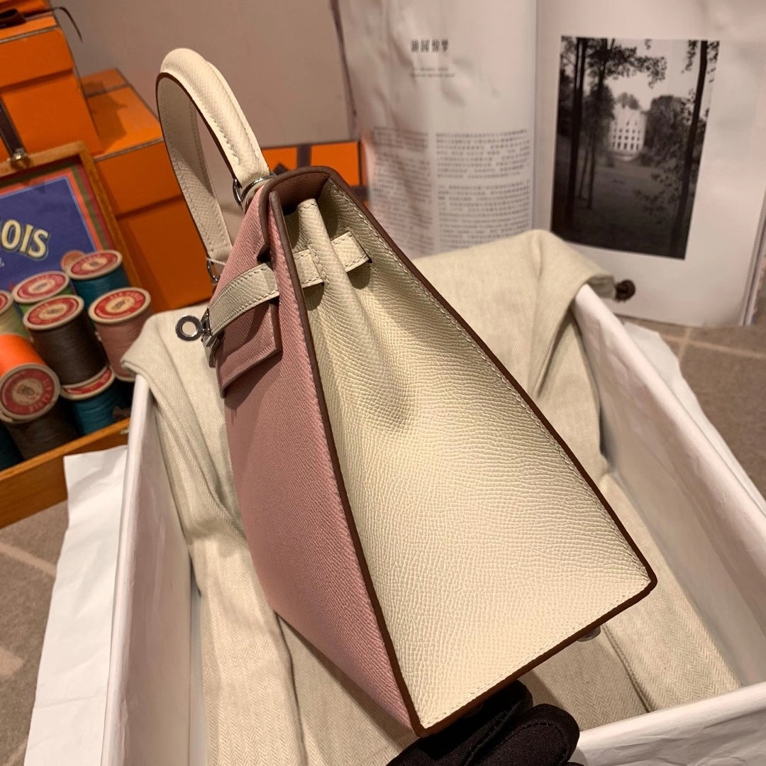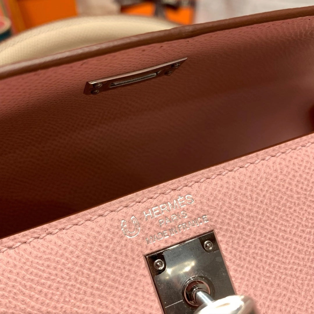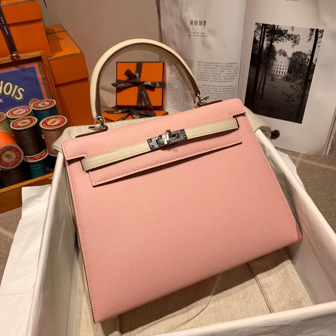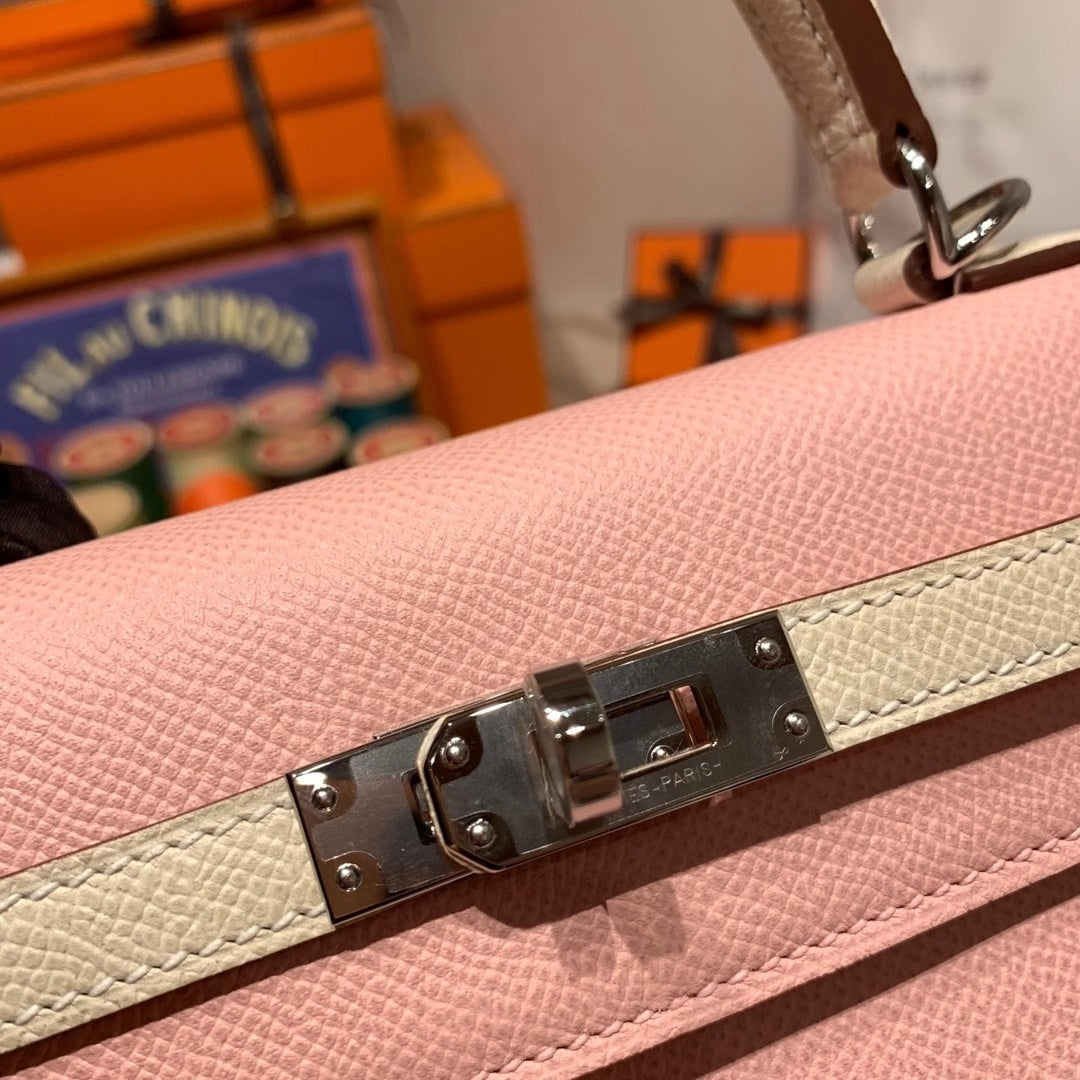 Elevate your style with our exclusive Semi-Handmade Kelly Bag, crafted from premium epsom leather in a stunning combination of Cherry Blossom Powder and Milkshake White. Measuring at 25cm, this unique piece features custom horseshoe prints, making it a truly personalized accessory for the discerning customer.