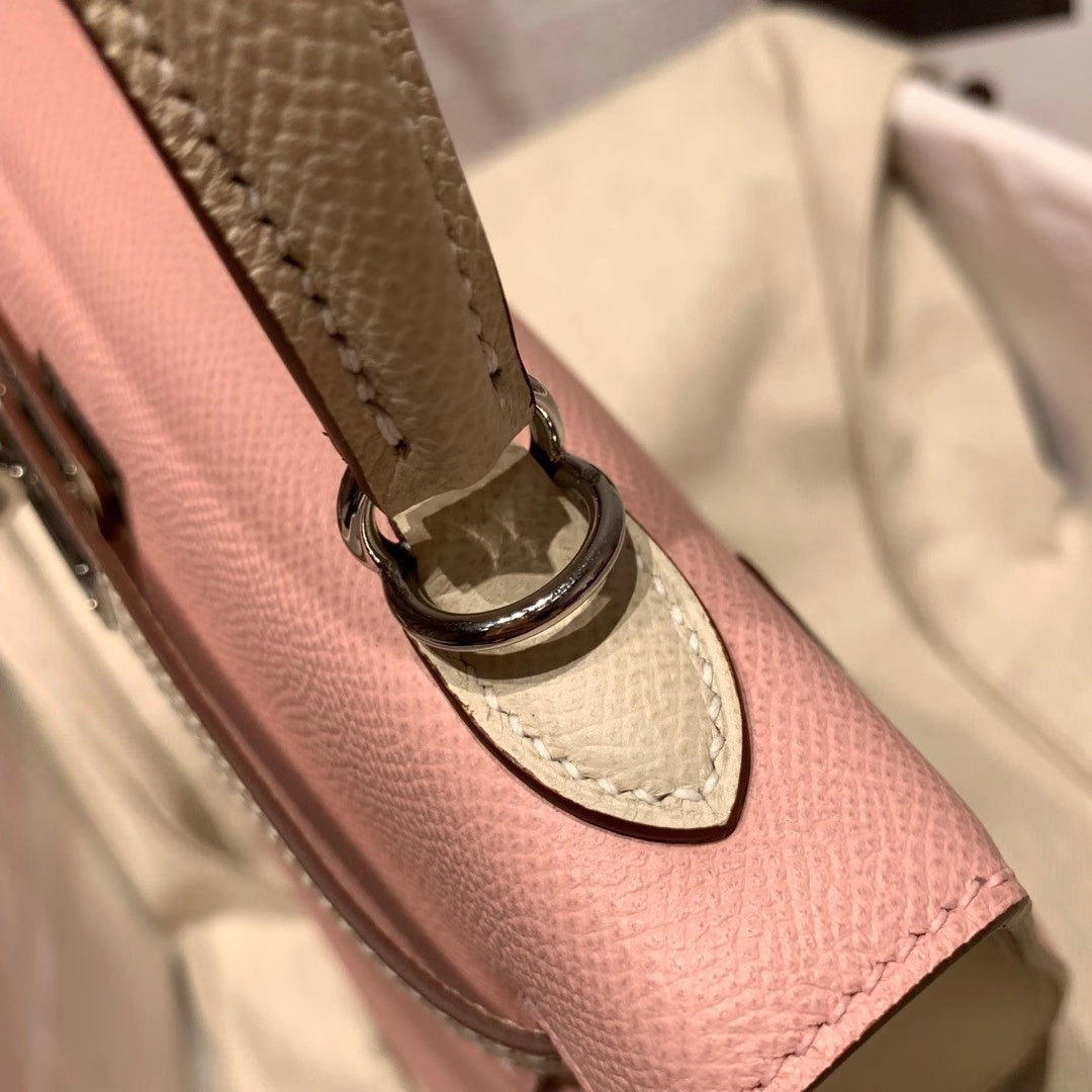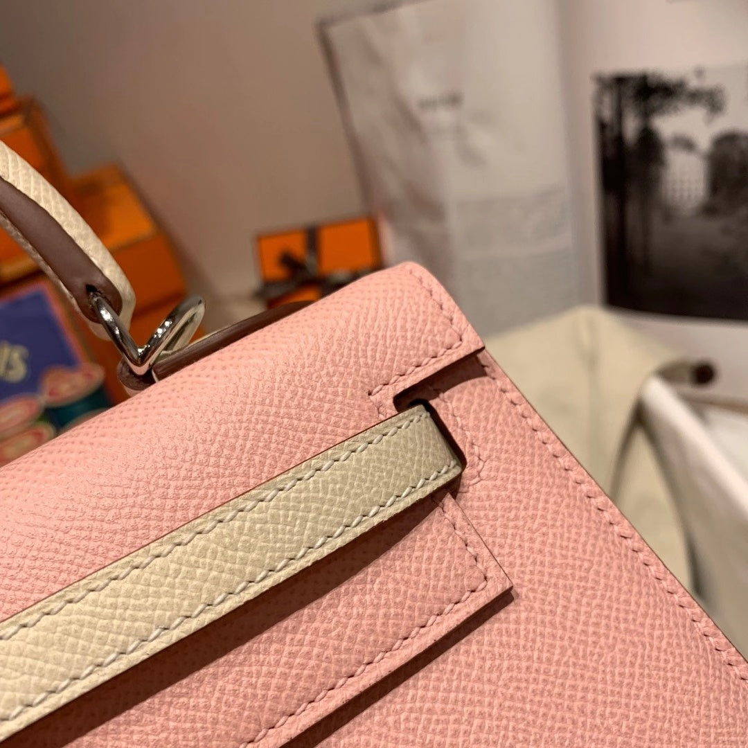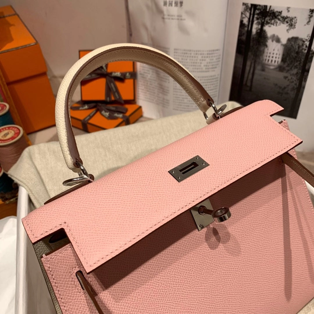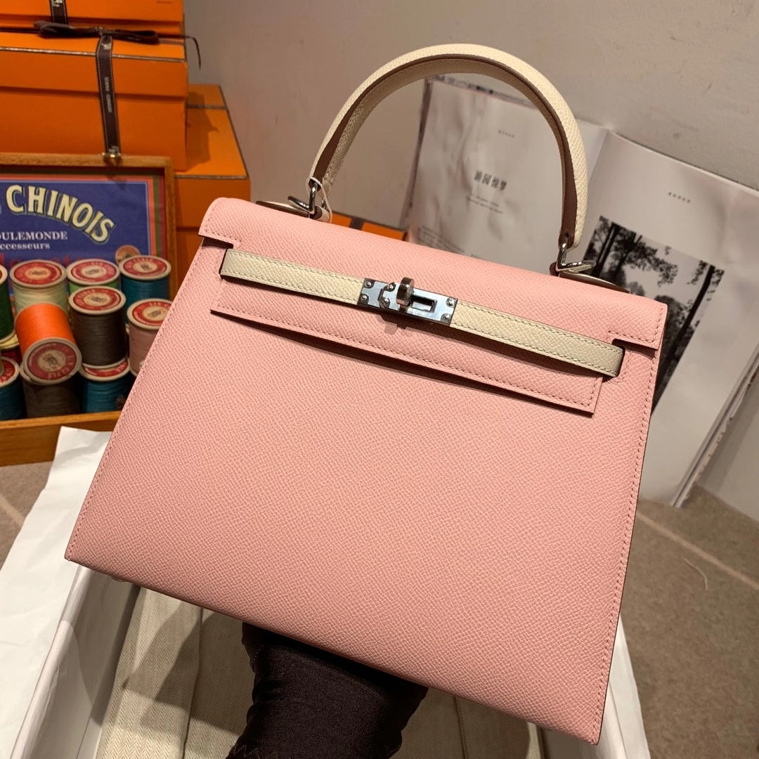 Elevate your style with our exclusive Semi-Handmade Kelly Bag, crafted from premium epsom leather in a stunning combination of Cherry Blossom Powder and Milkshake White. Measuring at 25cm, this unique piece features custom horseshoe prints, making it a truly personalized accessory for the discerning customer.
