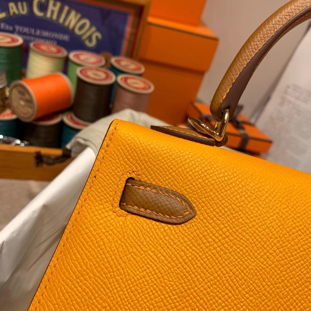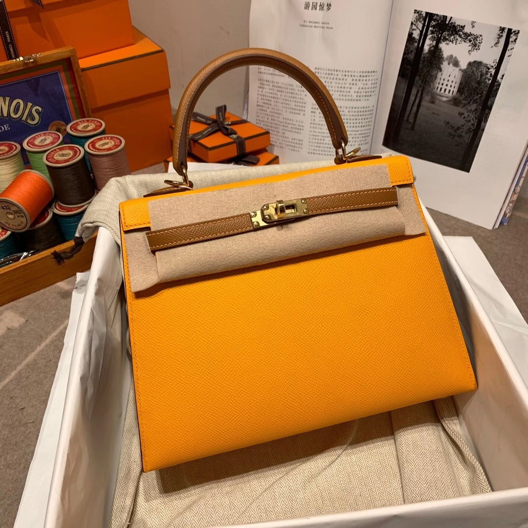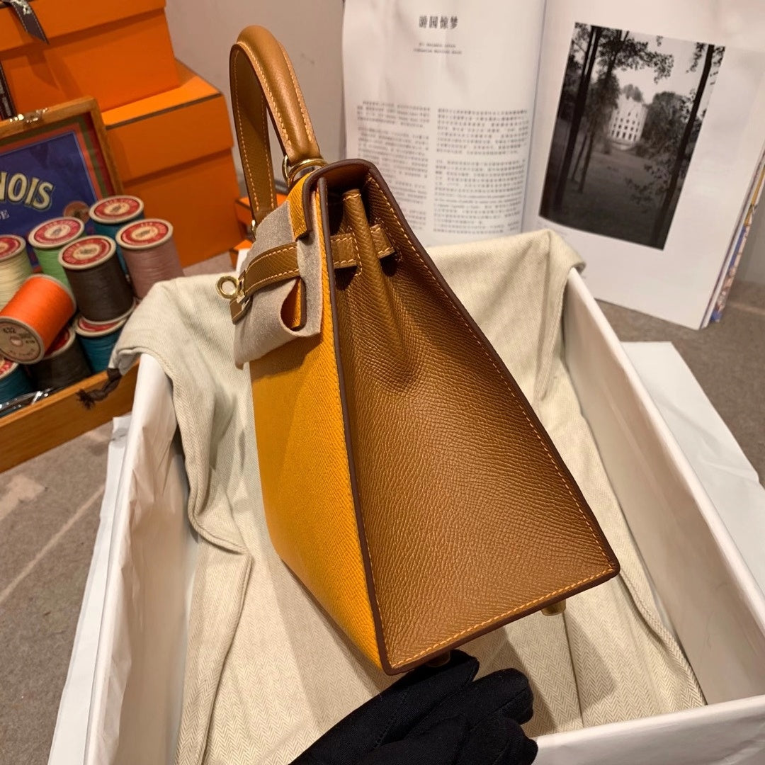 Custom Kelly 25cm Epsom Leather Handbag in Mango Yellow and Golden Brown