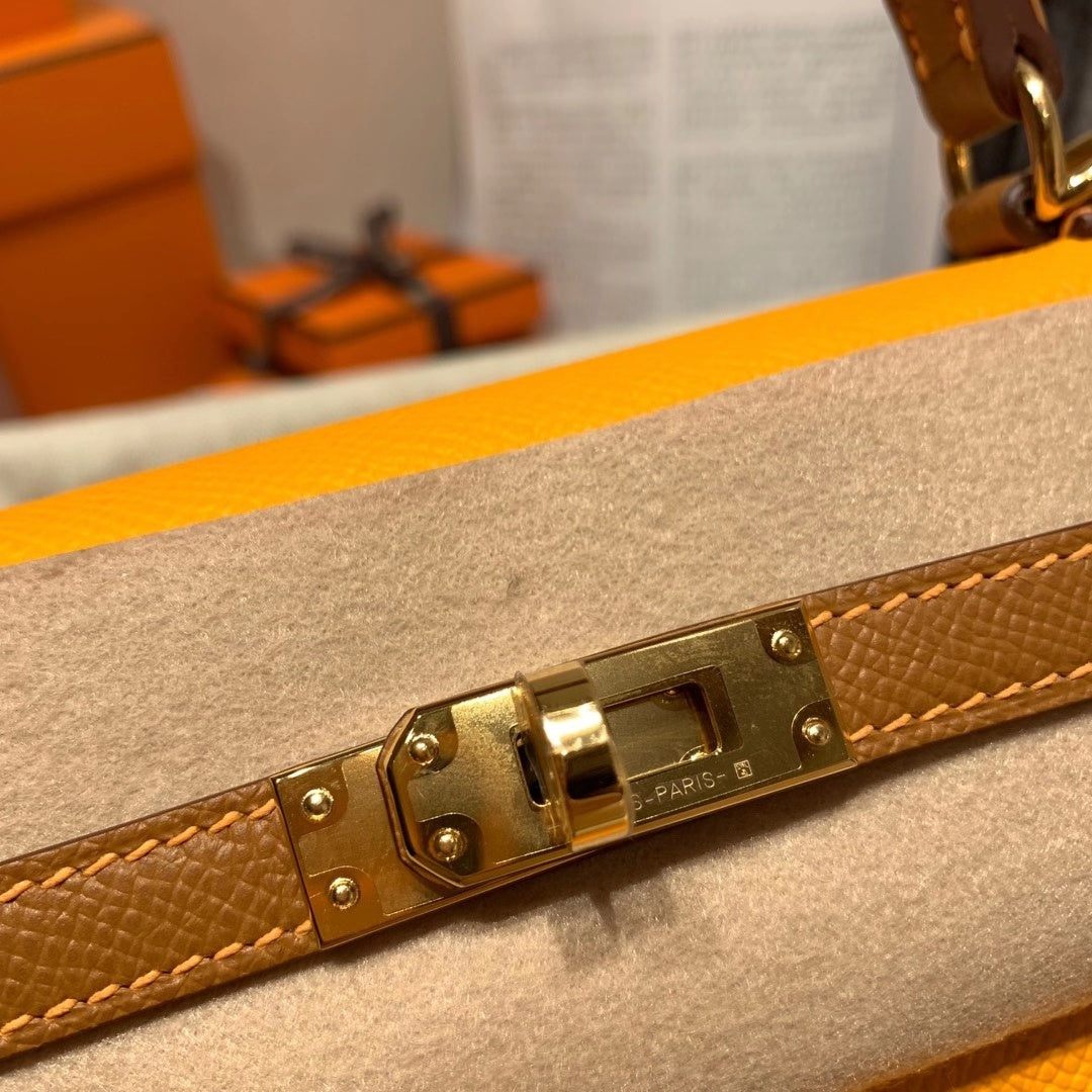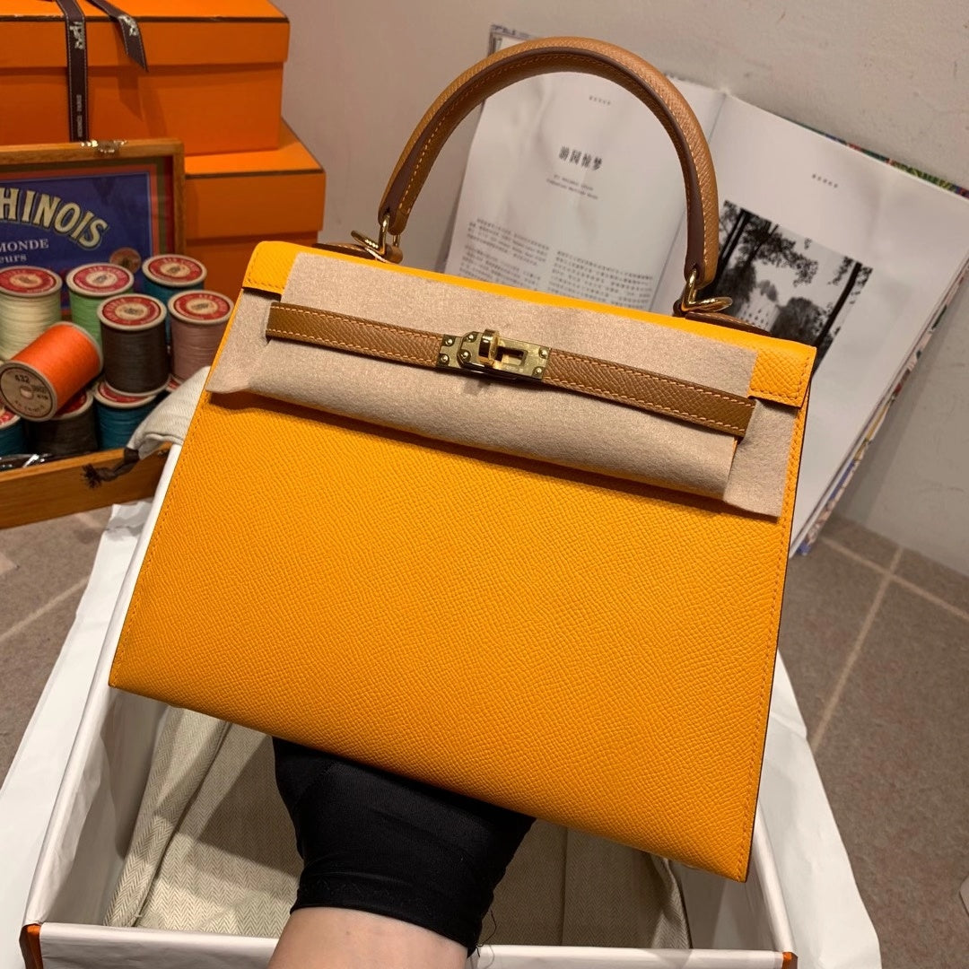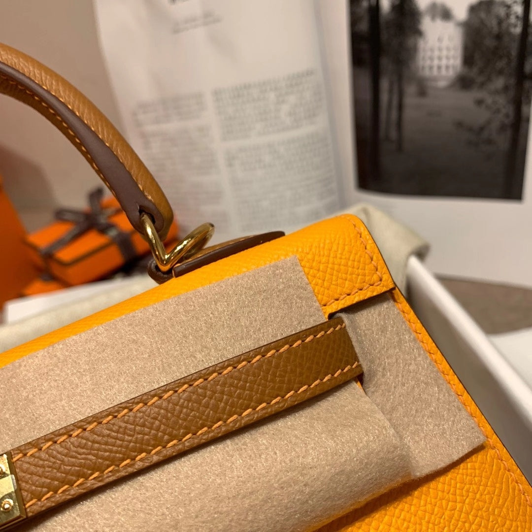 Discover the elegance of our semi-handmade Kelly handbag, crafted from premium epsom leather in a striking mango yellow with golden brown accents. This exclusive 25cm model features unique horseshoe prints, making each piece truly one-of-a-kind. Designed for our VIP customers, this handbag not only showcases your personal style but also elevates your social status. Enhance your collection with this luxurious and customizable accessory, perfect for any occasion. Limited availability – order yours today!