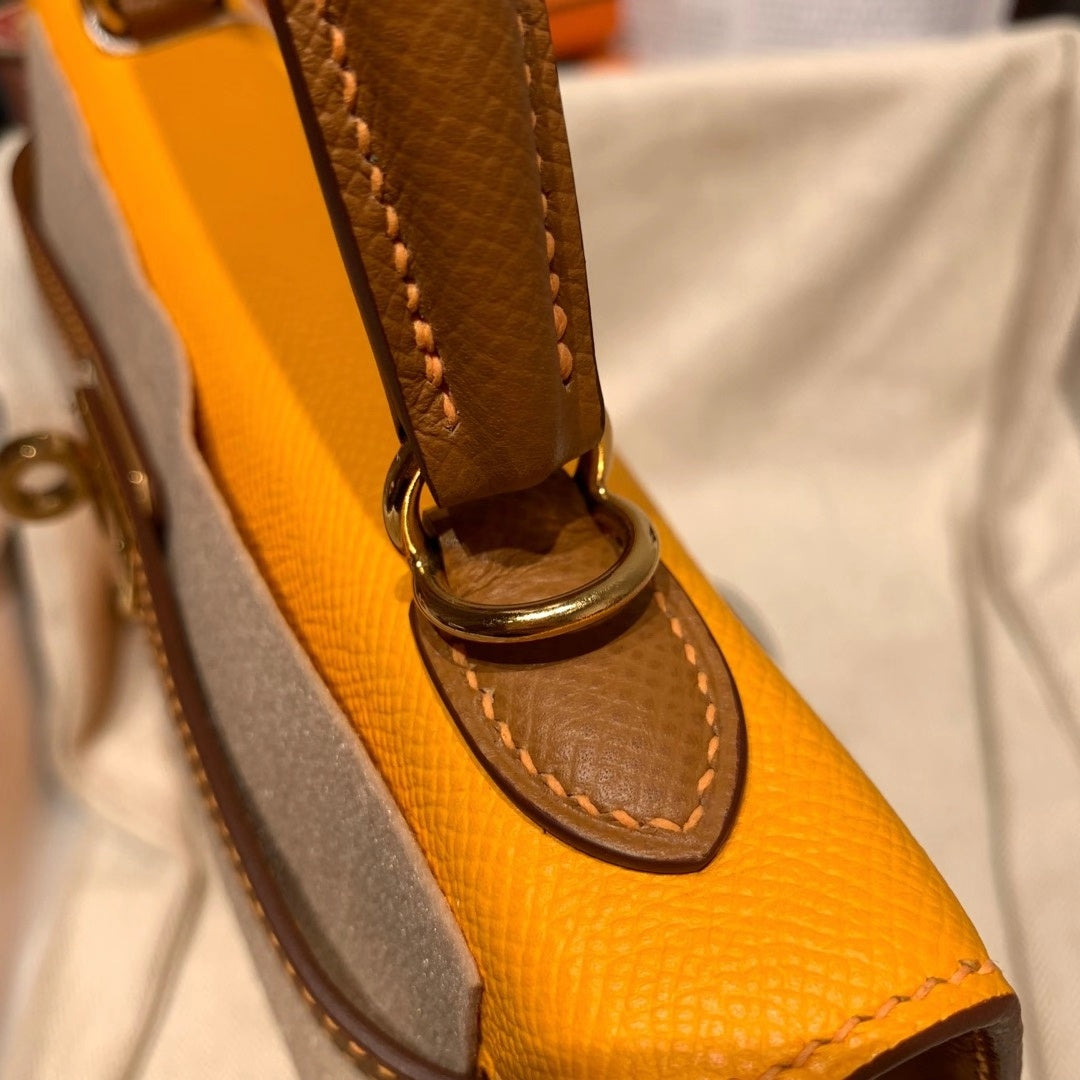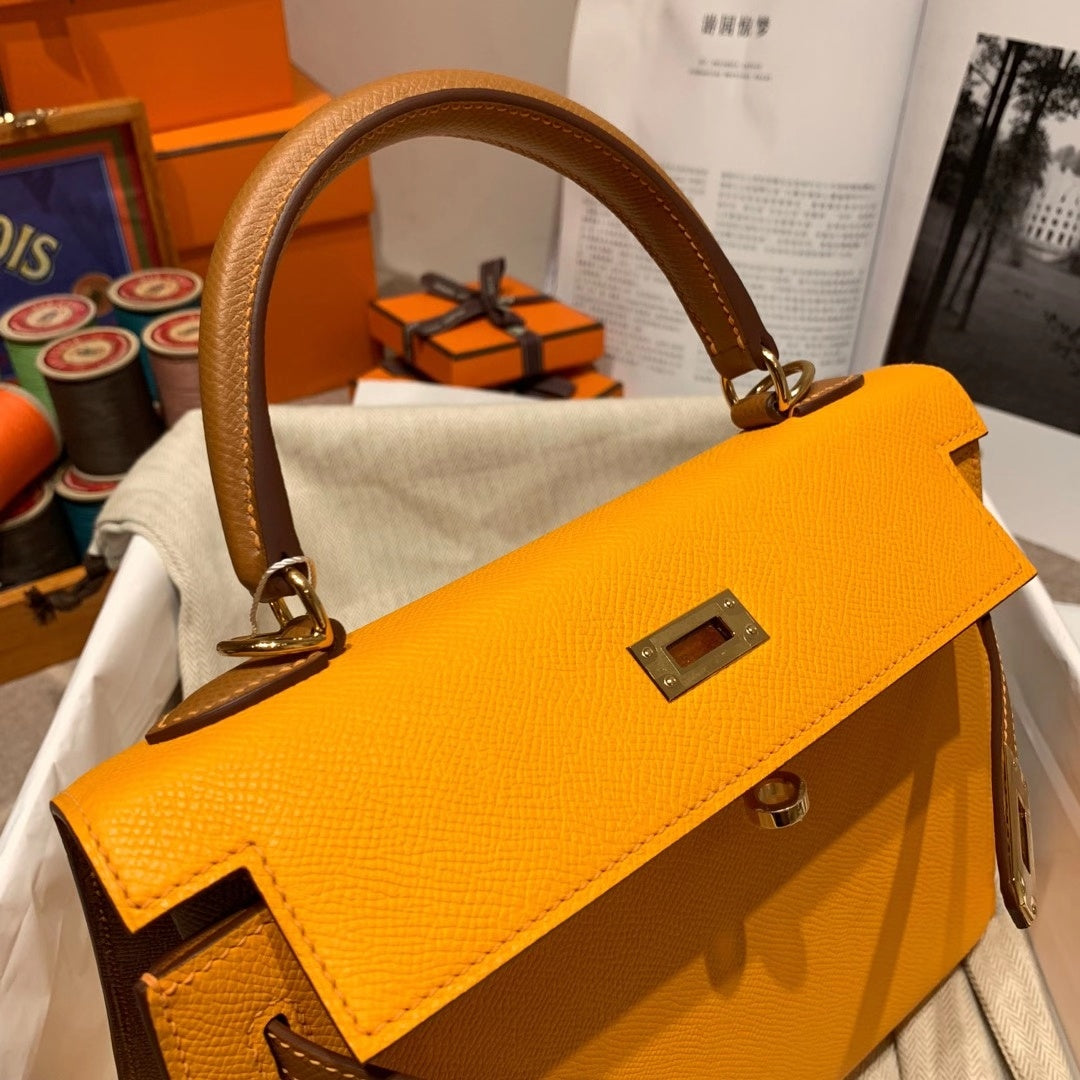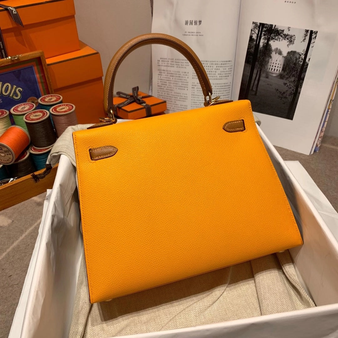 Discover the elegance of our semi-handmade Kelly handbag, crafted from premium epsom leather in a striking mango yellow with golden brown accents. This exclusive 25cm model features unique horseshoe prints, making each piece truly one-of-a-kind. Designed for our VIP customers, this handbag not only showcases your personal style but also elevates your social status. Enhance your collection with this luxurious and customizable accessory, perfect for any occasion. Limited availability – order yours today!