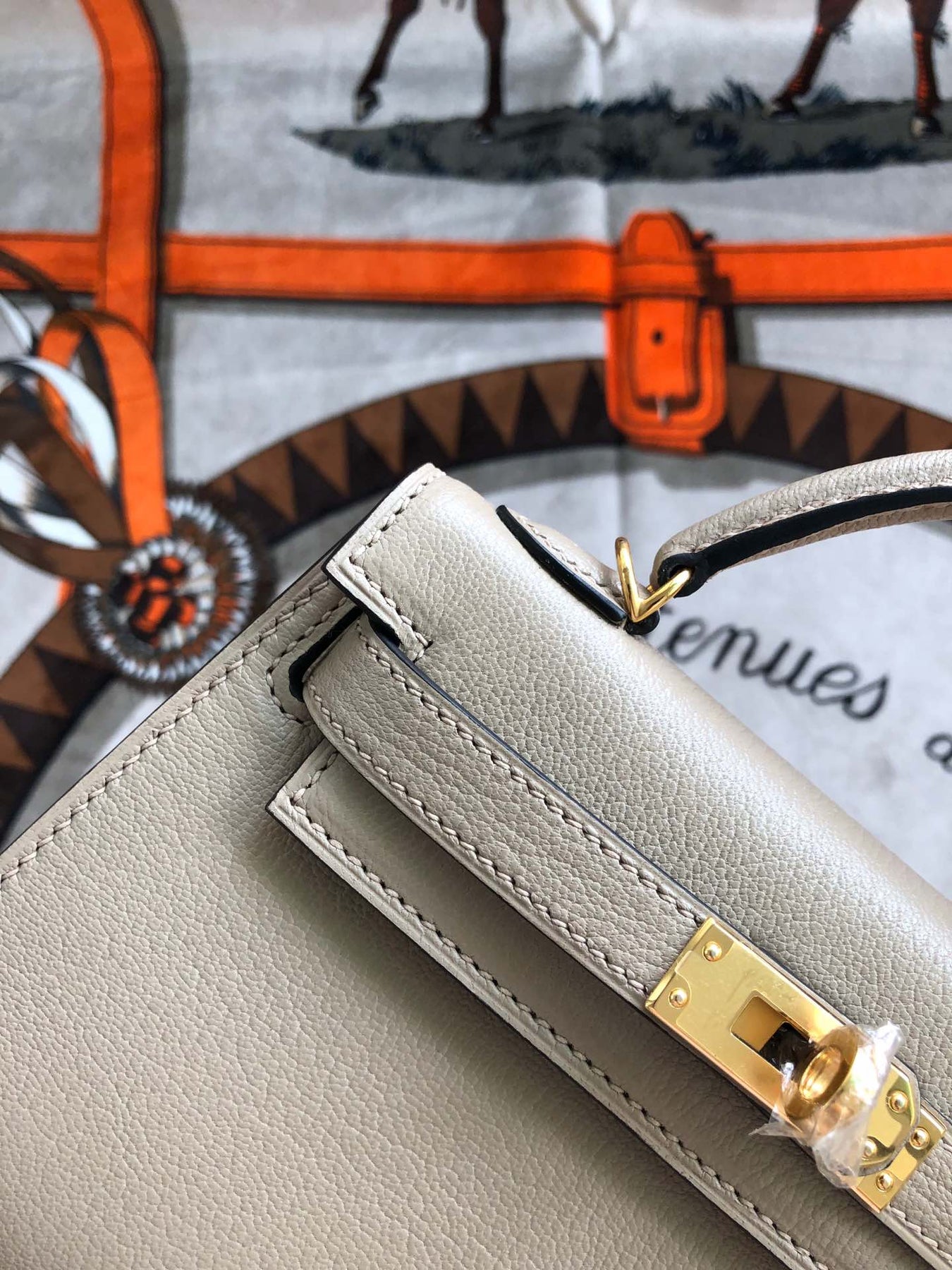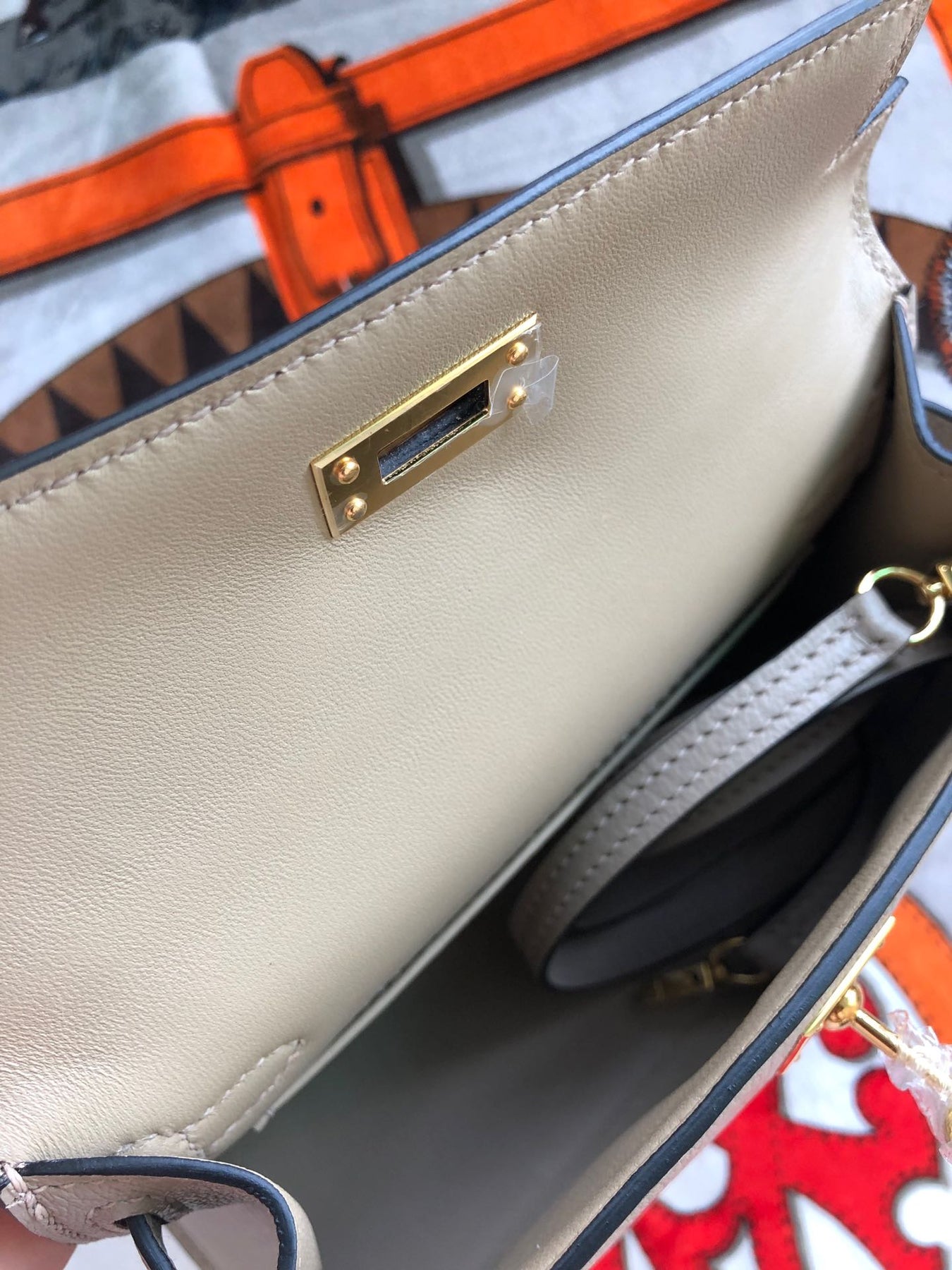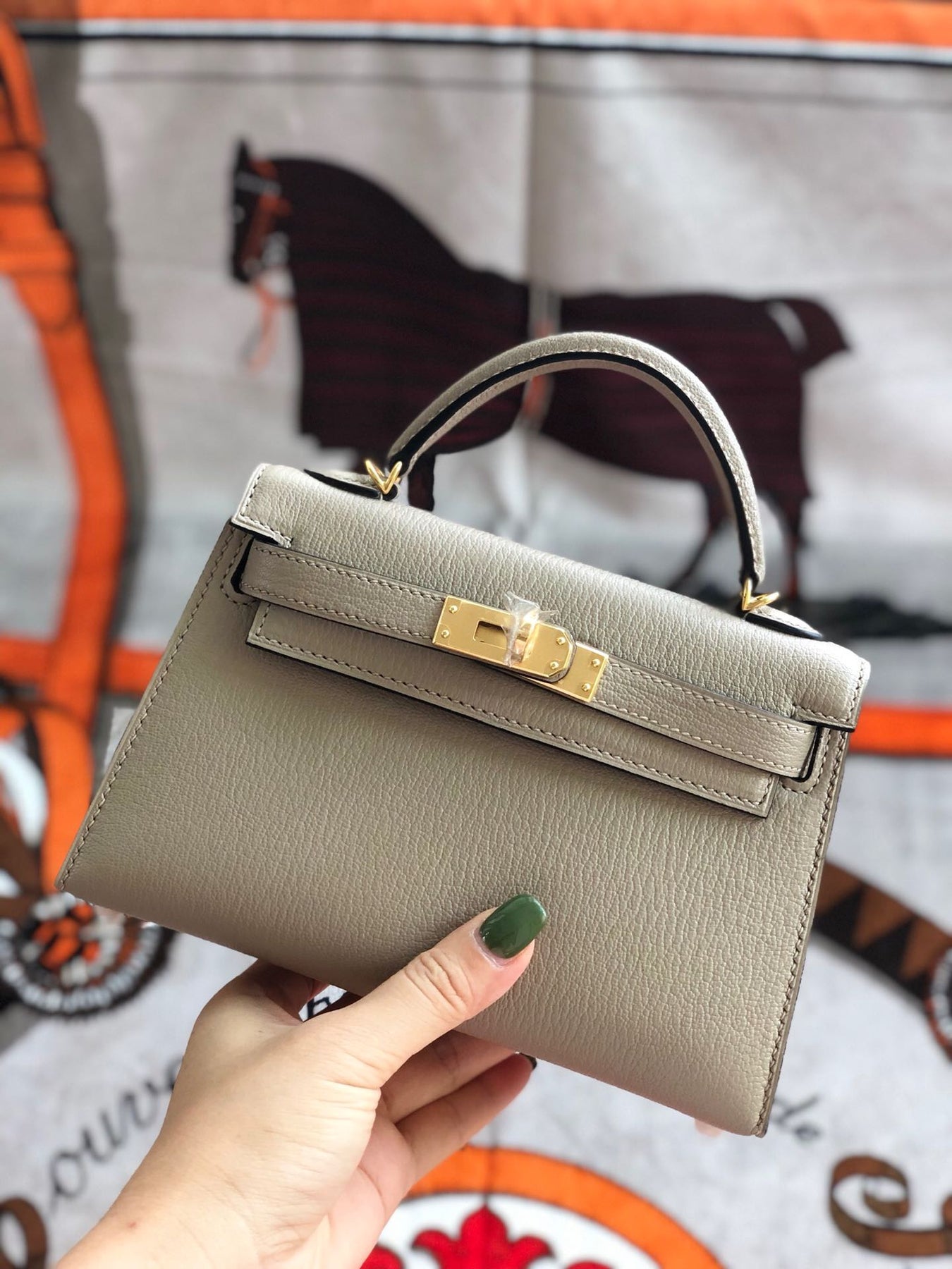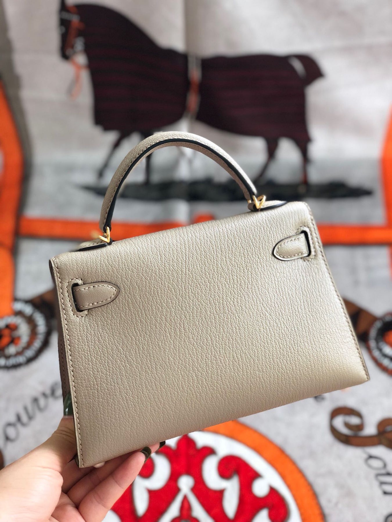 Discover the exquisite craftsmanship of our Custom Mini Kelly 19cm. This semi-handmade handbag features luxurious Chevre Mysore goatskin in a sophisticated turtle dove gray, accentuated by a stunning gold buckle. Each bag is meticulously crafted to order, with premium wax thread hand-sewn for durability and style. Elevate your collection with this unique and elegant accessory, perfect for any occasion.