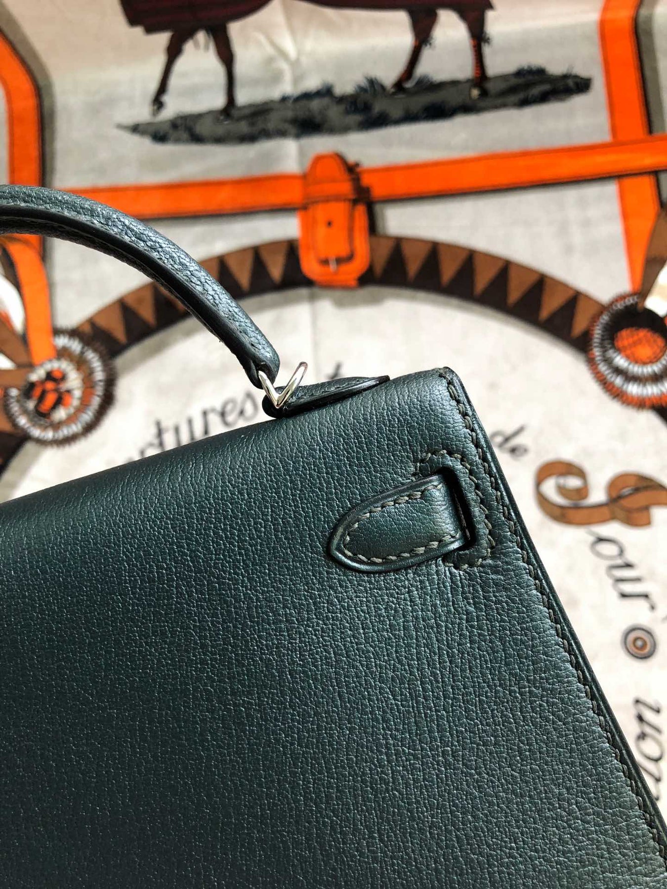 Introducing the Custom Semi-Handmade Kelly 19cm Mini Bag, a stunning piece crafted from premium Chevre Mysore goatskin. This second-generation mini Kelly features a beautiful cypress green hue, complemented by an elegant silver buckle. Each bag is meticulously hand-sewn with waxed thread, ensuring exceptional durability and a refined finish. Perfect for any occasion, this exclusive 19cm bag combines timeless style with bespoke craftsmanship. Elevate your accessory collection with this luxurious and stylish mini bag today!