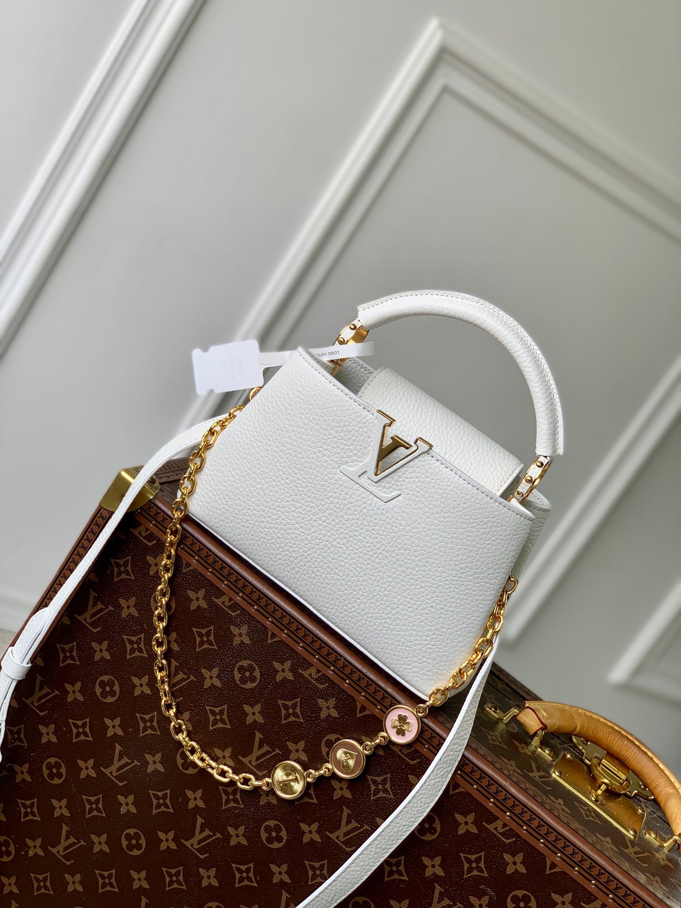 Elevate your style with the Capucines series, featuring a sophisticated blend of classic design and modern customization. This handbag, measuring 14 x 8 x 23.5 cm (H x W x L), offers a unique option between Mini and BB sizes. Choose from a selection of premium leather colors and personalize your look with one of three exquisite embellishments on the chain. Each piece is adorned with double-plated lettering and elegant, brand-inspired charms, perfectly paired with refined hardware. Make a statement wherever you go with this timeless, customizable accessory.