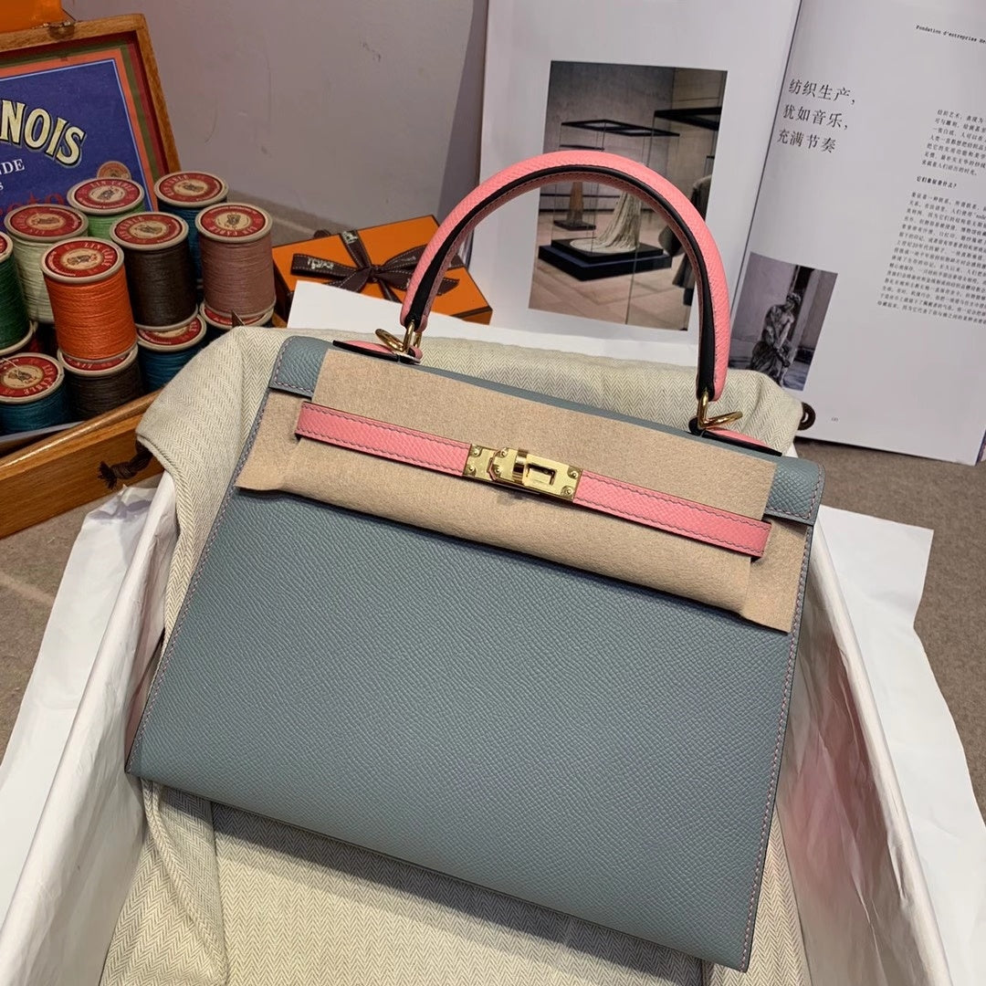 Introducing our exquisite Kelly 25cm bag, meticulously handcrafted from premium epsom leather in a stunning glacier blue and milkshake powder finish. This semi-handmade piece features a unique beeswax stitching technique, ensuring durability and elegance.