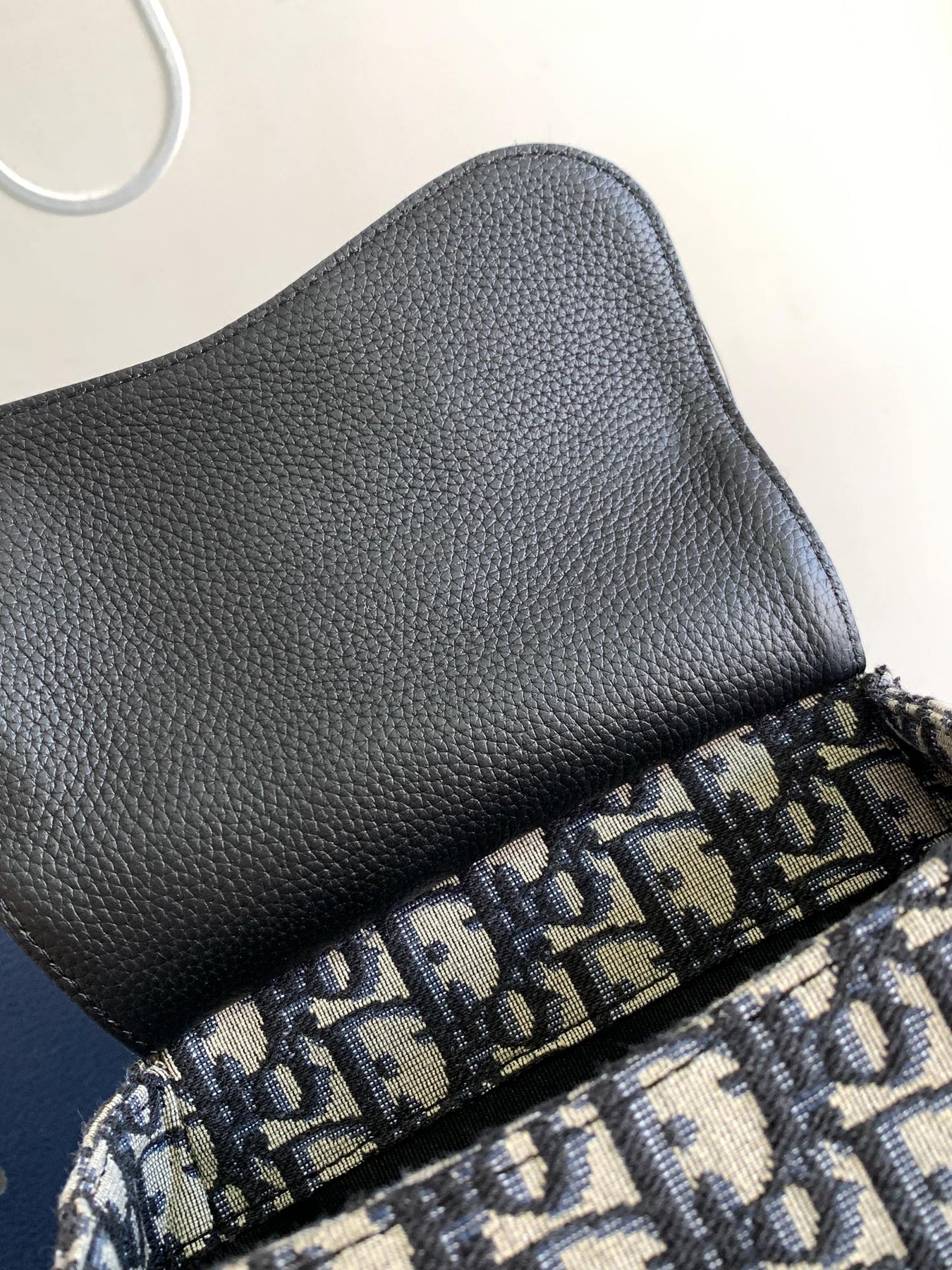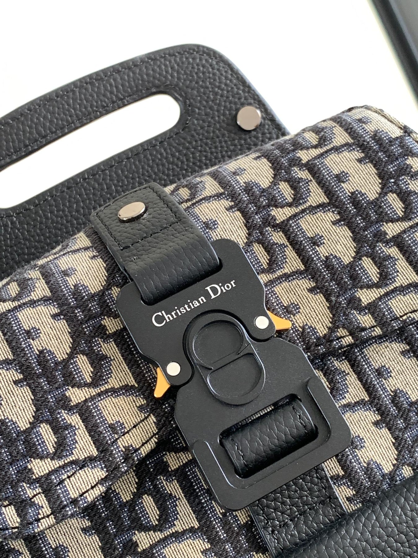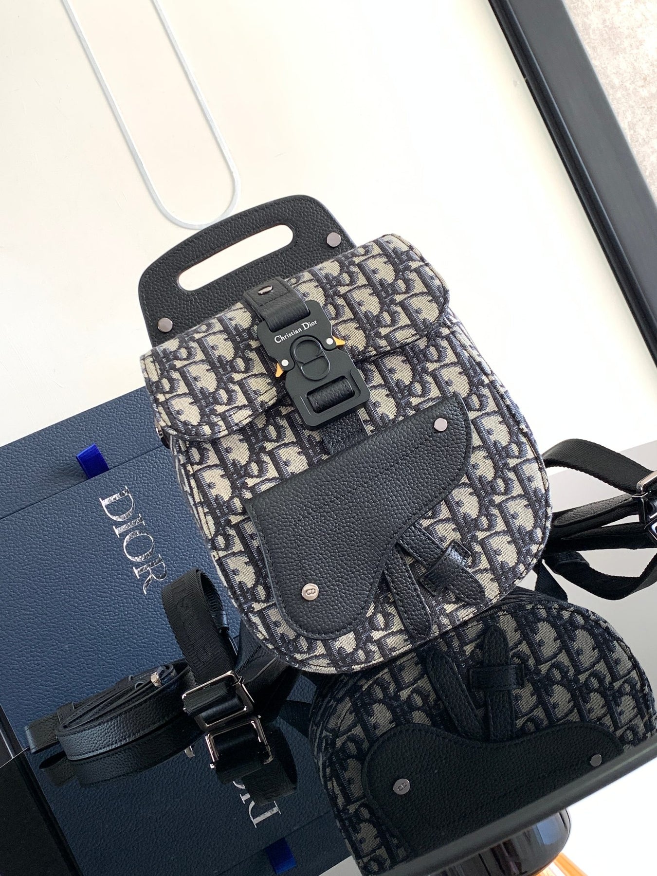 Elevate your style with the Dio Oblique Jacquard Mini Saddle Backpack, crafted from premium navy Dio Oblique jacquard fabric and accented with signature black grained calf leather. This chic backpack features a distinctive flap closure adorned with a classic "Christian Dio" buckle, complemented by a convenient external saddlebag-style pocket for easy access to your essentials.