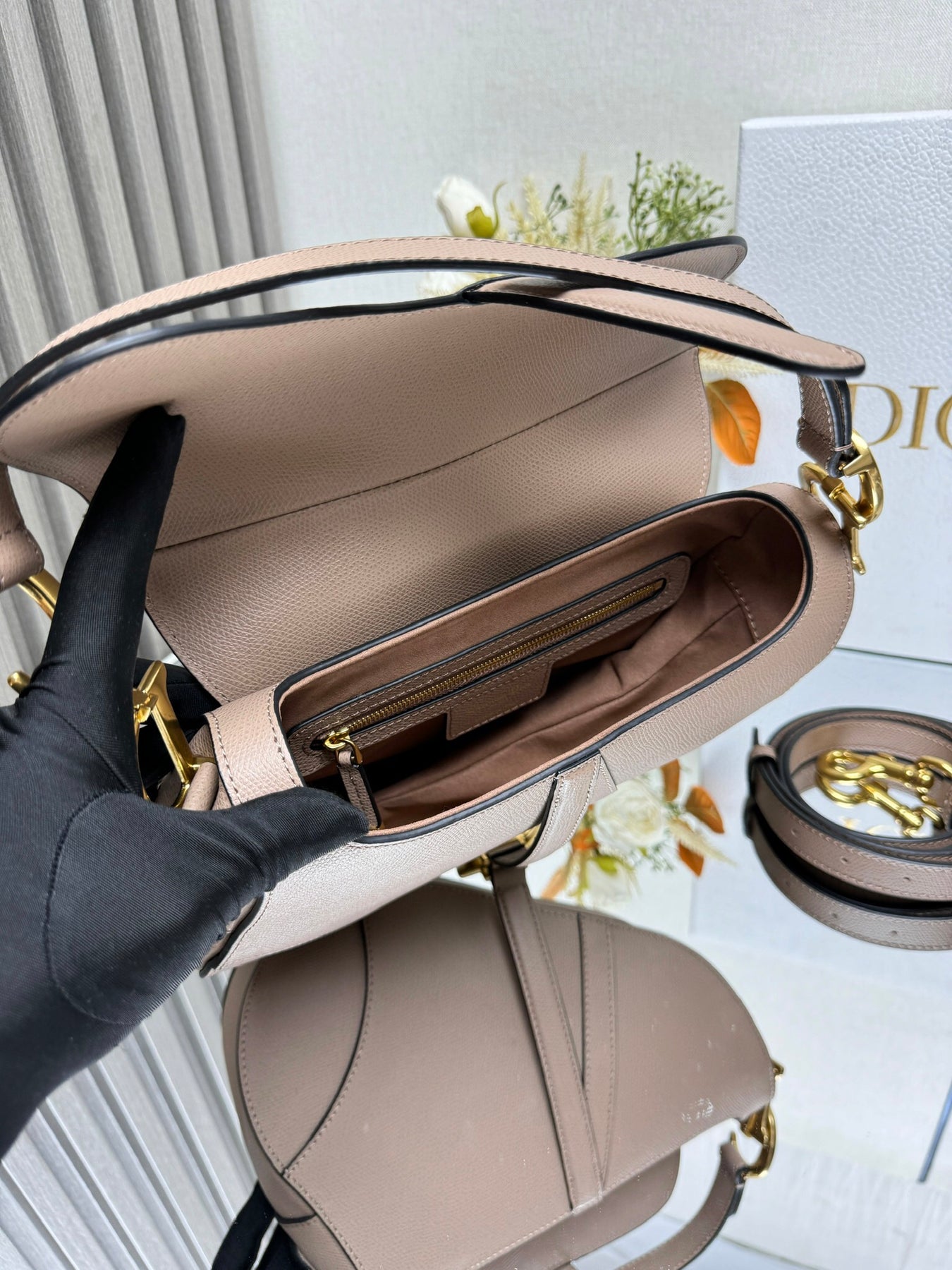 Introducing the Dior Saddle Bag in a stunning nude pink skin featuring an elegant palm print. This newly launched handbag has quickly become a favorite among fashion celebrities, making it a must-have addition to your collection.
