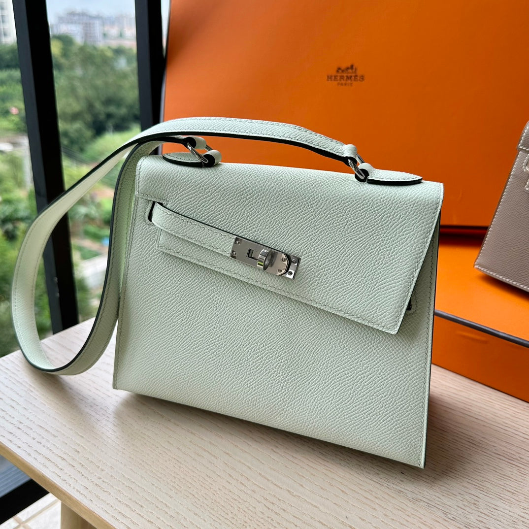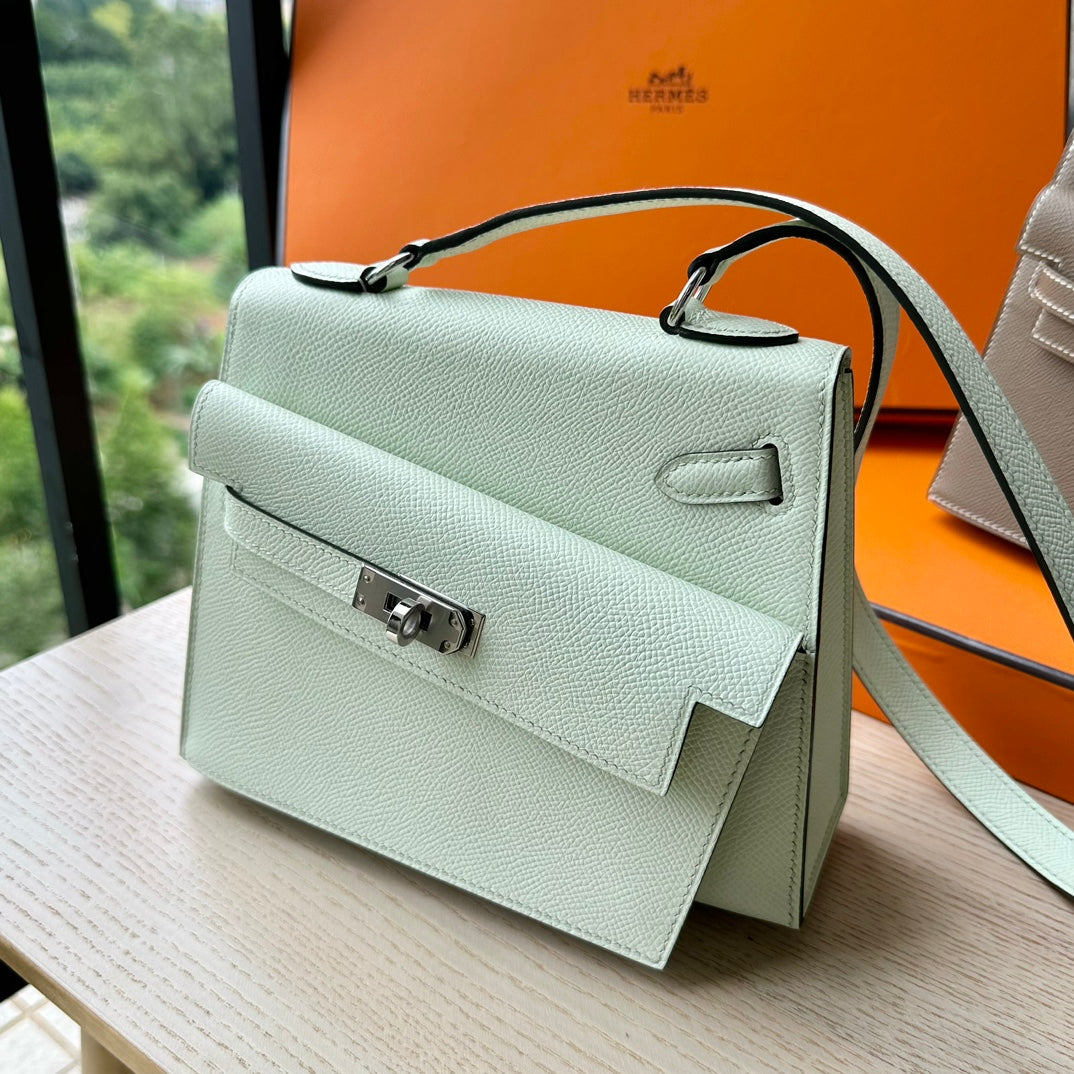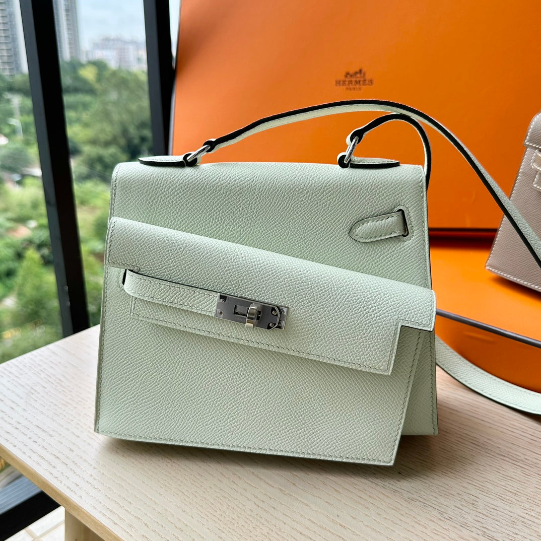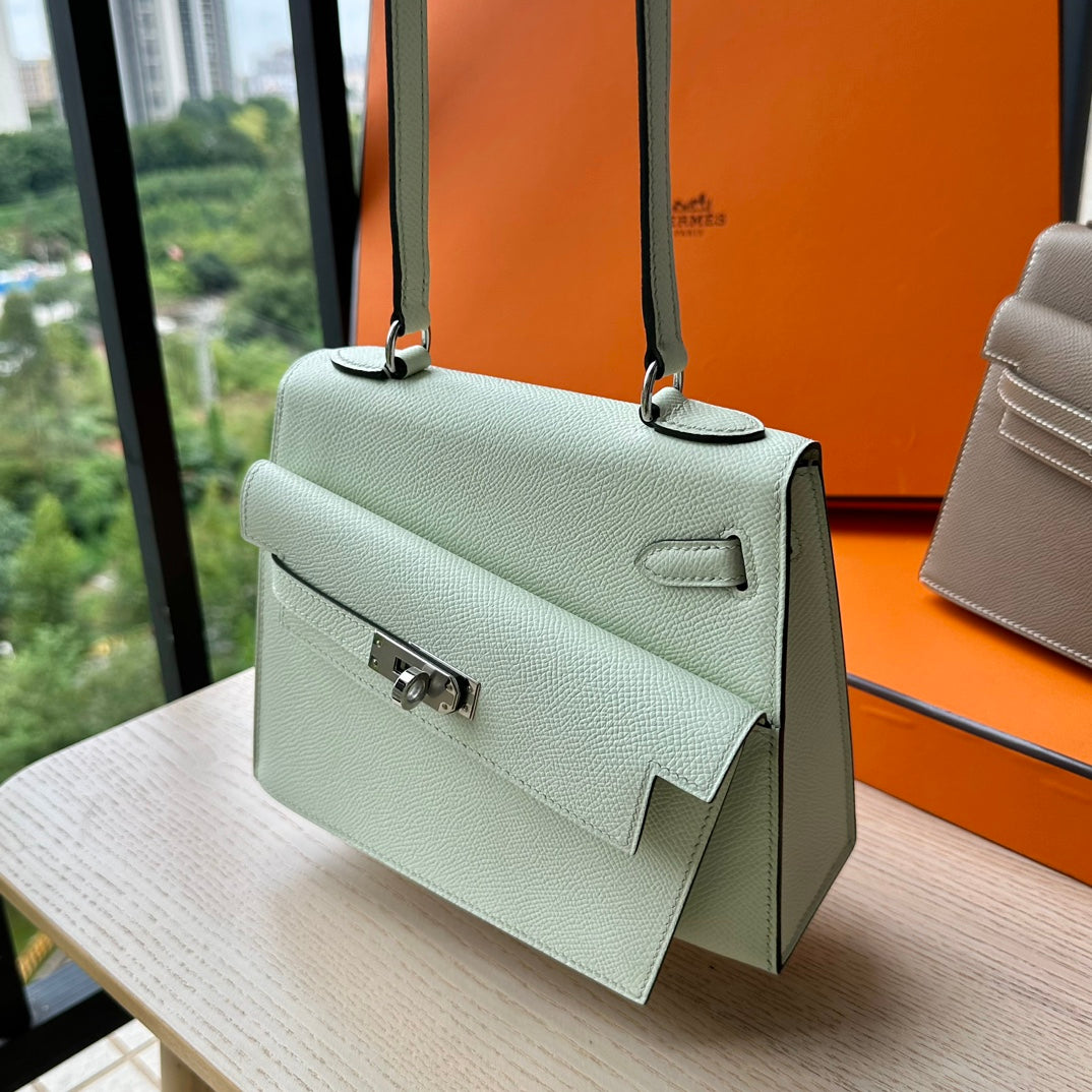 Double-Sided Kelly Desordre 20cm Epsom Bag in Bubble Green with Silver Buckle