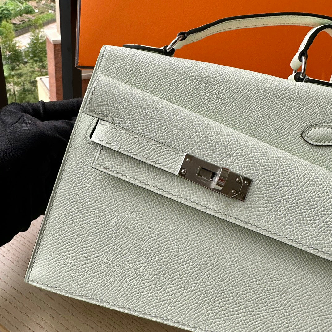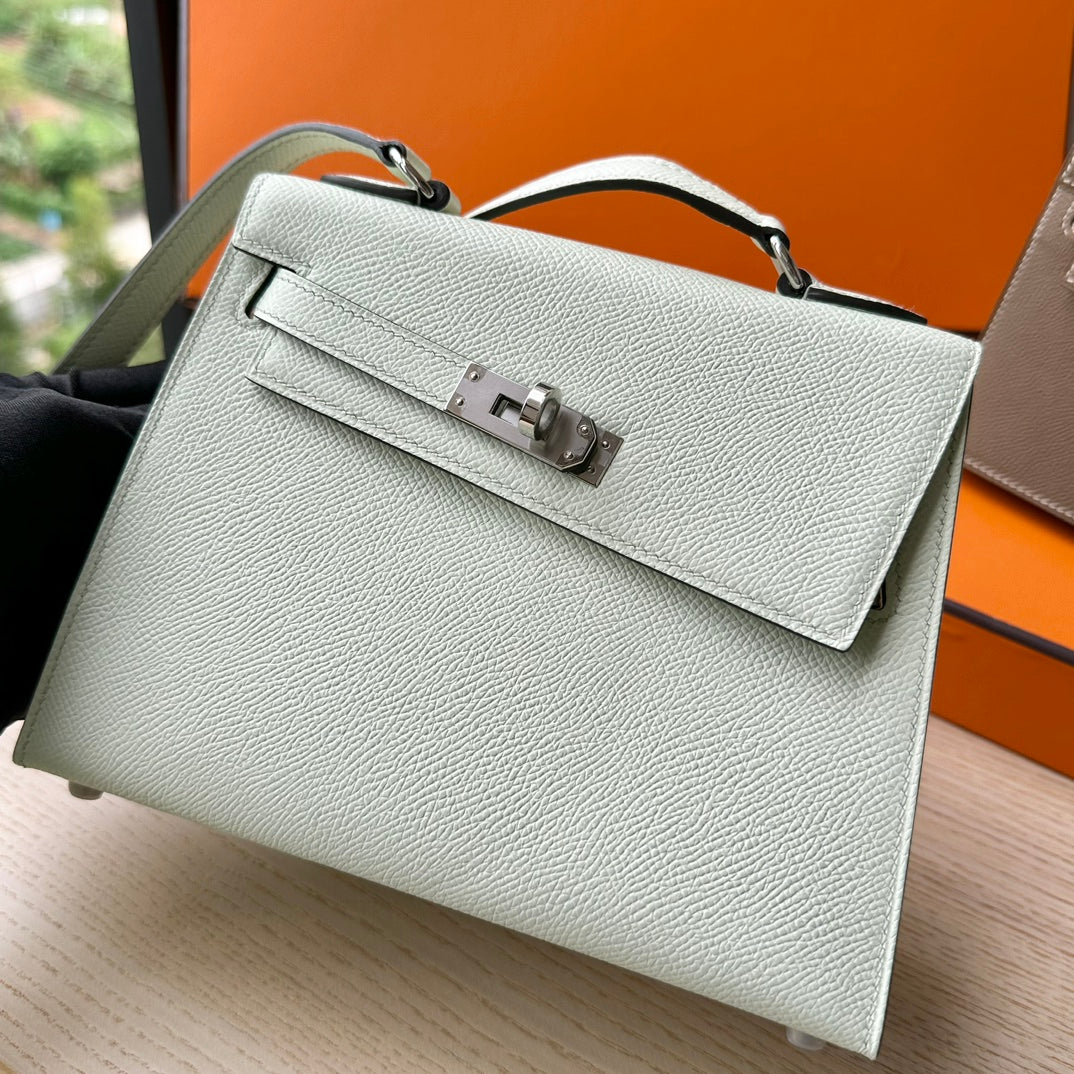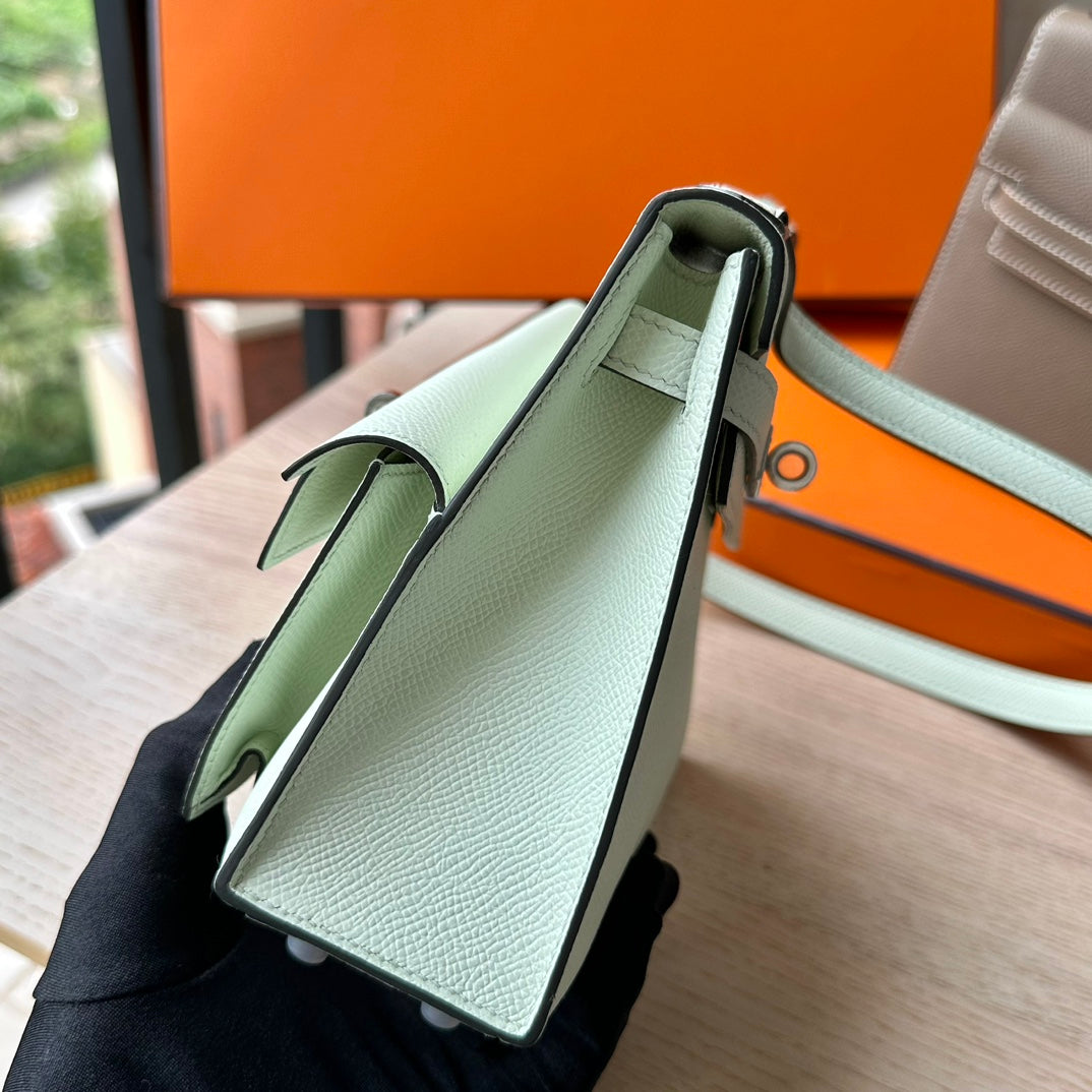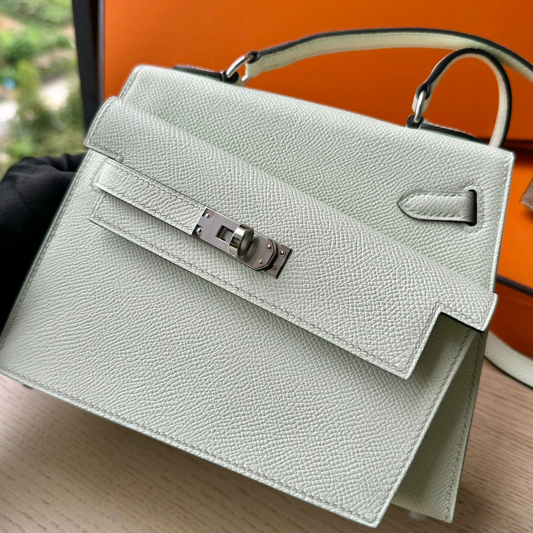 Double-Sided Kelly Desordre 20cm Epsom Bag in Bubble Green with Silver Buckle