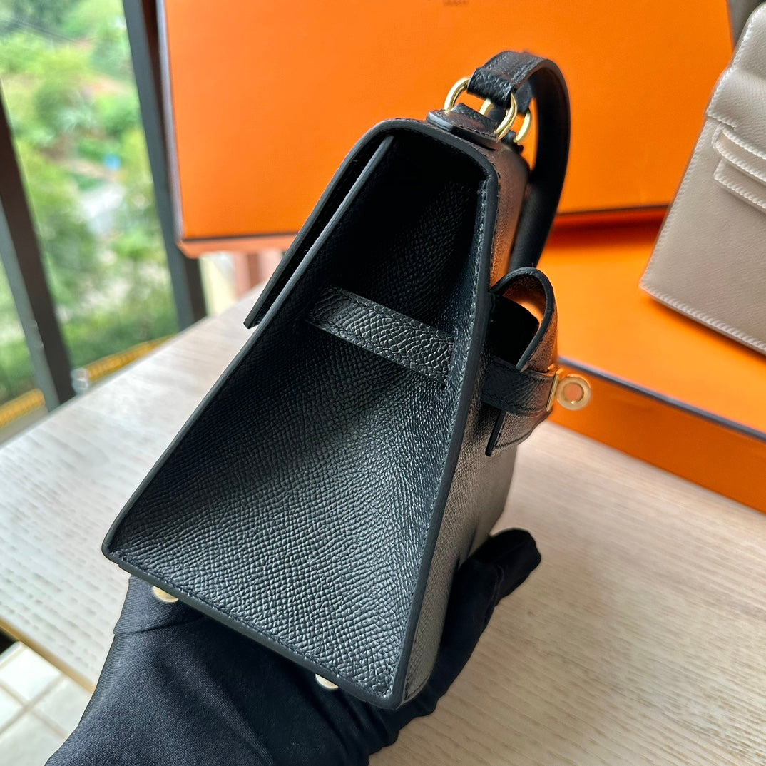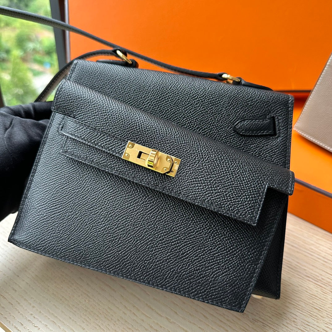 Discover the exquisite craftsmanship of our Semi-Handmade Double-Sided Kelly Desordre, measuring 20cm. Crafted from premium Epsom leather, this luxurious bag features a striking black design complemented by a sophisticated gold buckle. The meticulous wax thread sewing details enhance its elegance and durability, making it a statement piece for any occasion. Elevate your style with this first-class accessory that seamlessly combines functionality and high-end fashion.