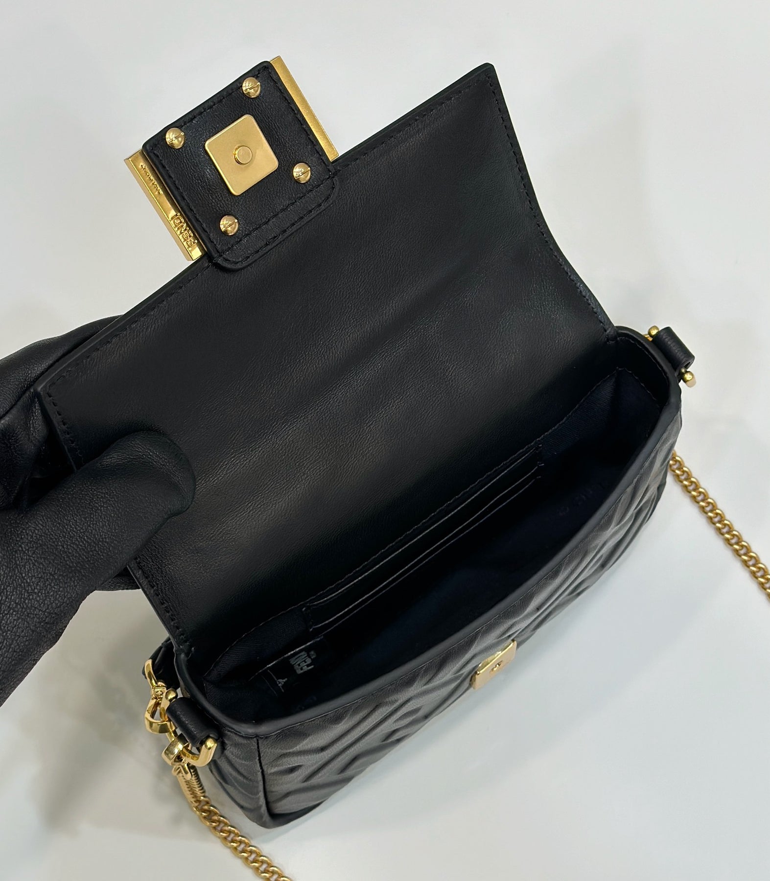 Introducing the 0135s Black Flip Cross-Body Handbag, a chic accessory that elevates any outfit. Crafted from durable sheepskin featuring an embossed F design, this handbag is as stylish as it is functional. It comes with a detachable chain leather shoulder strap and a convenient hand strap for versatile carrying options. Measuring 19cm, it includes a complete set of packaging for a perfect gift presentation. Upgrade your handbag collection with this timeless piece.