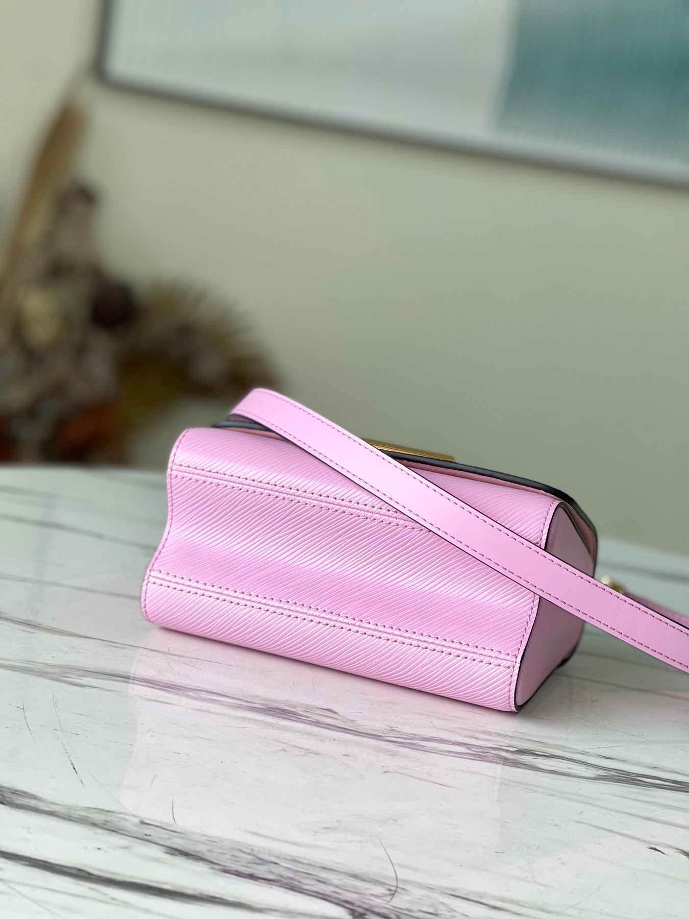 Introducing the Twist Small Handbag in a stunning pink-purple hue. Crafted from high-quality Epi grain leather, this elegant accessory features a unique handmade pocket adorned with an enamel Monogram flower, seamlessly integrated into the chain. This thoughtful design allows for versatility in carrying, while adding a touch of femininity to your look. The signature LV Twist lock maintains the classic elements of sophisticated style. With dimensions of 19 x 15 x 9 cm, this handbag is the perfect blend of functionality and fashion, ideal for any occasion. Elevate your wardrobe with this exquisite piece.