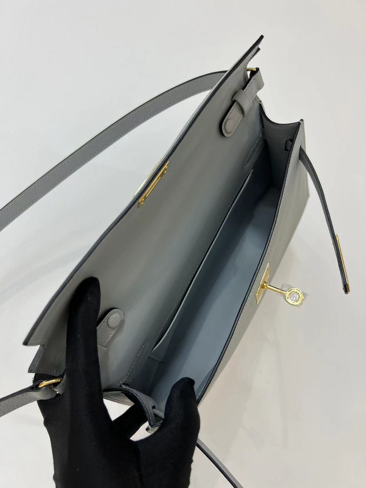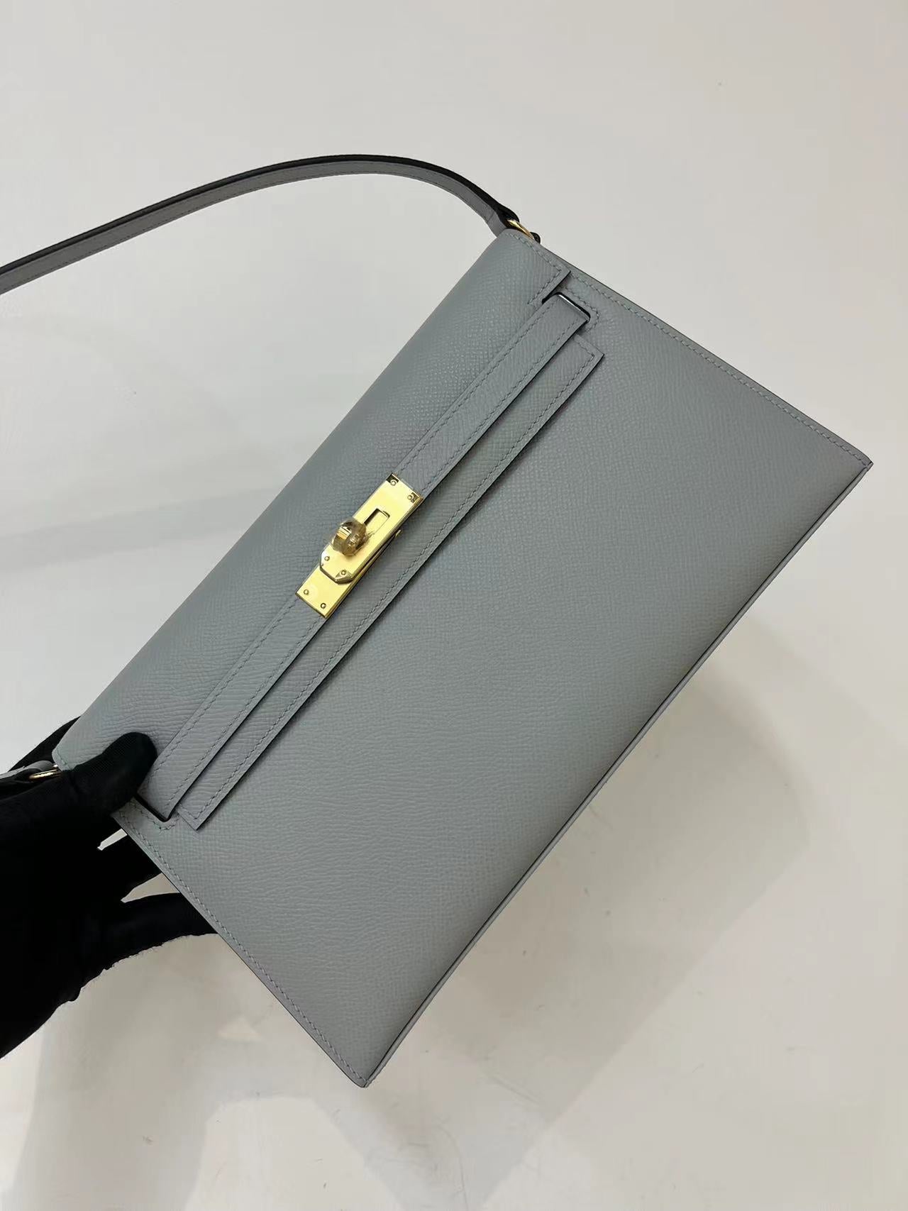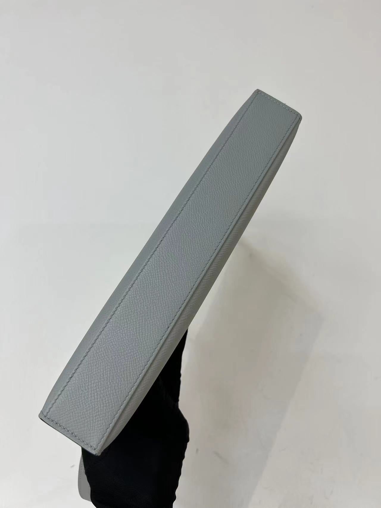 Discover the elegance of the Kelly Elan Clutch Bag, an exquisite evening piece that combines practicality with sophistication. Crafted from premium Epsom palm print leather, this stunning underarm bag features a serene linen blue hue and pure steel hardware for a chic finish. Hand-sewn with meticulous attention to detail using thick French wax thread, this clutch reflects artisanal quality and style.