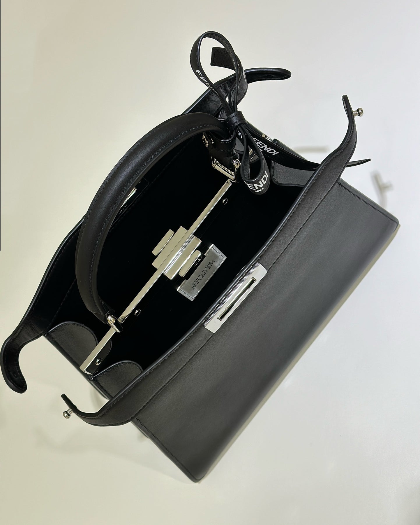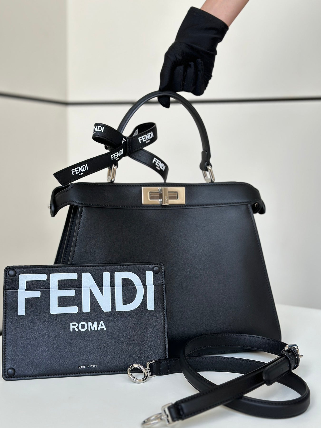 Discover the exclusive Fendi by Marc Jacobs Peekaboo Capsule Collection, arriving soon. Crafted from high-quality imported cowhide, this handbag features a unique logo bow decoration on the handle, adding a distinctive touch to its design. Lightweight yet spacious, the bag offers ample interior capacity for your essentials. Perfectly versatile, it's an ideal accessory for fashion-forward individuals. Dimensions: 33 cm x 13 cm x 25 cm. Style Number: 80142.