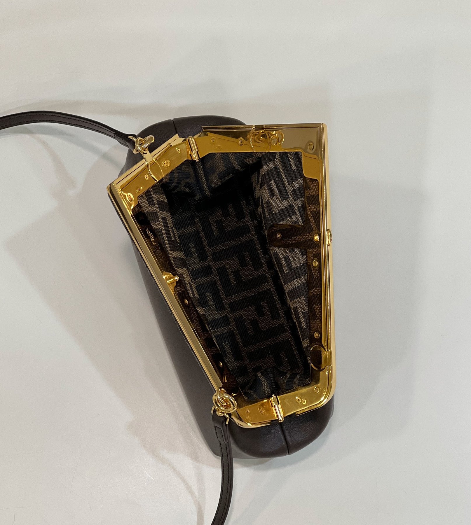 Introducing the Fendi First Series Handbag, a stylish fusion of innovation and elegance. This distinctive piece features the iconic letter "F" as its design centerpiece, complemented by a chic diagonal frame outline. Its unique asymmetric shape adds a modern twist, making it a fashionable accessory for any occasion.