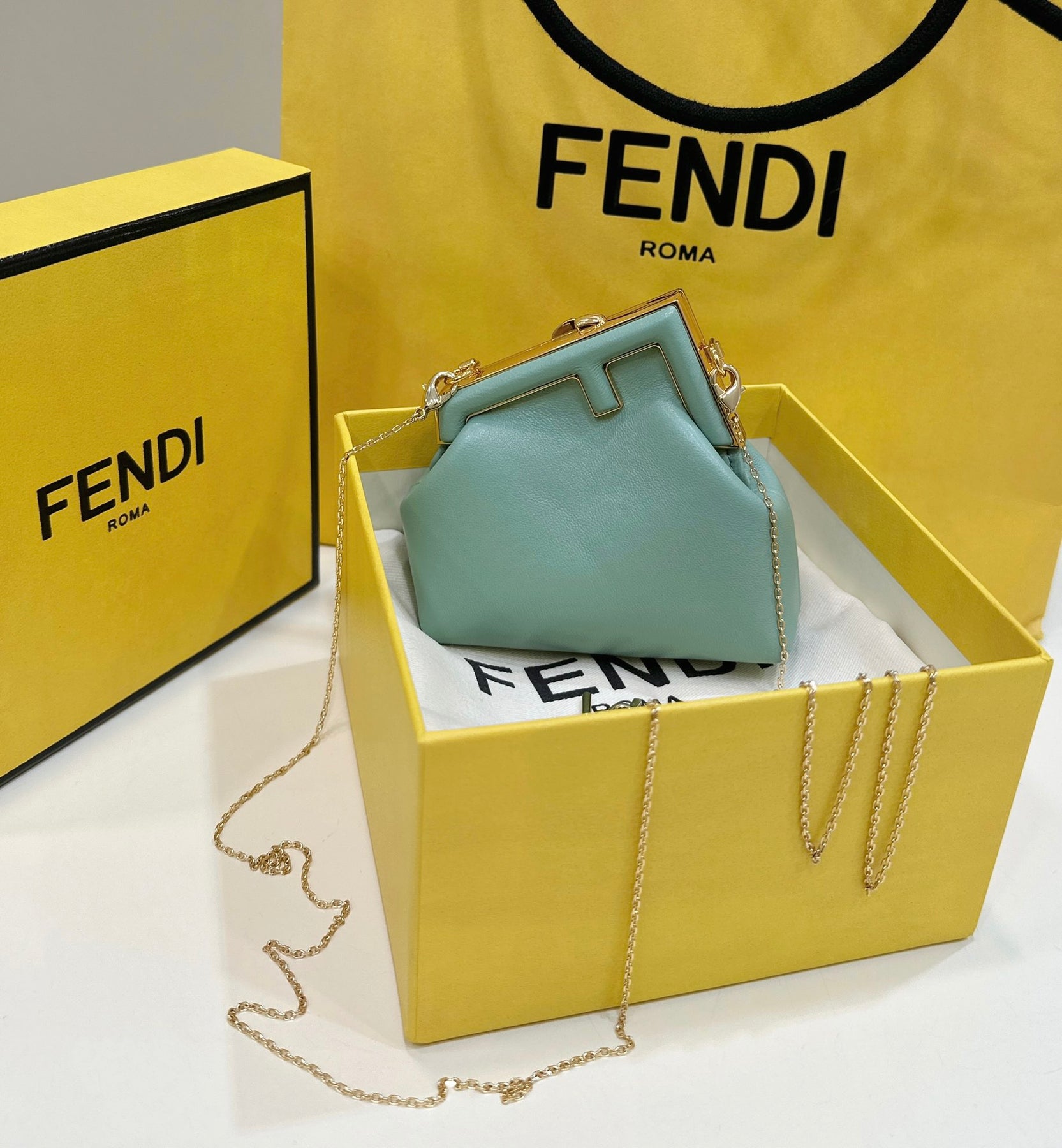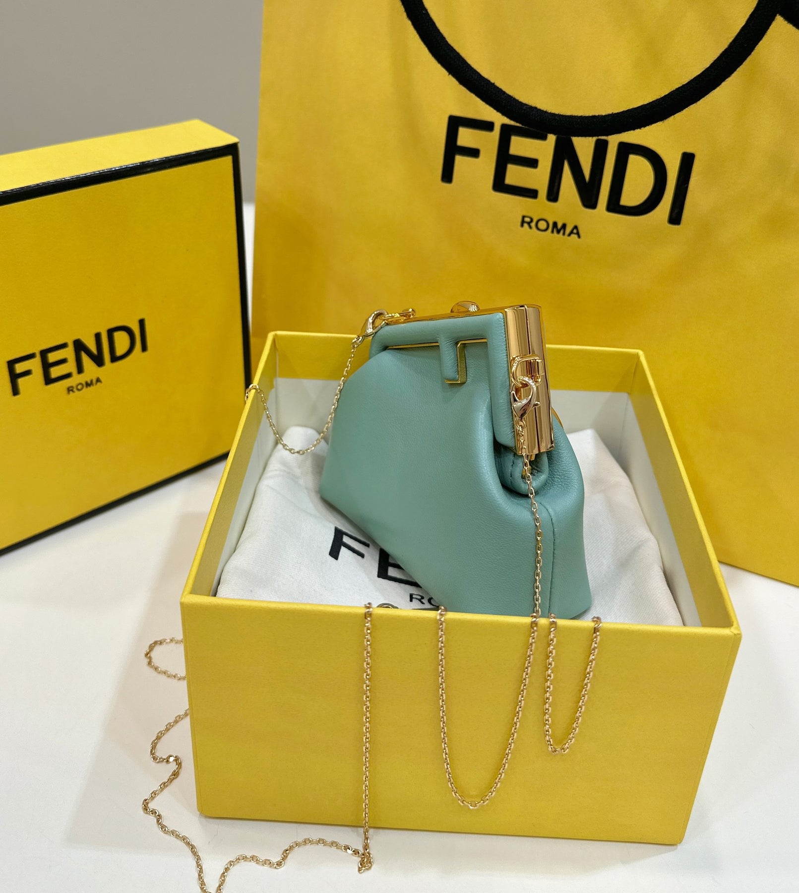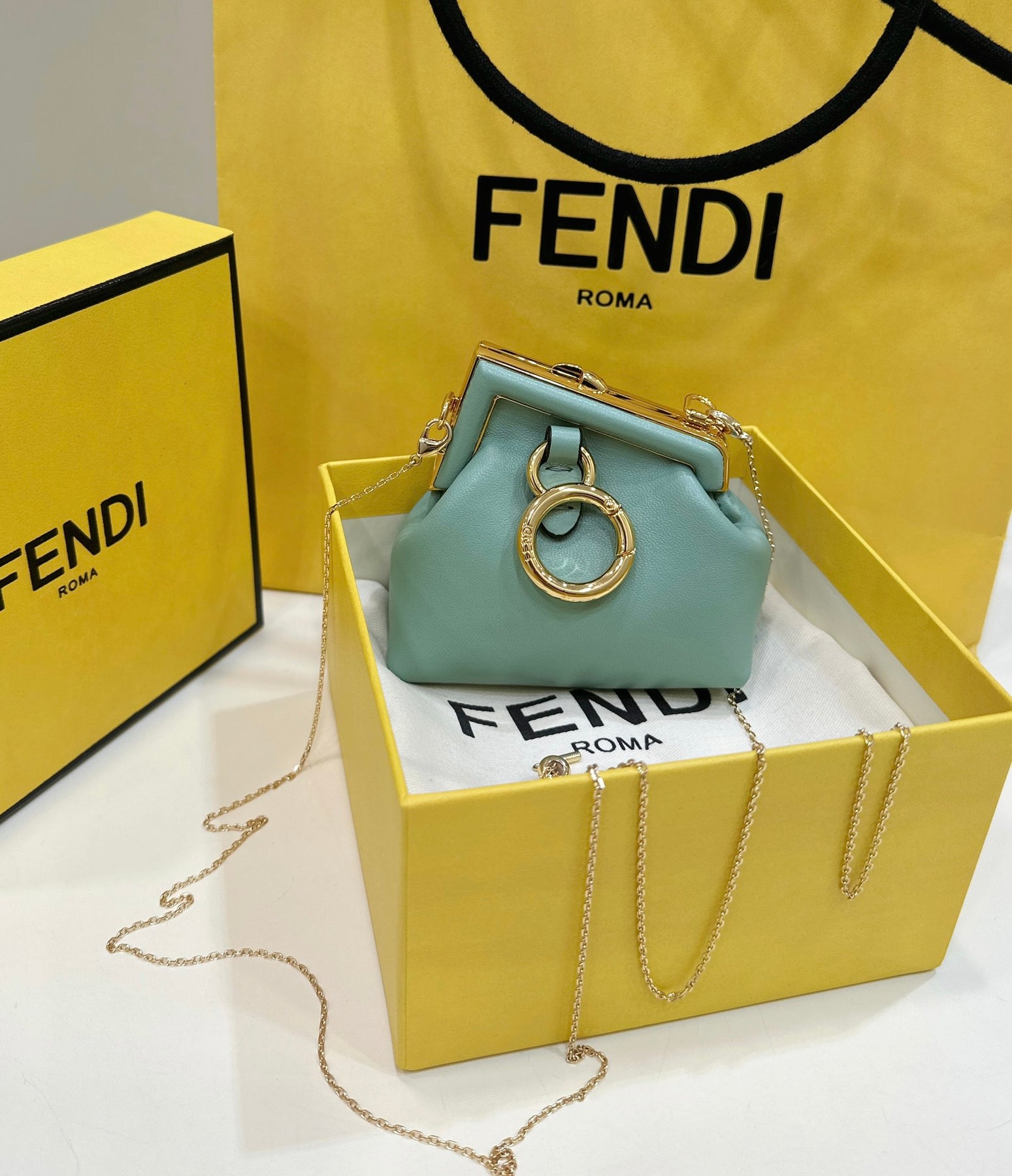 Introducing the Fendi First Series Handbag, a stunning blend of innovation and elegance. Featuring the iconic letter "F" in its unique diagonal frame design, this handbag stands out with its fashionable asymmetric shape. Versatile and stylish, it can be carried as a handbag or converted into a shoulder bag using the detachable wide shoulder strap, allowing for effortless transitions. Crafted from soft leather, this handbag offers a luxurious feel that's highly recommended by celebrities. Its dimensions of 11.5 x 5.5 x 10 cm make it the perfect size for all your essentials. Elevate your style with this multi-functional accessory that is truly worth owning.