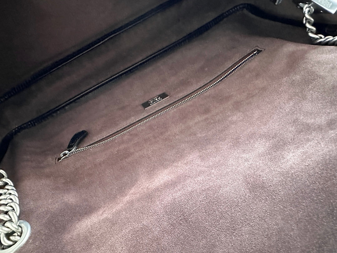 Introducing the Fendi Iconic Large Baguette Chain Handbag, a statement piece crafted from luxurious soft calfskin. This elegant handbag features a delicate feel, complemented by a beautiful suede lining that enhances its luster and texture.