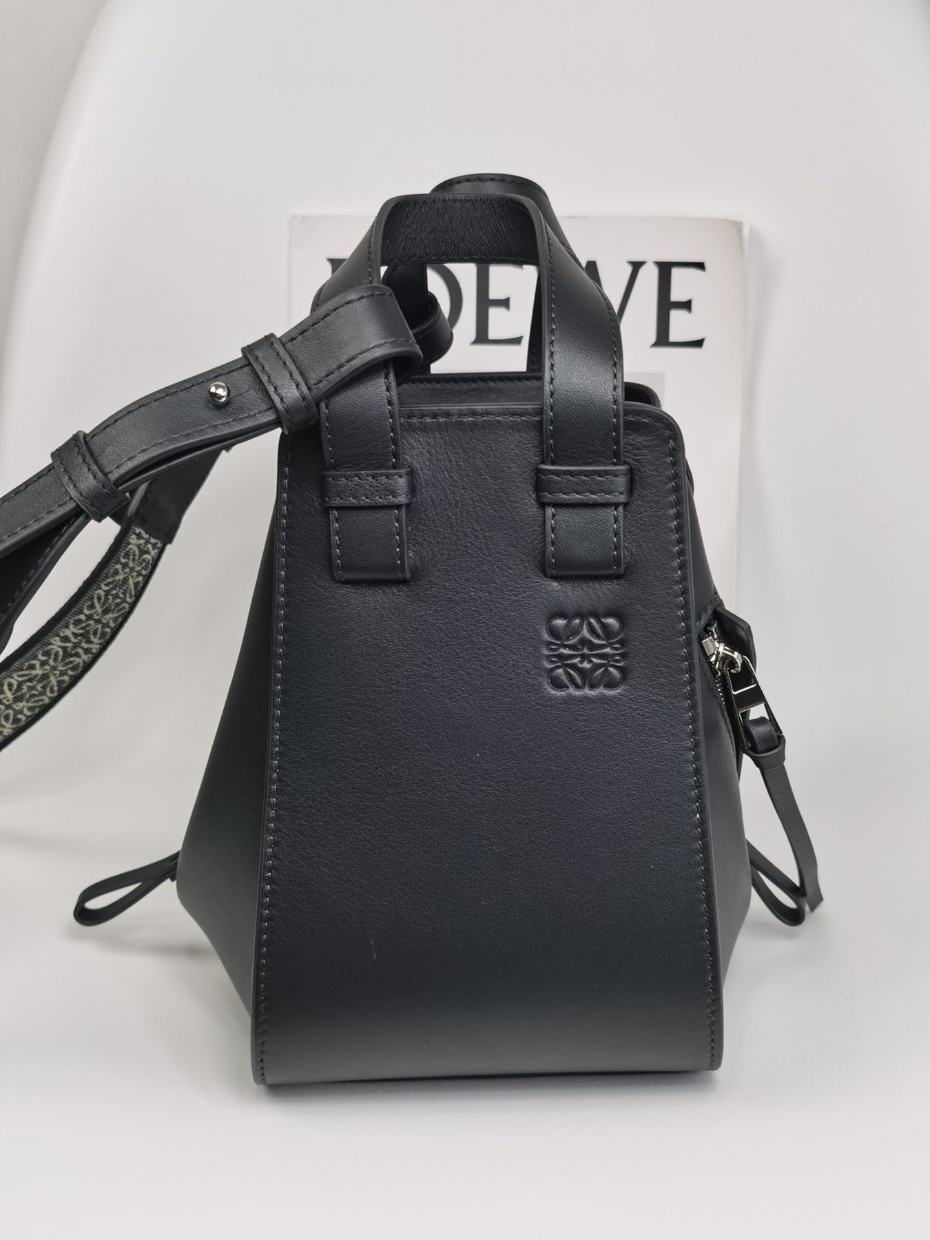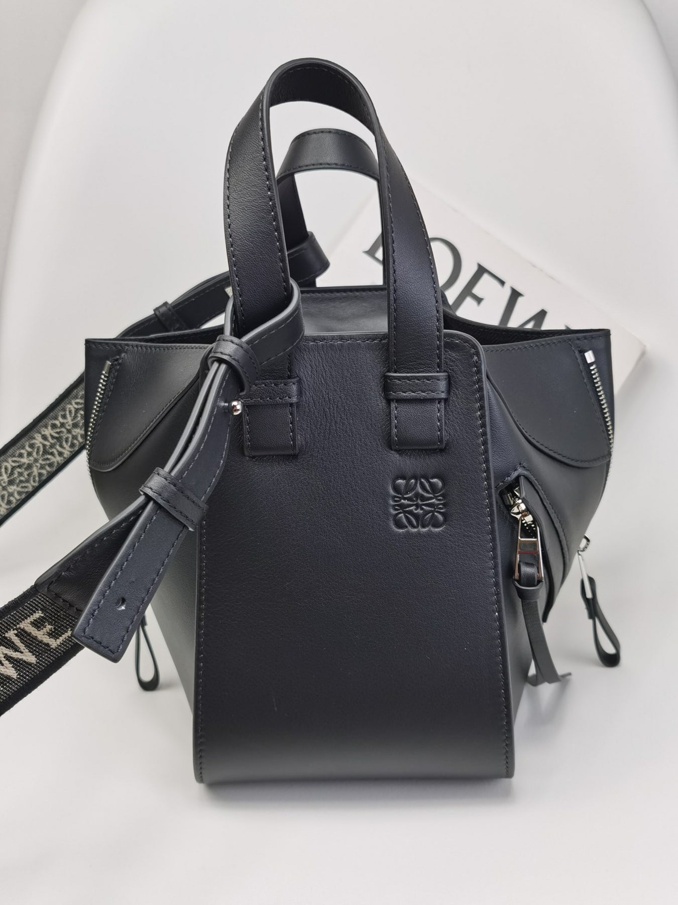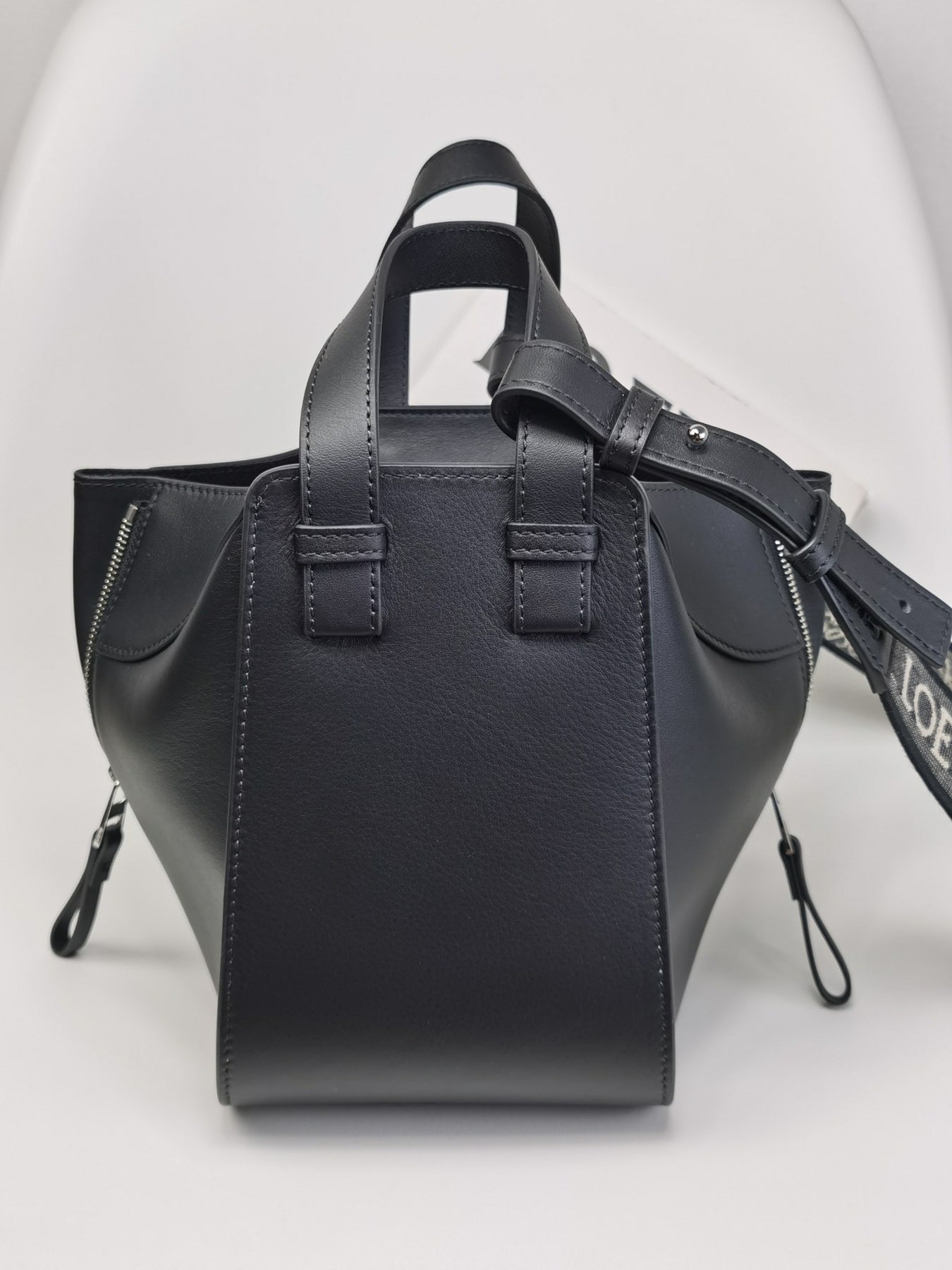 Introducing the Genuine Leather Hammock Bag, a sophisticated blend of style and functionality. Crafted from premium satin calfskin in an elegant black hue, this versatile bag transforms effortlessly, thanks to its soft side panels that adjust to your needs.