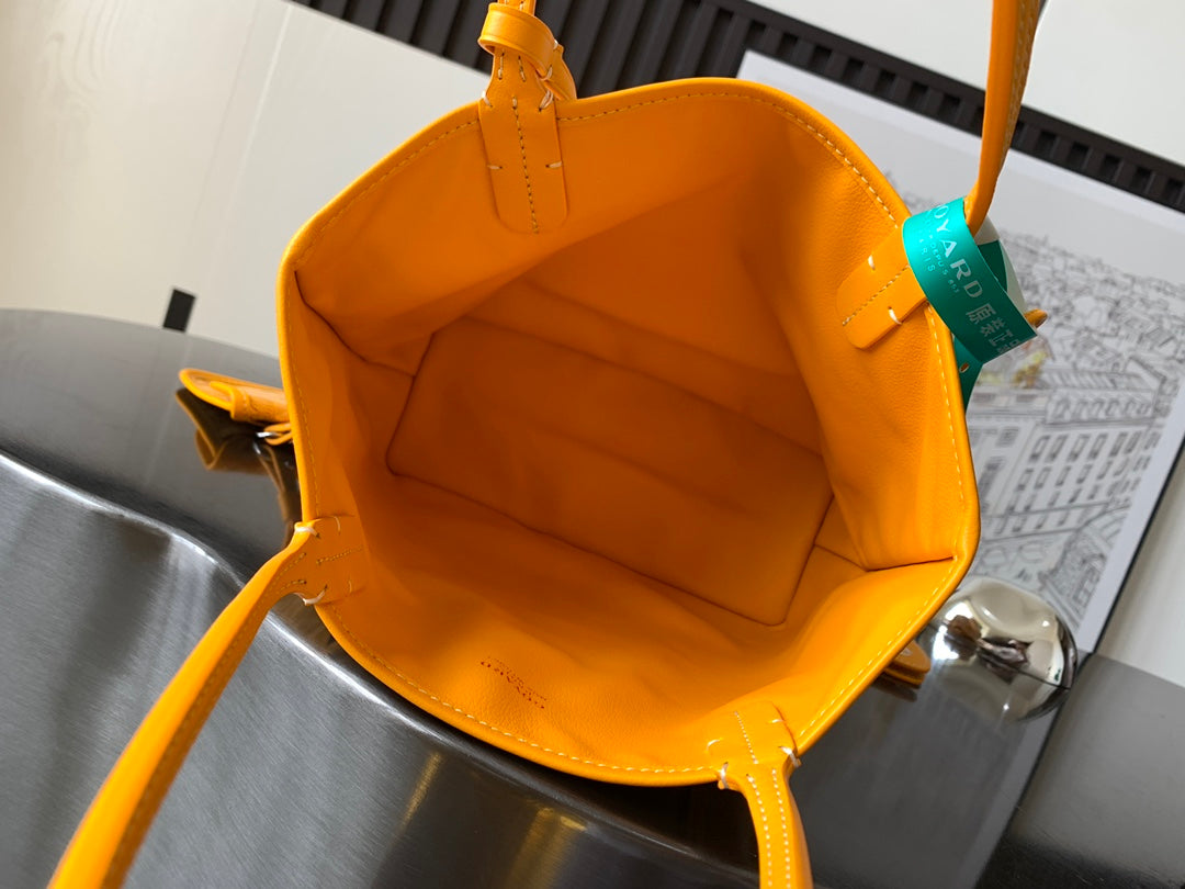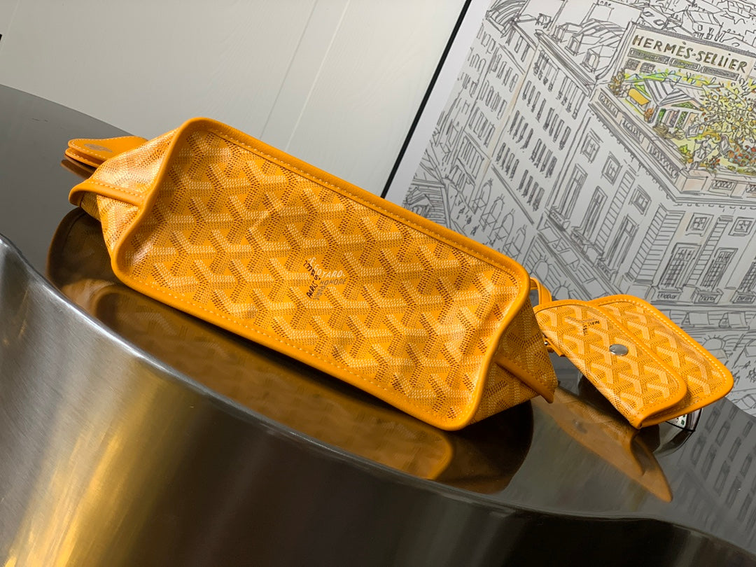 Introducing the Goyard Anjou Mini Shopping Bag in Yellow, featuring a charming French Bulldog silk screen design. Crafted from premium leather and lined with Goyardine canvas, this versatile mini bag embodies elegance and practicality. Its uniquely structured handle offers a comfortable grip, making it perfect for day or evening use. With dimensions of 20 cm x 10 cm x 20 cm, the Anjou Mini is your go-to accessory for carrying daily essentials or adding a stylish flair to your nighttime outings. Each bag comes with full packaging, ensuring a delightful unboxing experience. Elevate your accessory game with this iconic piece!