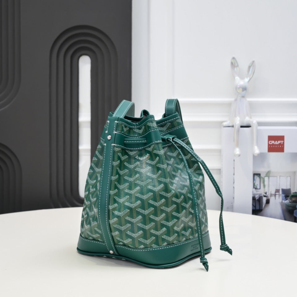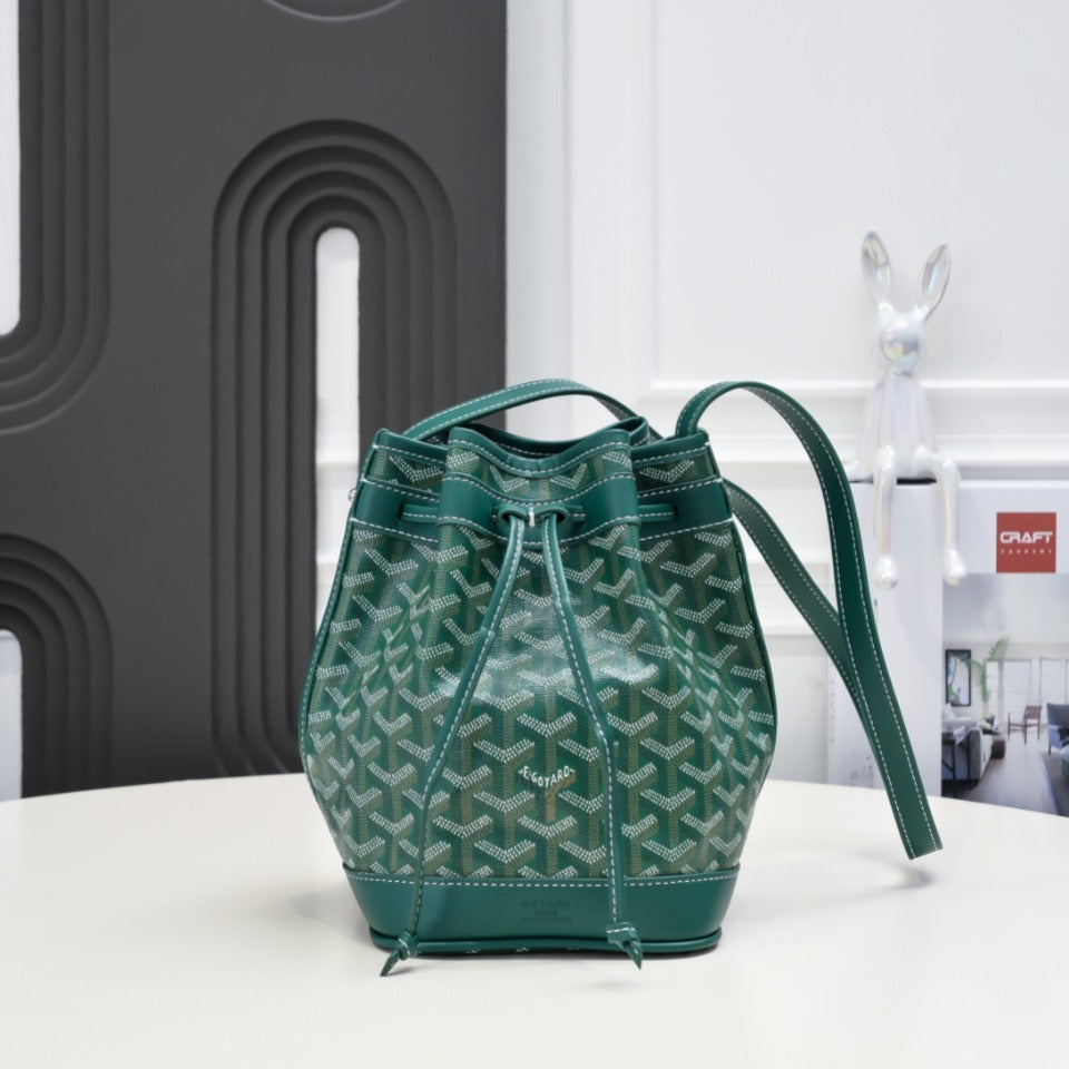 Discover the Green Goyard Tit Flot Bucket Bag, a stylish and functional accessory for any occasion. This factory-direct bucket bag features a unique modular design, allowing for versatile carrying options thanks to its innovative shoulder strap system. With three adjustable strap lengths, you can easily switch between a short shoulder strap, single shoulder carry, and crossbody styles.