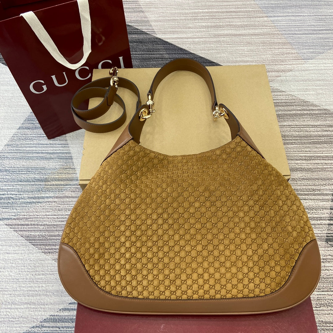 Discover the exquisite Gucci GG Double Lock Handbag, a stunning blend of vintage charm and contemporary style. This elegant shoulder bag, inspired by the brand's archival designs from the 1950s, is crafted from luxurious soft suede, ensuring both durability and a sophisticated look.