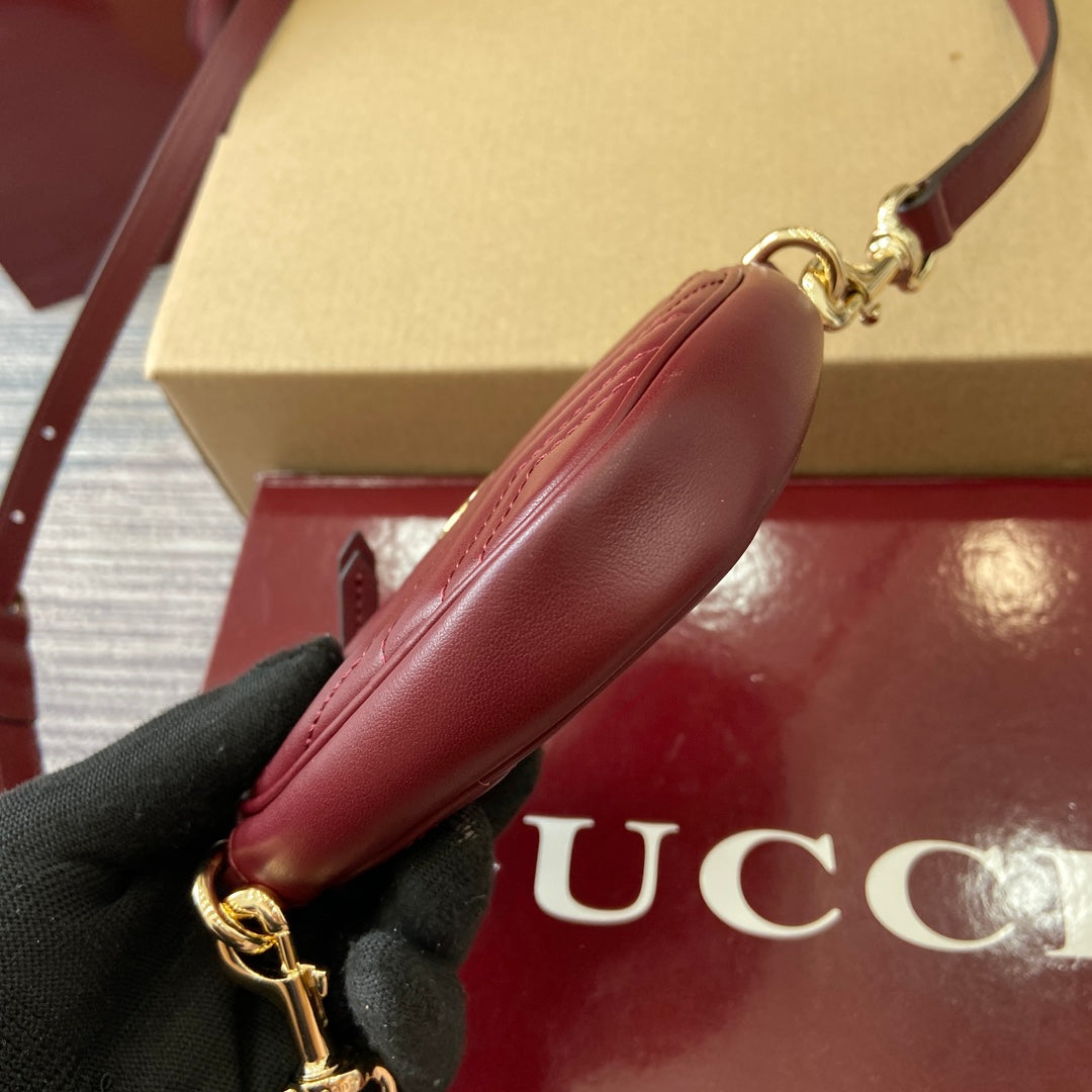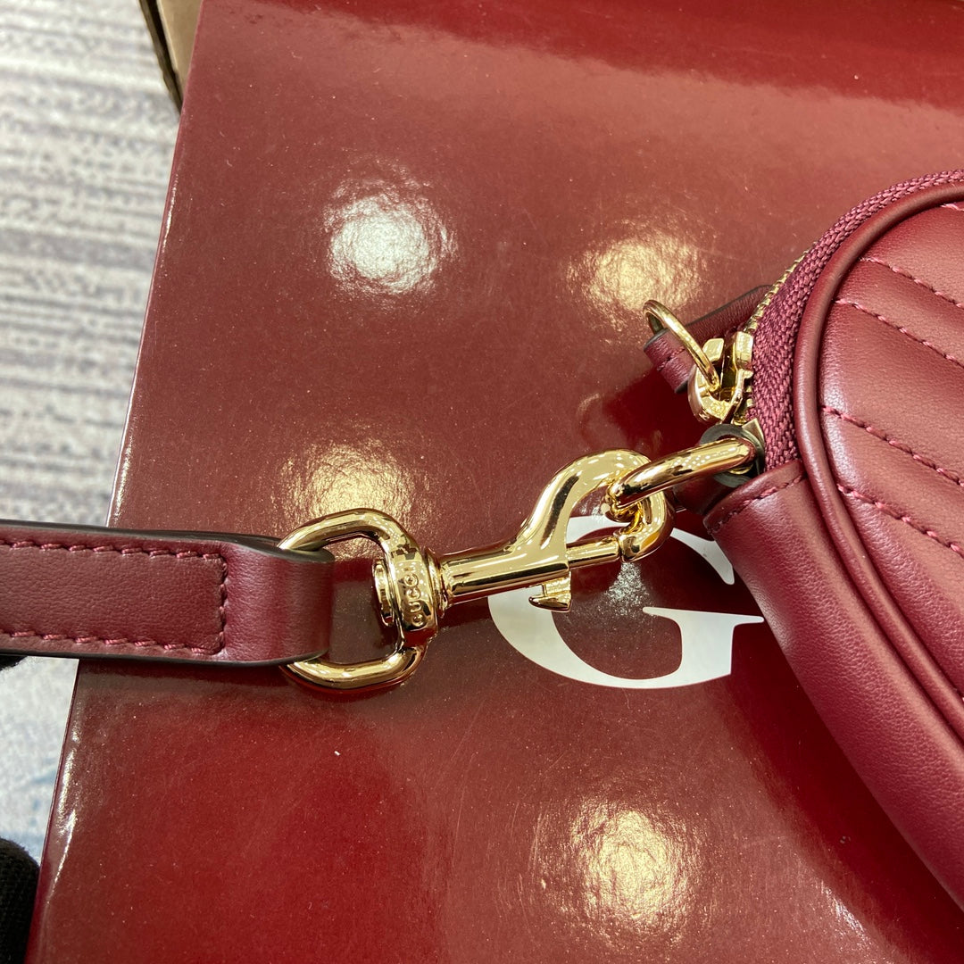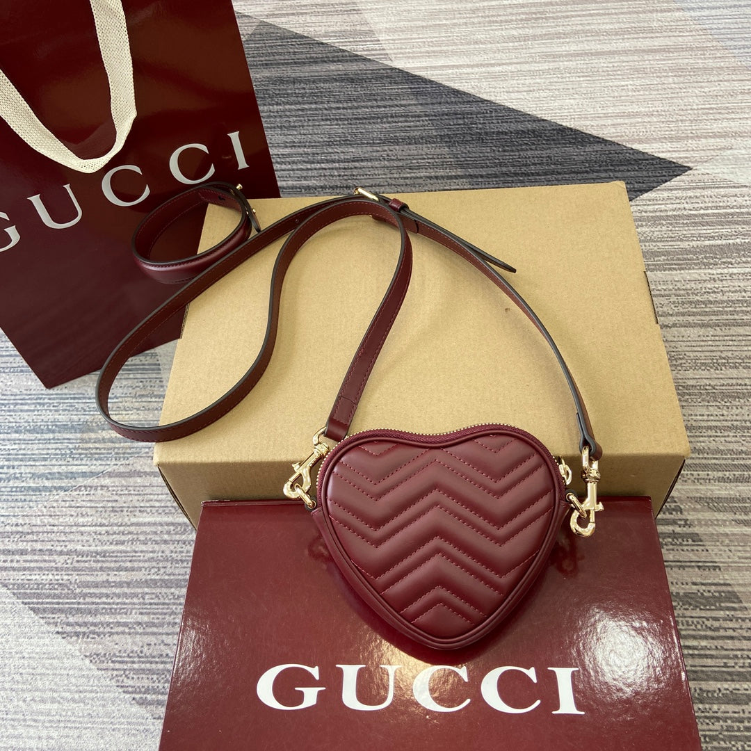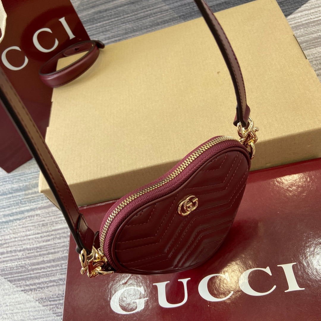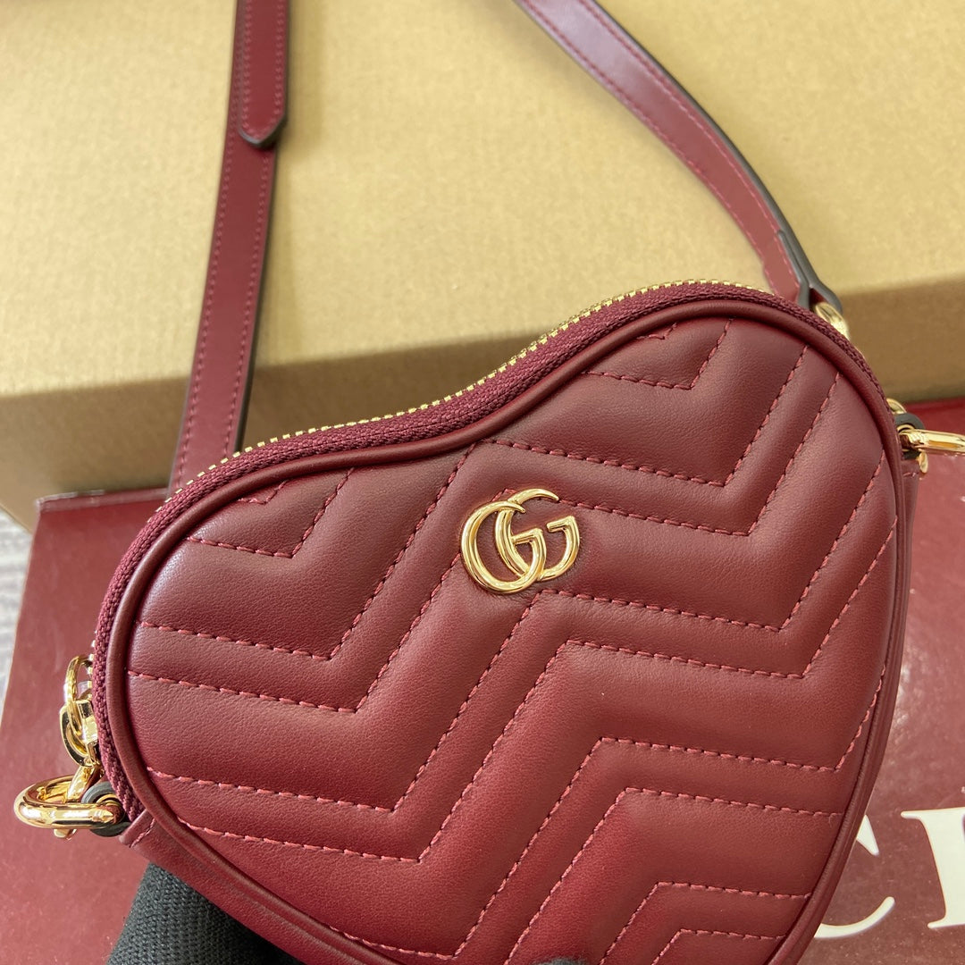 Introducing the Gucci GG Marmont Mini Handbag in a stunning Anchor Red hue. This chic handbag features a charming heart-shaped silhouette, meticulously crafted from soft black V-shaped Matelassé cow leather. Its compact design is elegantly complemented by iconic light gold Double G hardware.