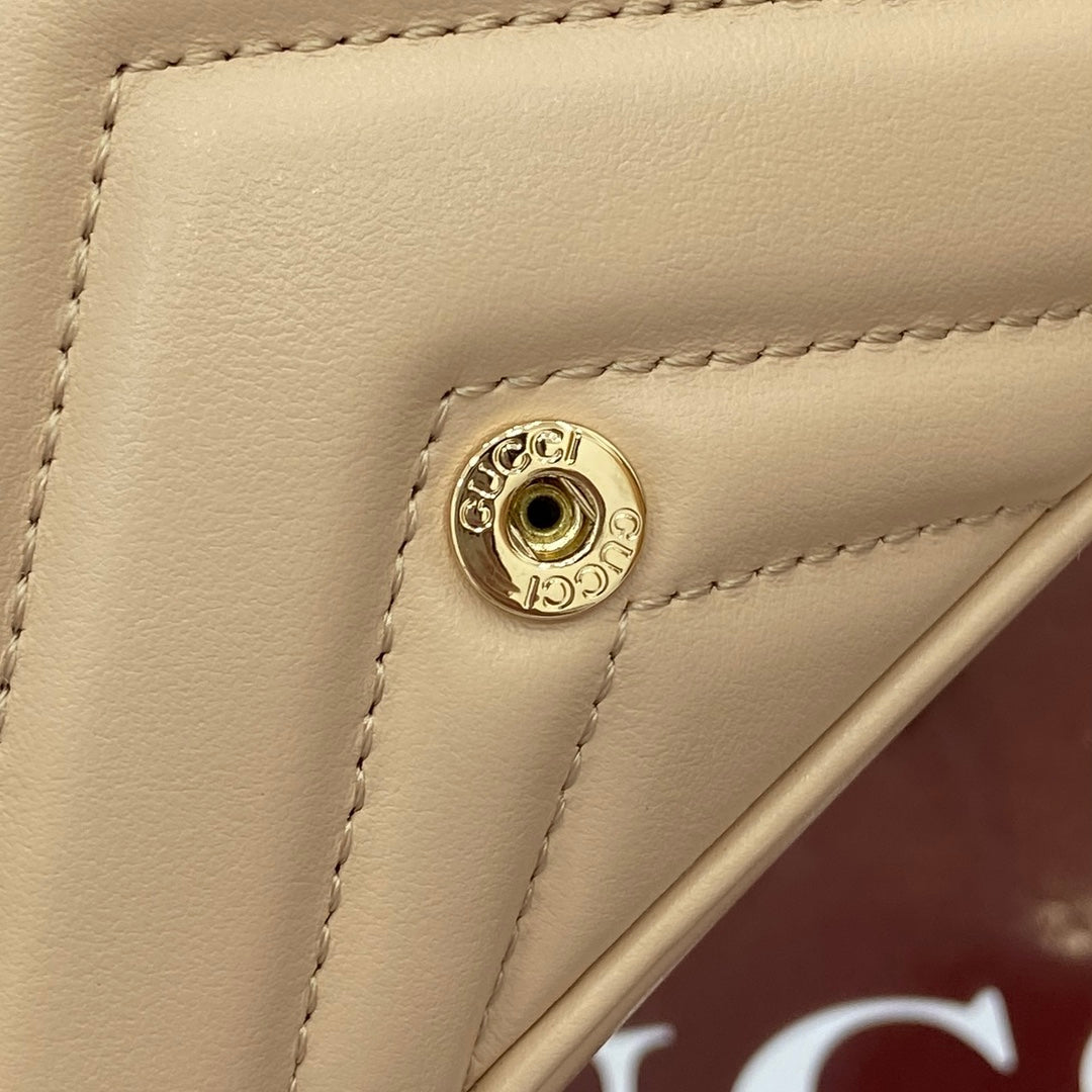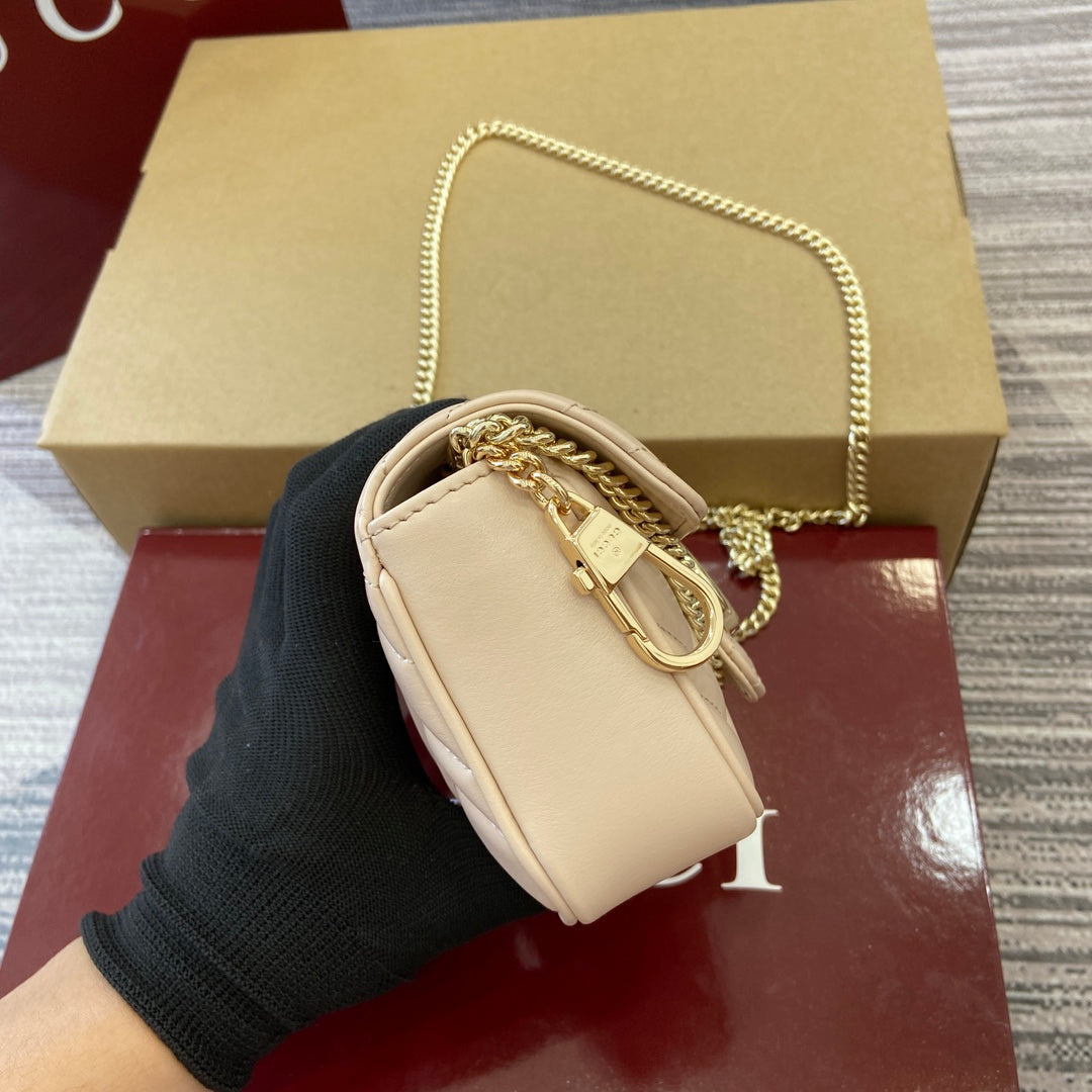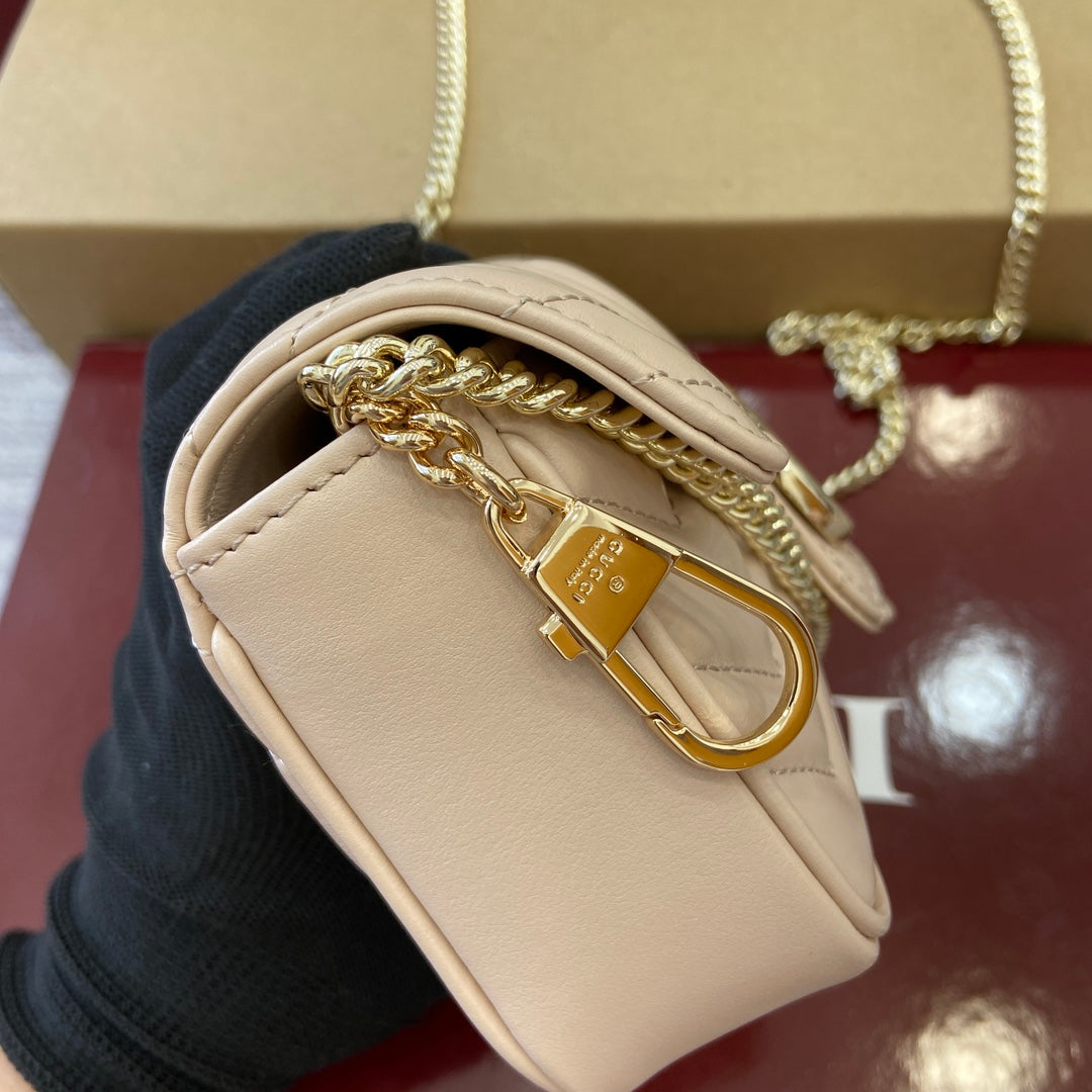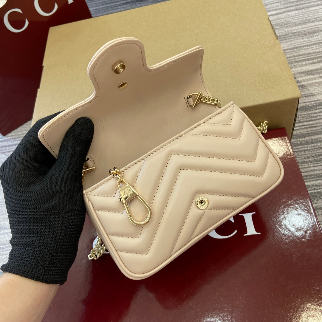 Introducing the Gucci GG Marmont Super Mini Handbag, a stunning piece from the 2025 early spring collection. Meticulously handmade from genuine quilted V-shaped leather, this handbag showcases a sophisticated light pink hue that adds a touch of elegance to any outfit. Featuring the iconic Double G hardware, a nod to Gucci's heritage from the 1970s, this handbag is both a classic and a contemporary statement piece.