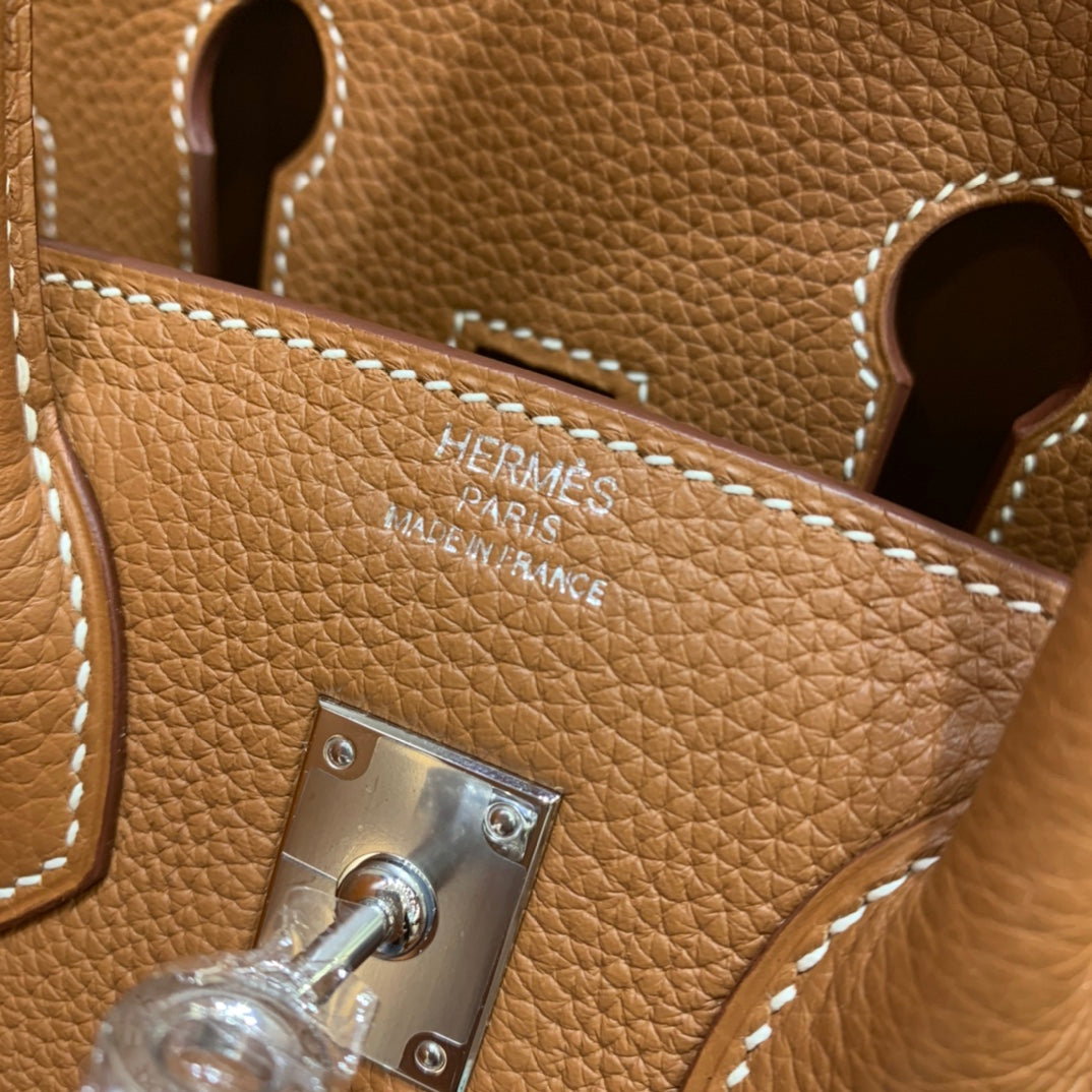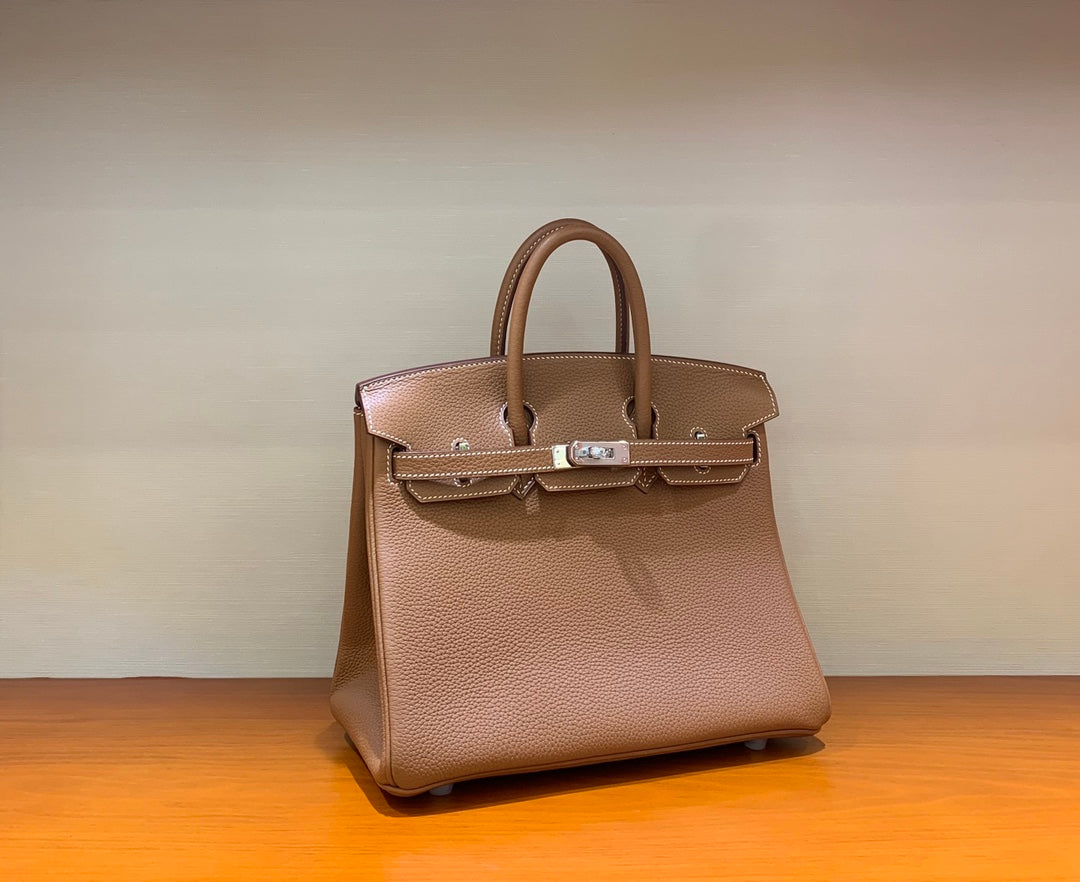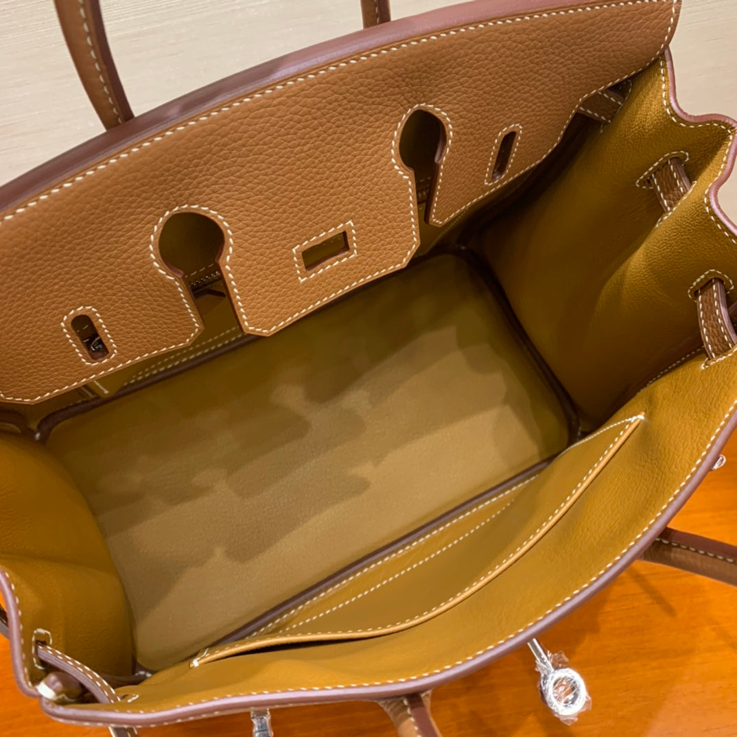 Discover the elegance of our Hand-Stitched Beeswax Leather Birkin 25cm Togo. Crafted with premium imported leather, this luxurious bag features a sophisticated golden brown hue complemented by gold and silver buckles. Each piece is meticulously crafted by hand, ensuring exceptional quality and attention to detail. Elevate your style with this timeless accessory, now in stock and ready for you to embrace.