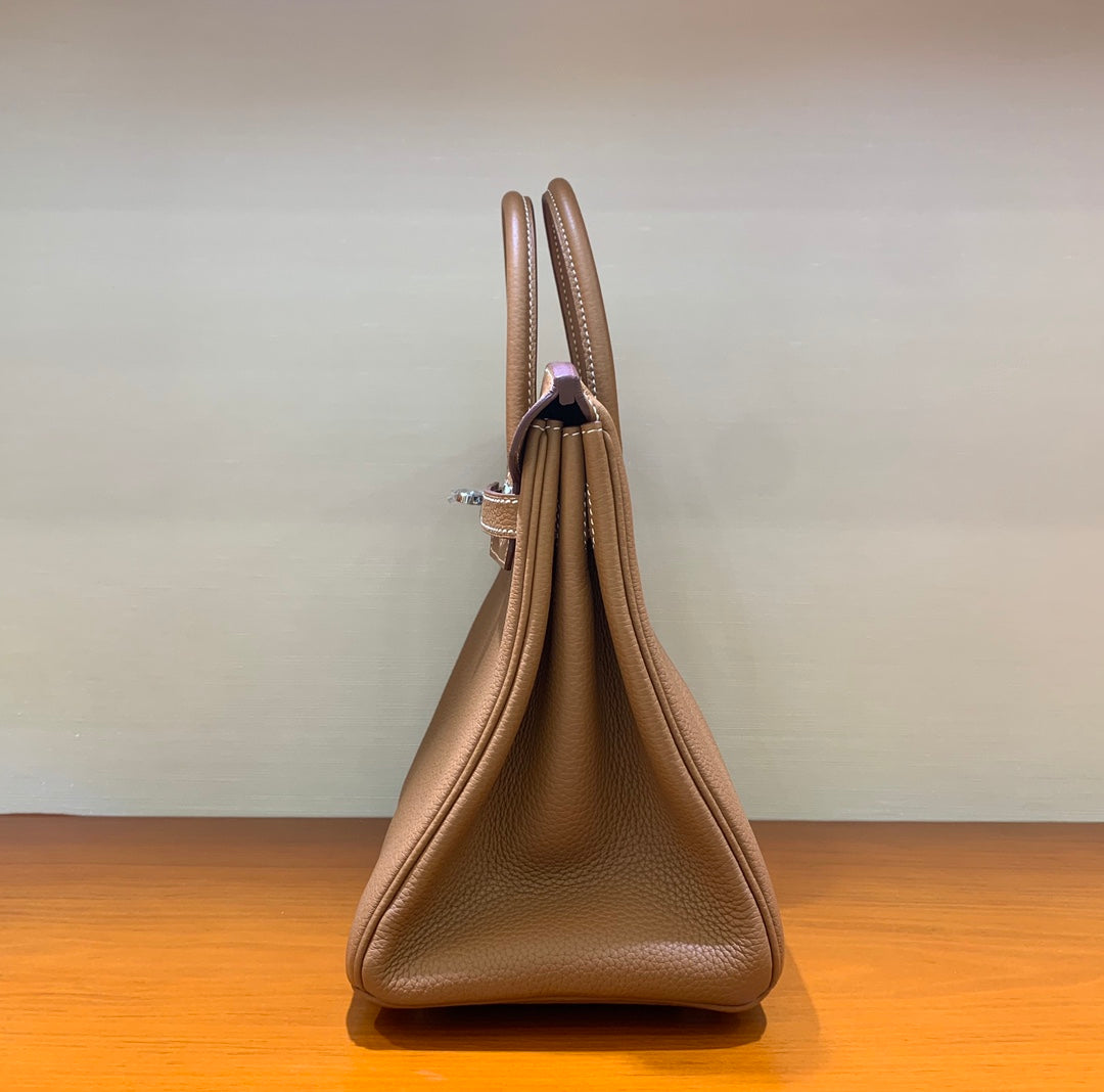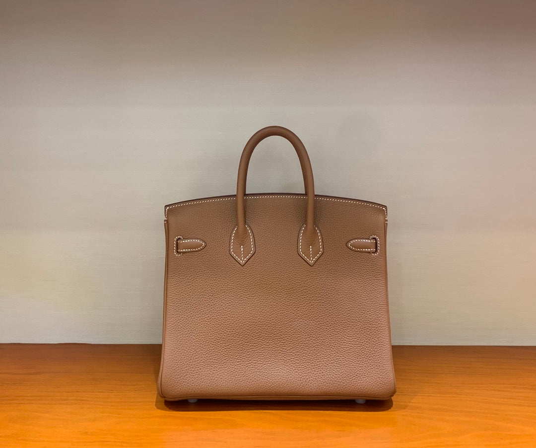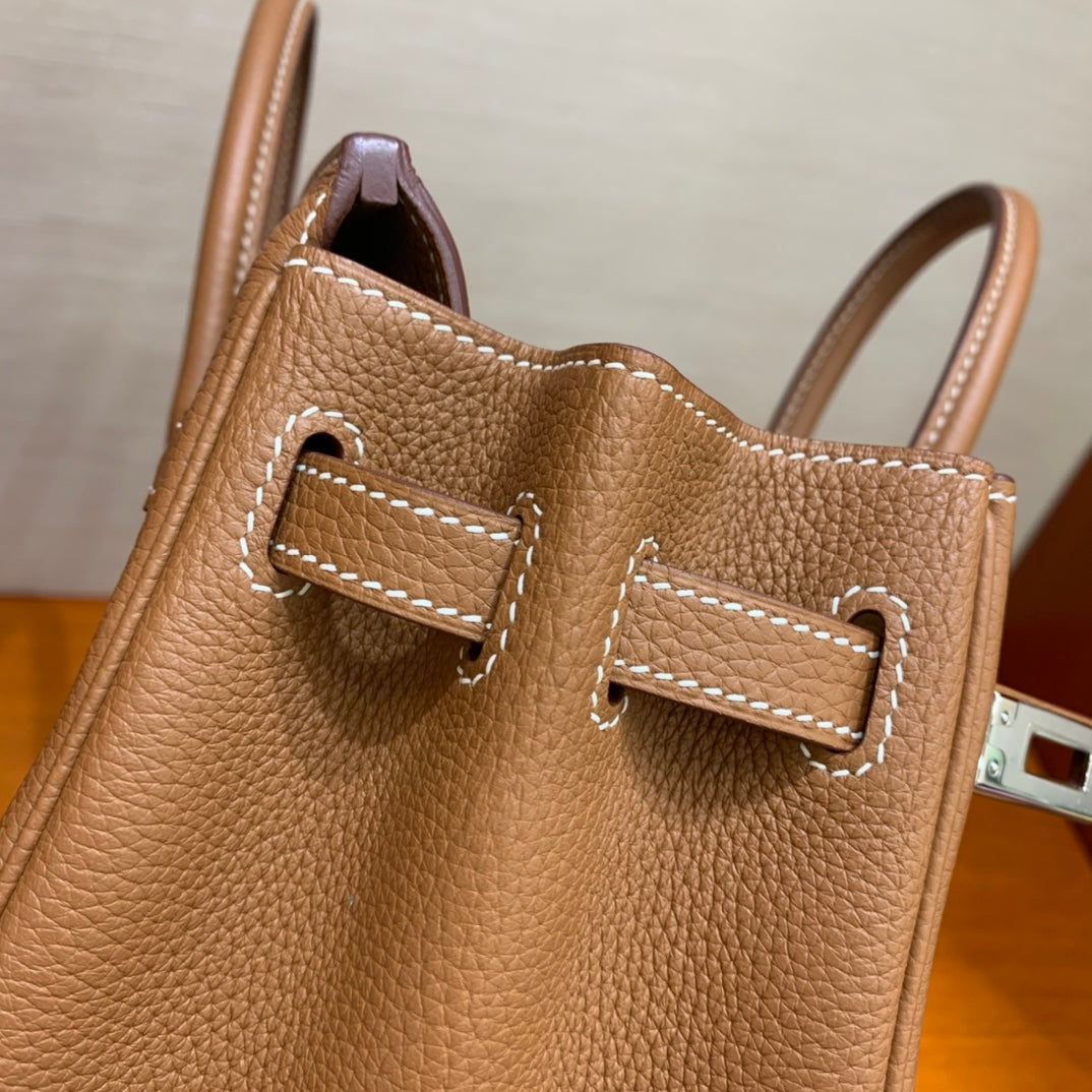 Discover the elegance of our Hand-Stitched Beeswax Leather Birkin 25cm Togo. Crafted with premium imported leather, this luxurious bag features a sophisticated golden brown hue complemented by gold and silver buckles. Each piece is meticulously crafted by hand, ensuring exceptional quality and attention to detail. Elevate your style with this timeless accessory, now in stock and ready for you to embrace.