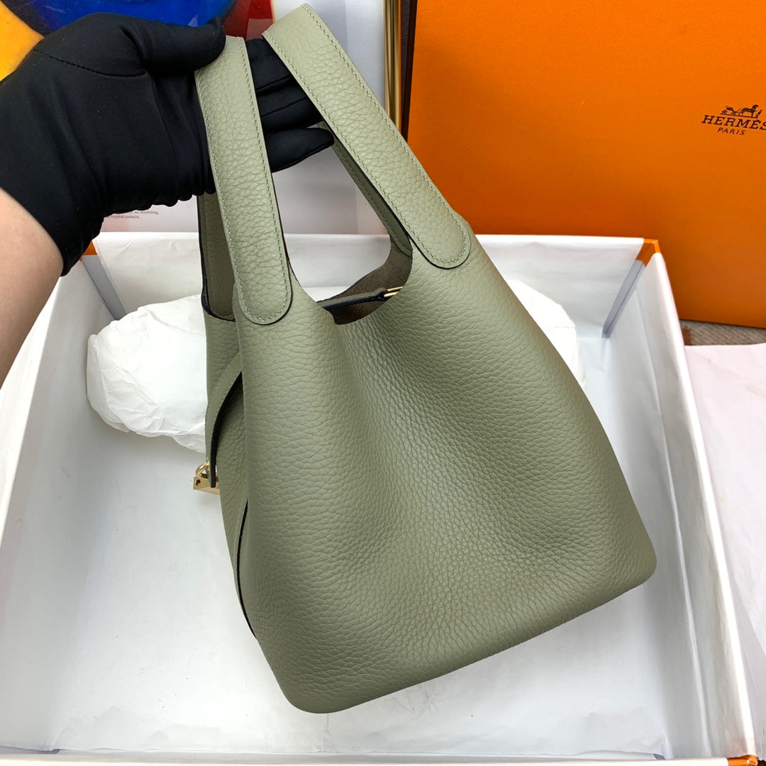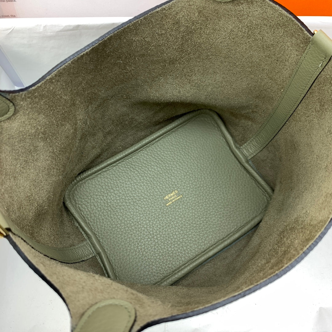 Introducing our exquisite Picotin Lock Basket, a special order crafted with care. Measuring 18cm, this stunning piece features a rich sage green color complemented by a luxurious gold buckle. Hand-sewn with beeswax thread, it utilizes premium vegetable-tanned leather, ensuring durability and style. Perfect for carrying your essentials or enhancing your home décor, this unique basket exudes sophisticated charm. Elevate your collection with this one-of-a-kind accessory today!