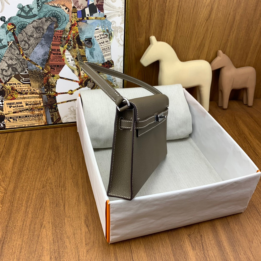 Discover the elegance of the Semi-Handmade Beeswax Suture ZP Version Kelly Elan Goatskin Armpit Bag, featuring a sophisticated 27cm design in a stunning elephant gray with a striking silver buckle. This stylish accessory represents the essence of the Kelly family, perfectly blending function and beauty.