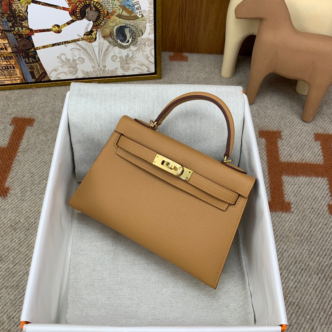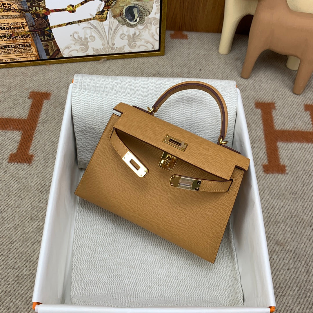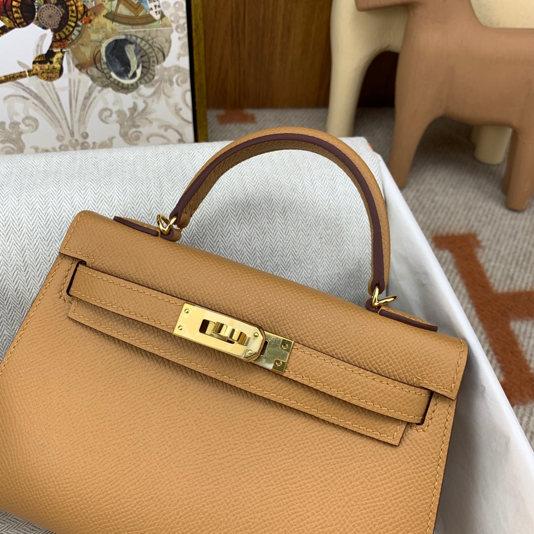 Discover the elegance of the fully handmade Minikelly, now available in stock! This second-generation design features a compact 19cm size crafted from luxurious chevre leather in a sophisticated biscuit color. With its perfect blend of practicality and fashion, this stylish small bag is designed to elevate any outfit, achieving a unique balance of refinement and modern trendiness. Upgrade your accessory collection with this exquisite piece today!