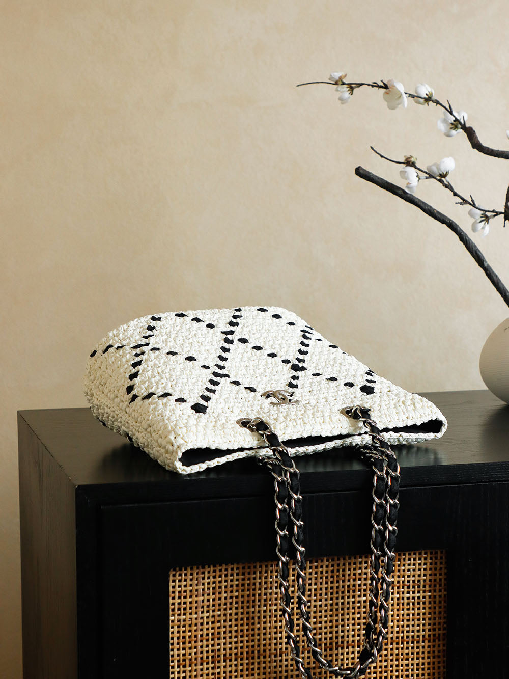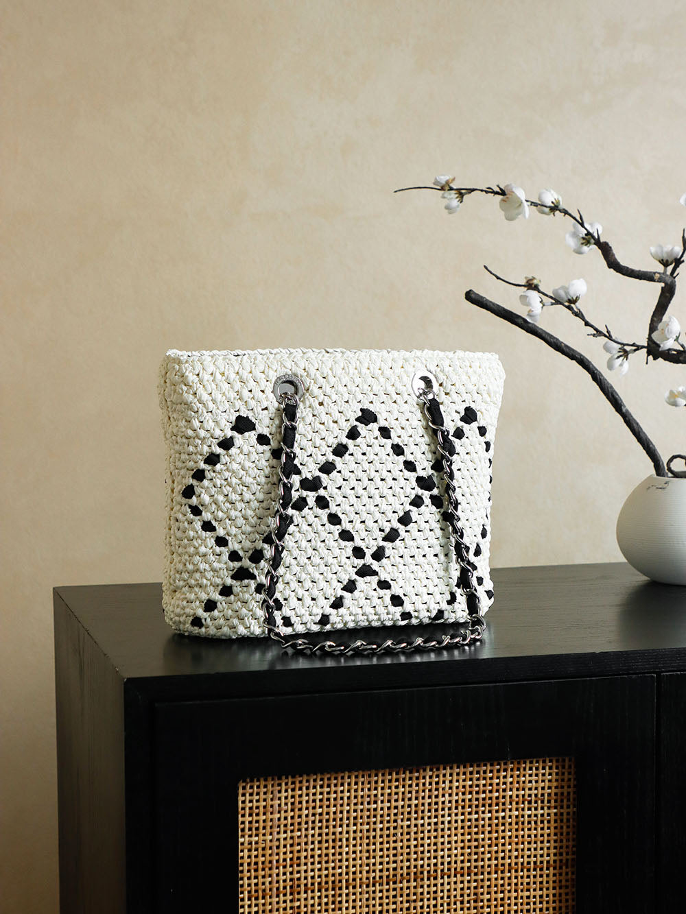 Embrace the essence of summer with our artisanal woven shopping bag from the Early Spring Vacation Collection. Available in four vibrant colors, this bag is expertly crafted from a blend of raffia and rattan, bringing a festive touch to any outing. Perfectly sized for various occasions, choose from two options: Small (32 x 23 x 14 cm) and Large (41 x 27 x 15 cm). Adorned with elegant jewelry embellishments, this bag is the ideal companion for dinner parties or casual beach days. Elevate your accessory game and make a statement this season with our unique, handmade bags.