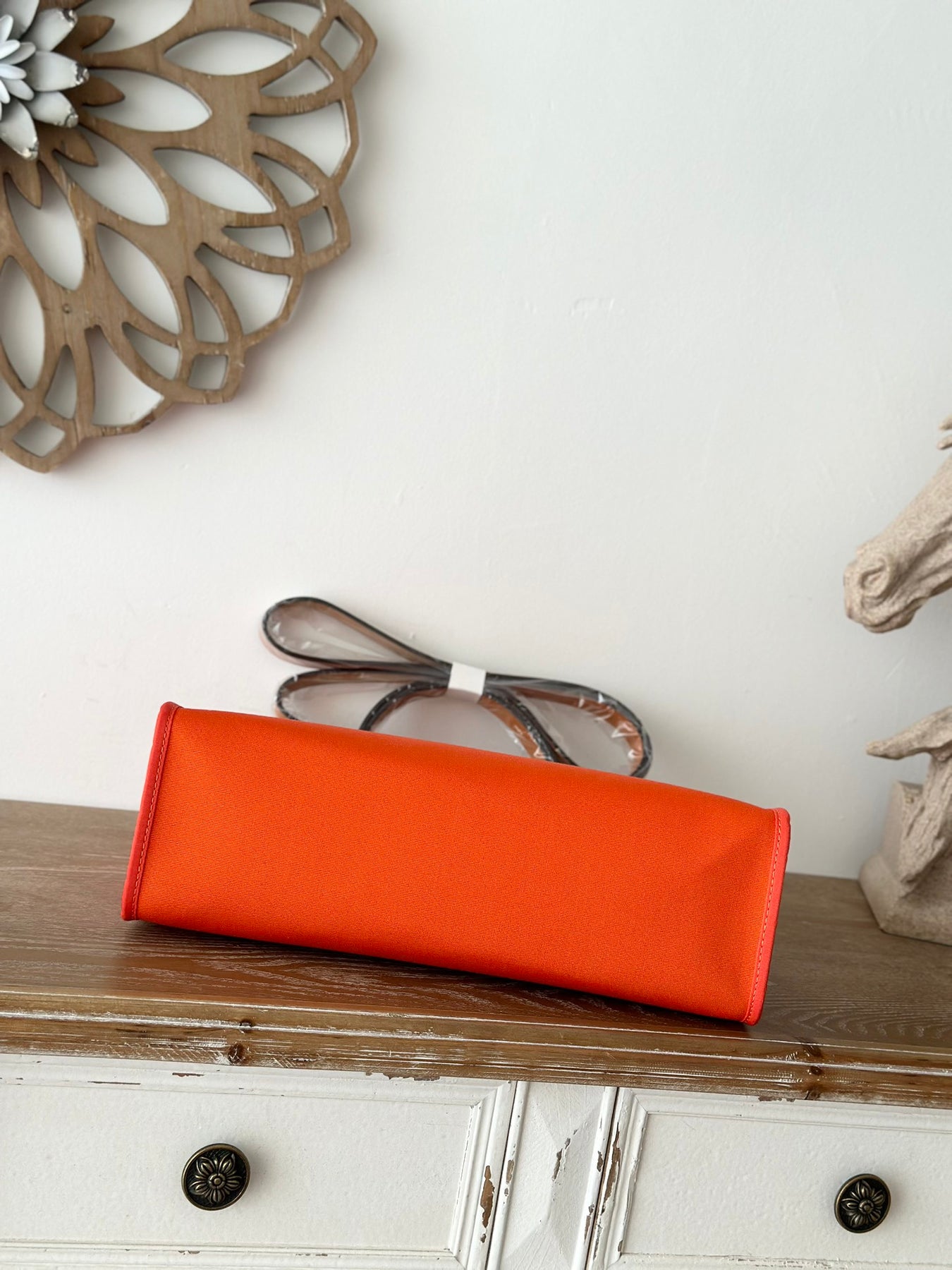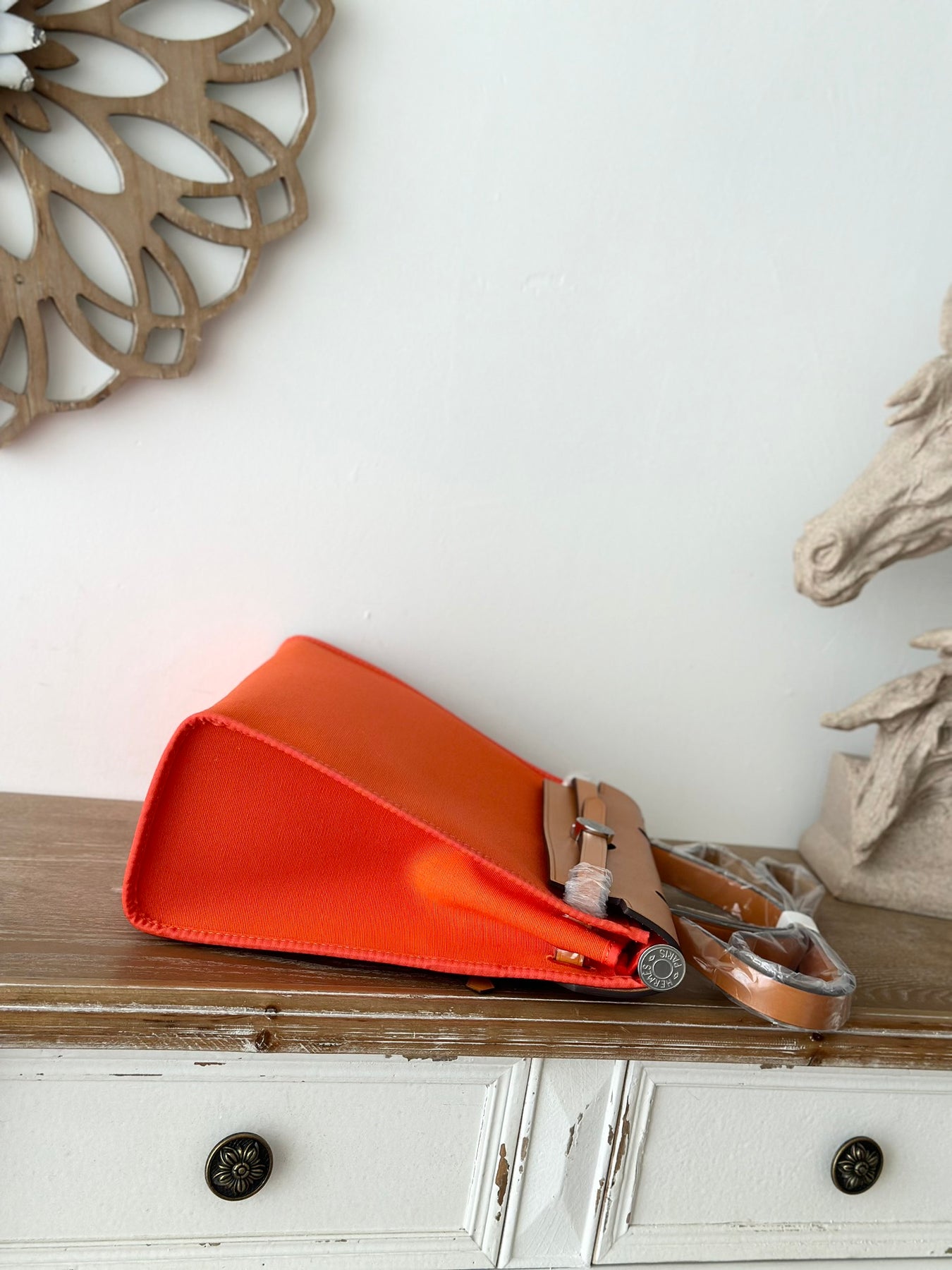 Introducing the latest, fully handcrafted version of the Hermès Herbag, now available in a striking orange and medium brown colorway, complete with a silver buckle. This iconic "it bag" represents the pinnacle of luxury and style, perfectly blending practicality with a serene, understated elegance.