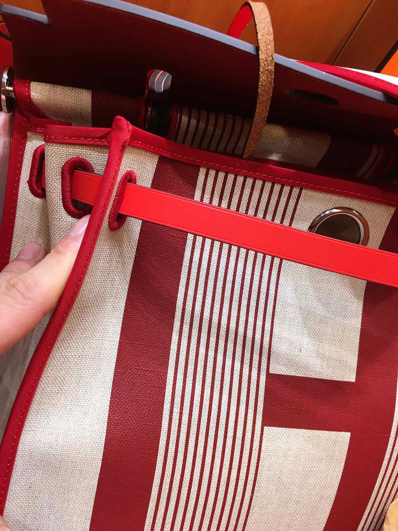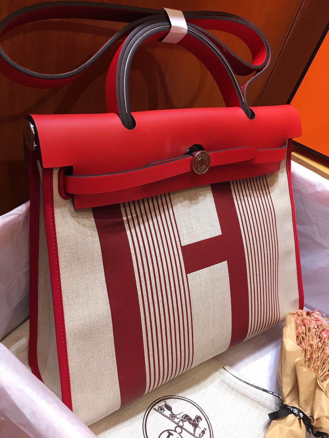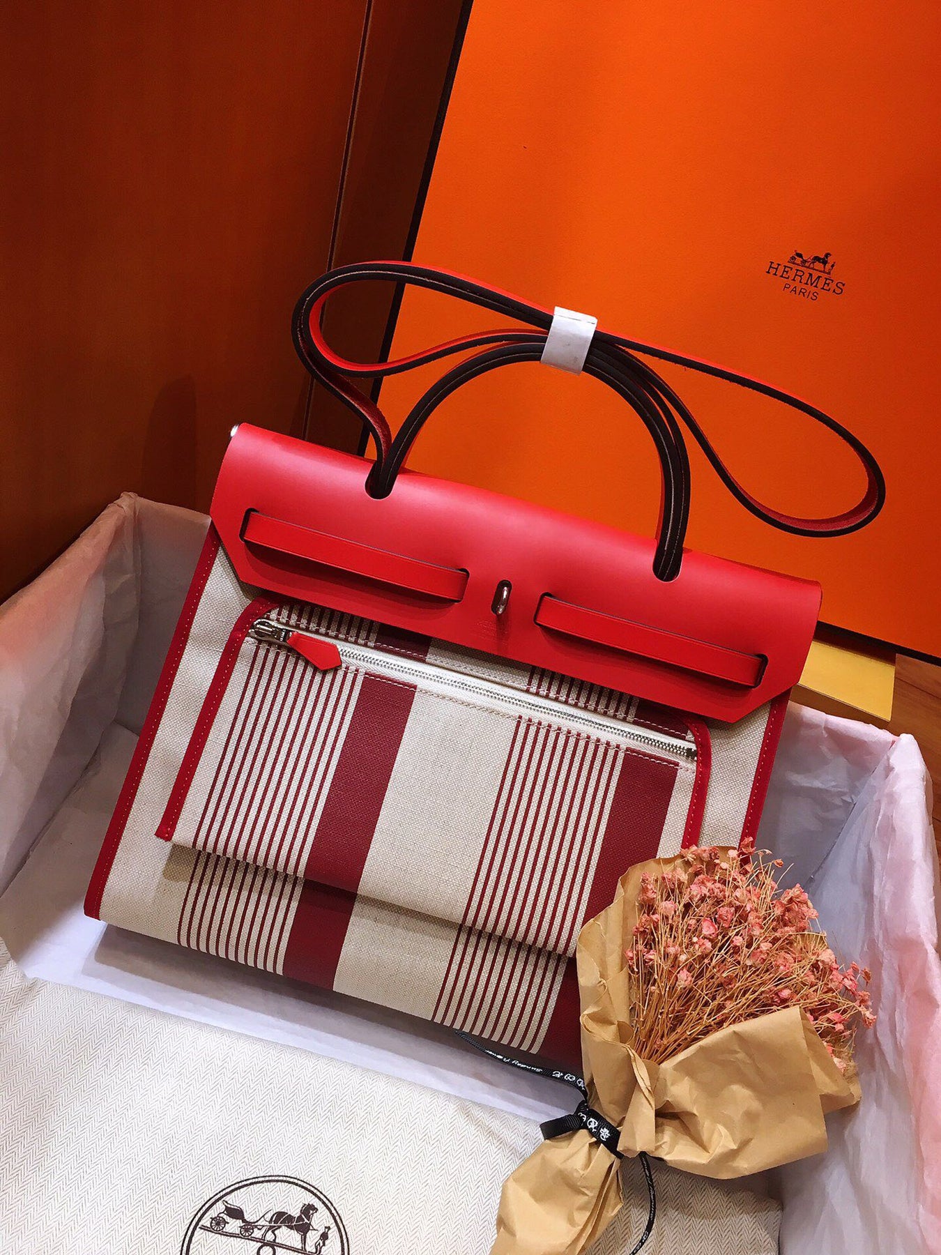 Introducing the Hermes Herbag PM, a sophisticated blend of elegance and practicality. This semi-handmade tote features a striking silk-screen design in vibrant red, making it a standout accessory for any occasion.