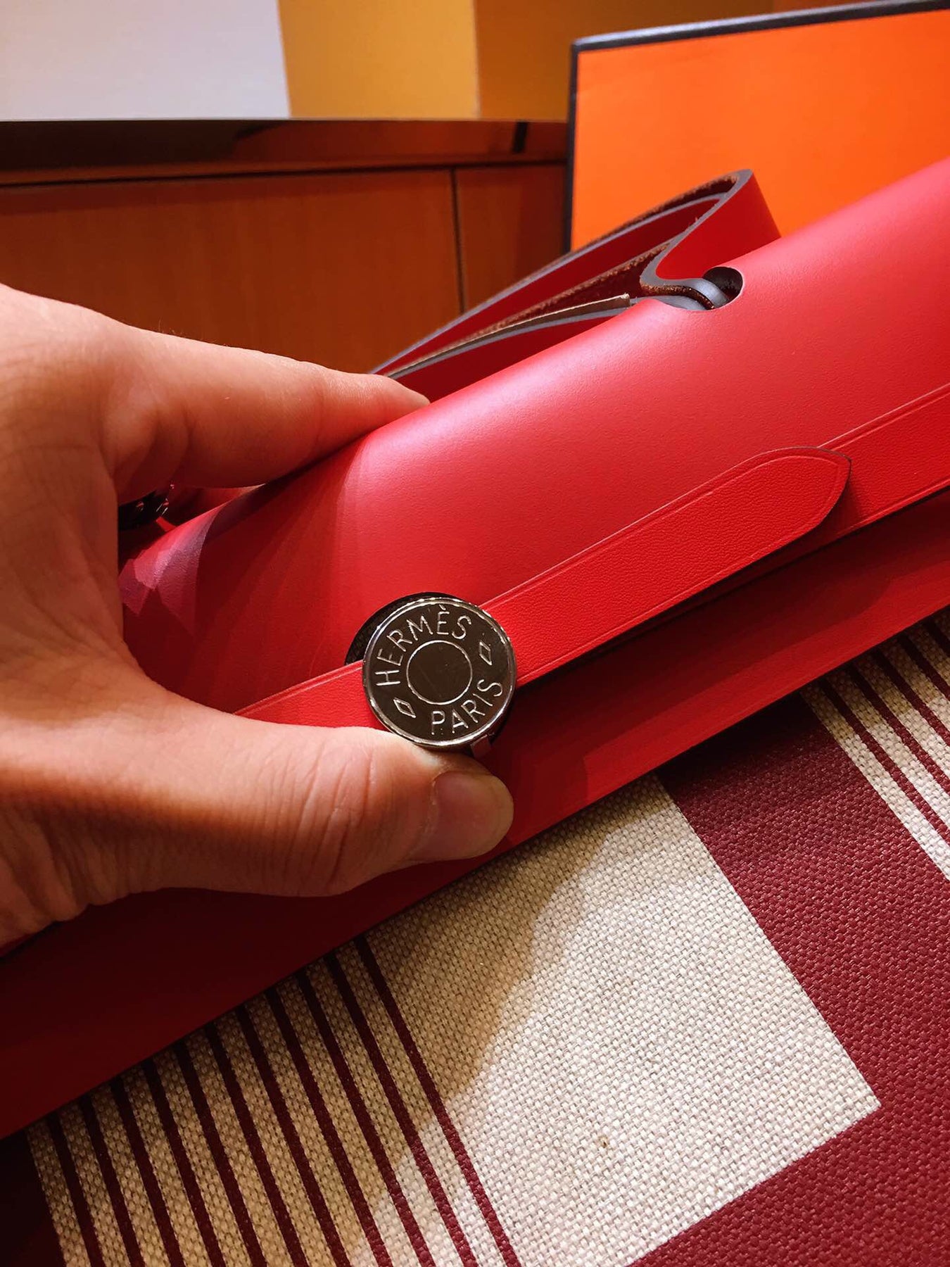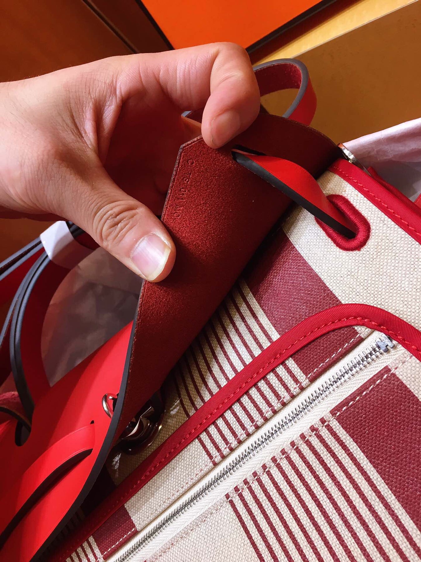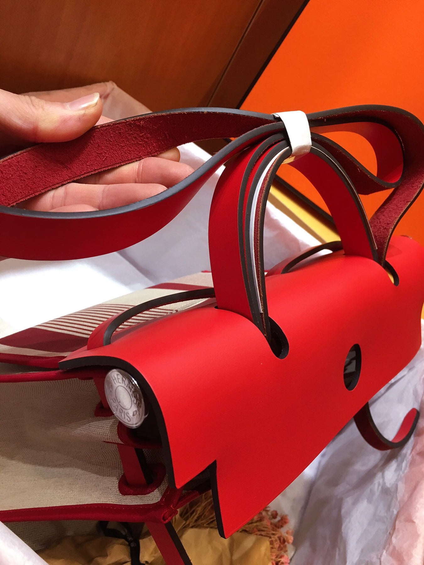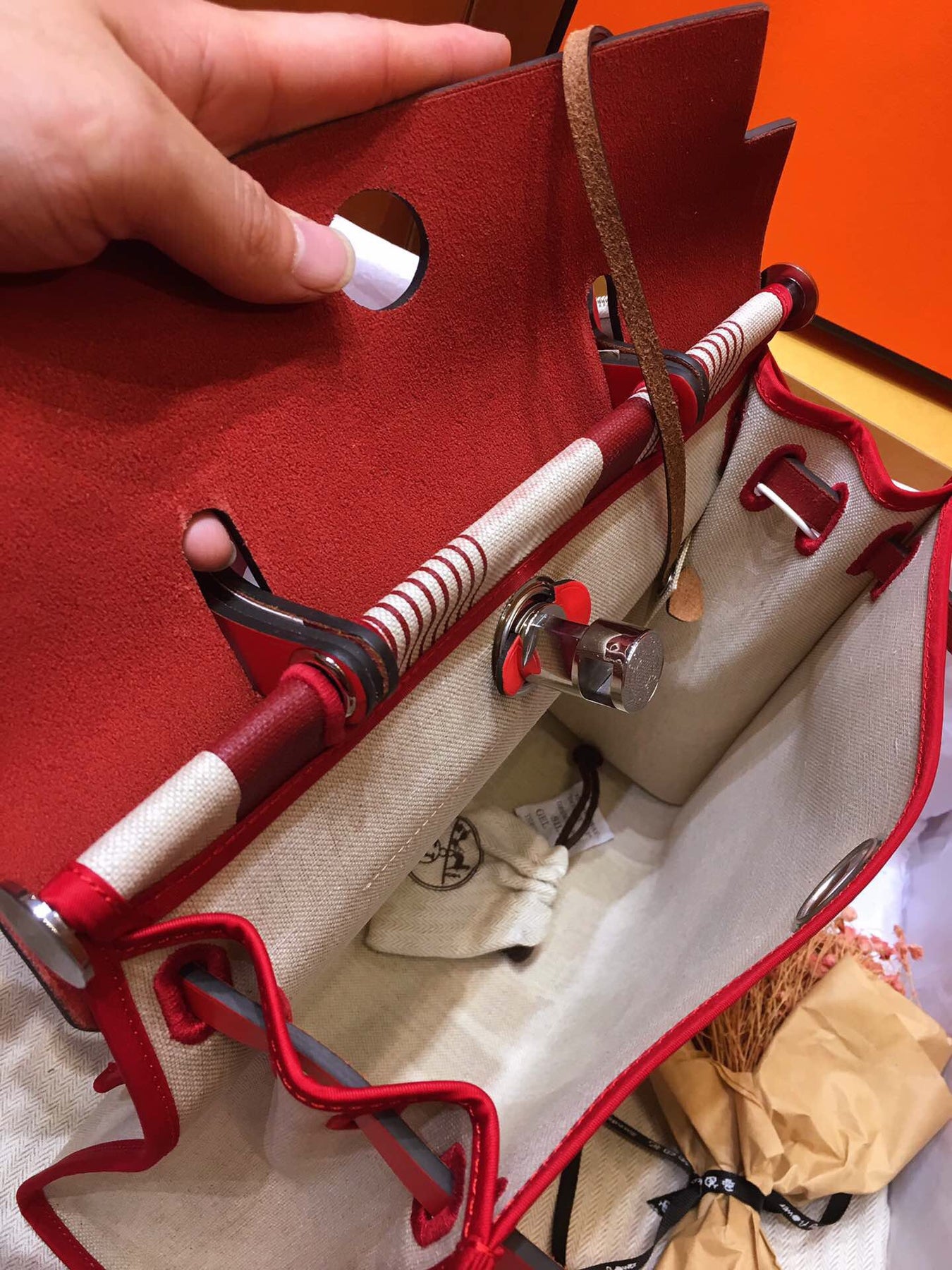 Introducing the Hermes Herbag PM, a sophisticated blend of elegance and practicality. This semi-handmade tote features a striking silk-screen design in vibrant red, making it a standout accessory for any occasion.