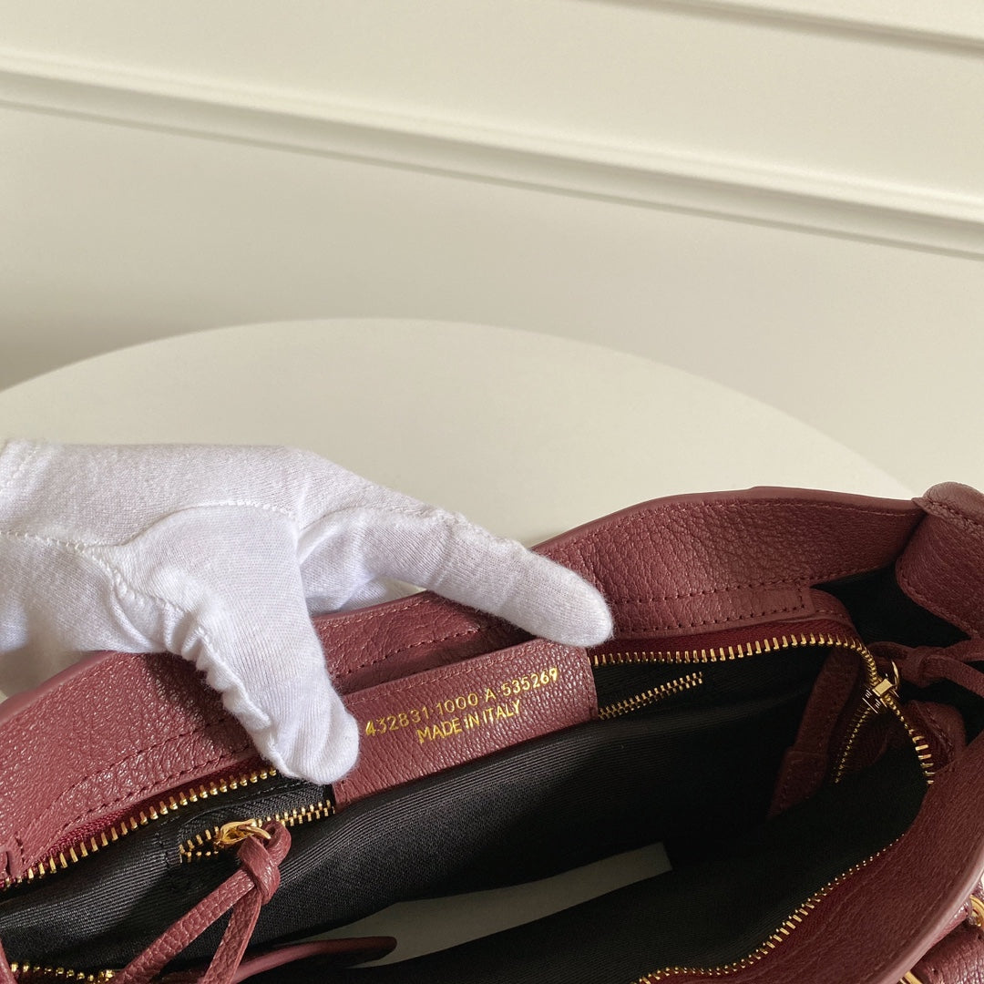 Elevate your style with our exquisite Italian-made Balenciaga motorcycle bag, crafted from premium goatskin leather. This stunning wine red bag features luxurious gold studs, making it a classic masterpiece that stands out in any setting.