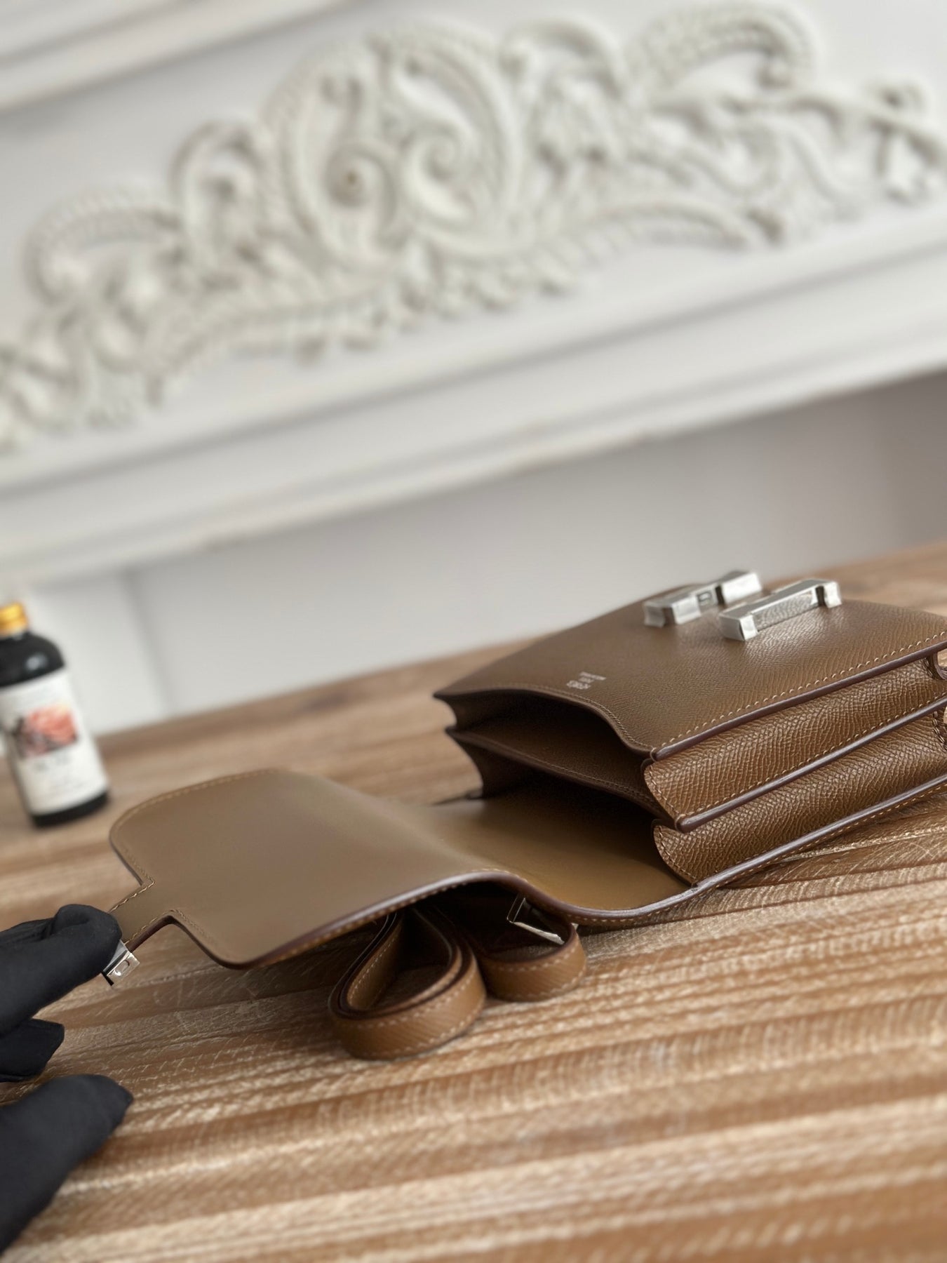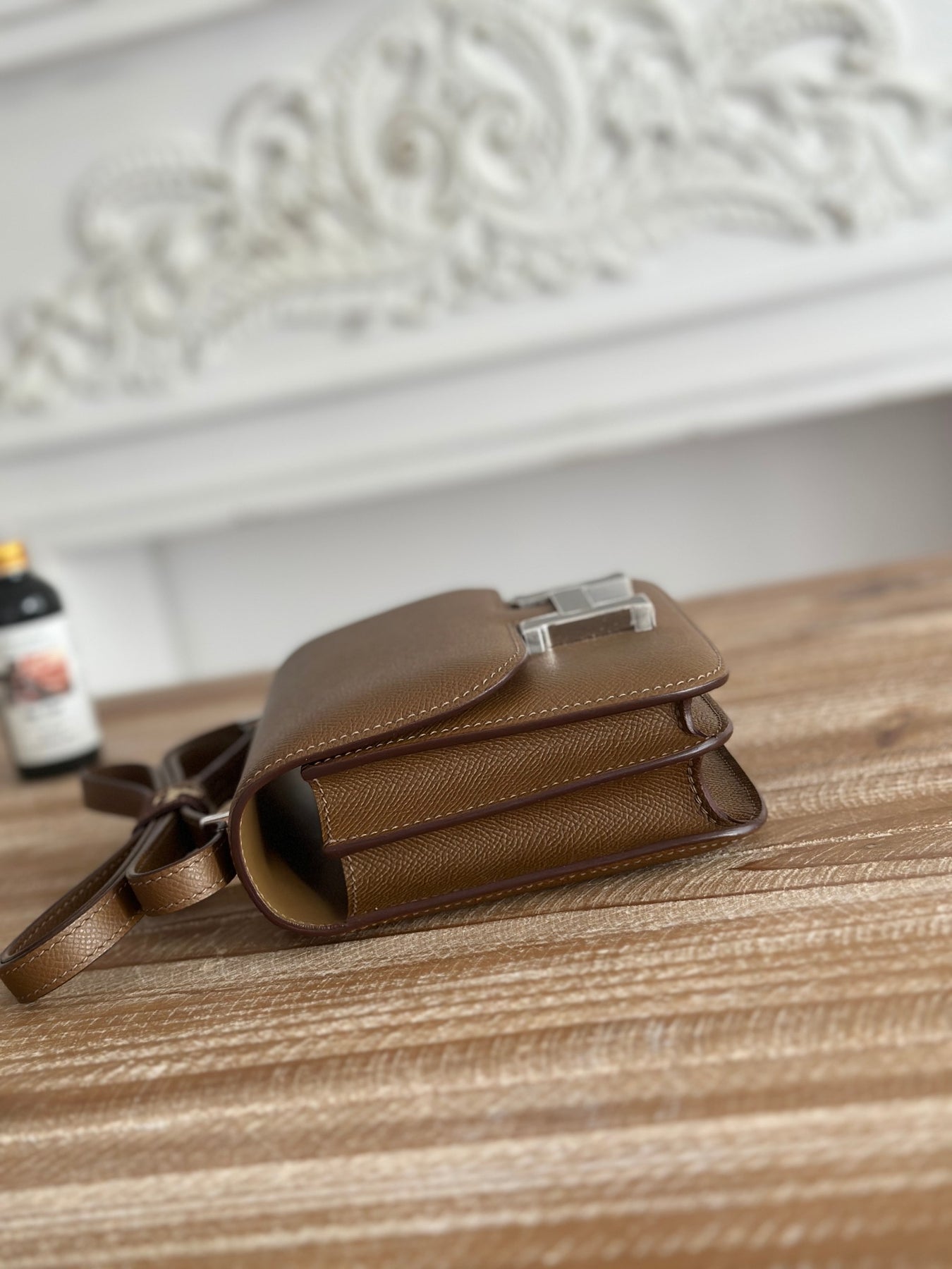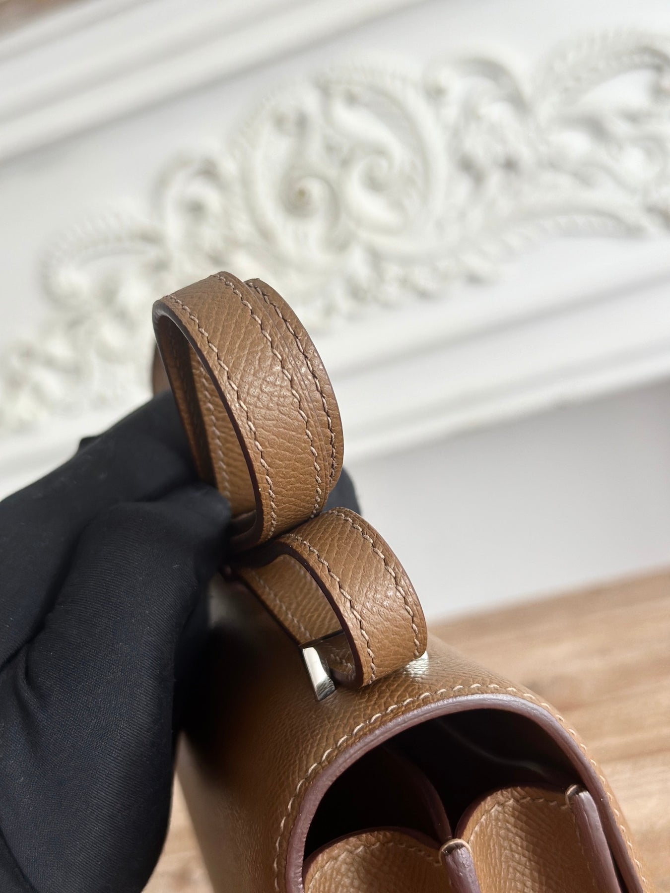 Discover elegance with the Kangkang Stewardess Bag, expertly crafted for discerning lovers of style. Made from premium epsom palm print calfskin, this semi-handmade bag features a sophisticated elephant gray hue and measures 19 cm in width. Its unique half-finished design, complemented by wax thread sewing, offers a blend of artistry and functionality. Elevate your accessory collection with this luxurious bag that seamlessly marries style and practicality.