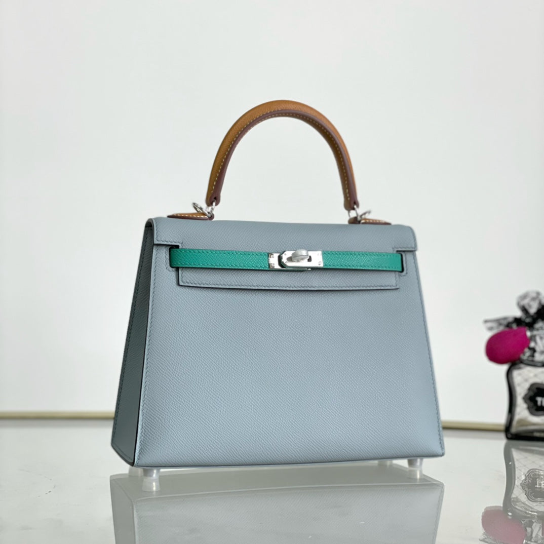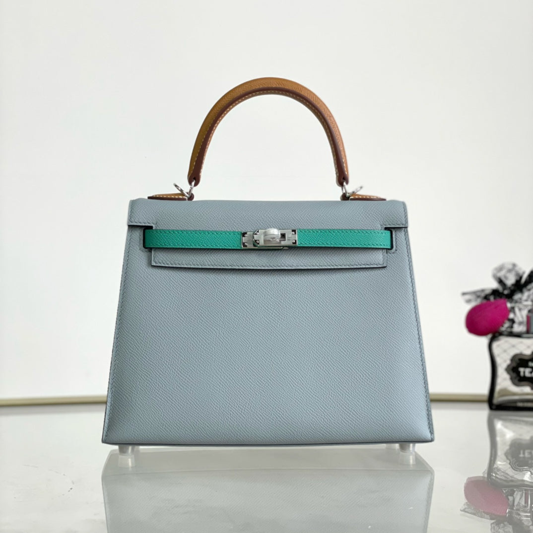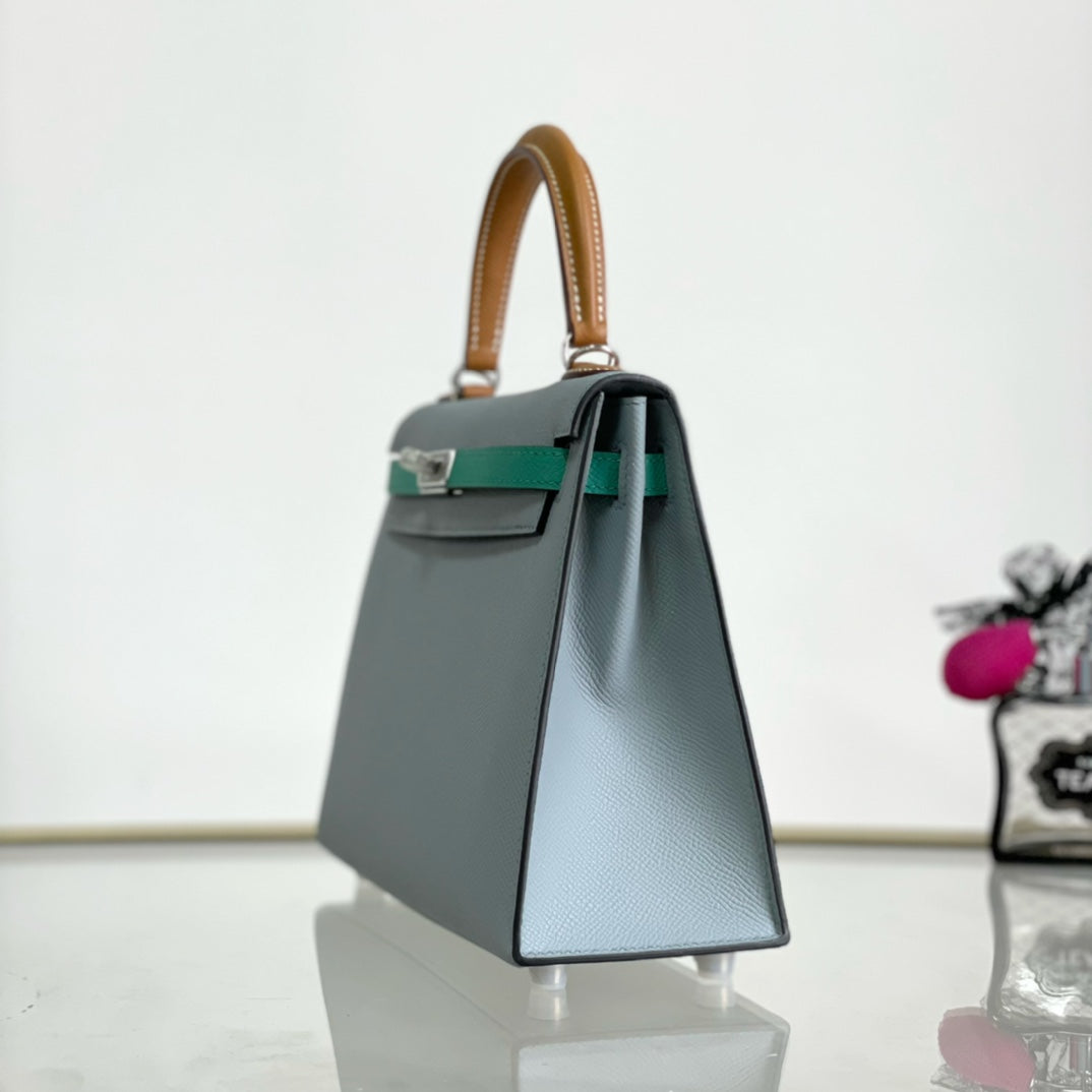 Discover the Kelly 25 handbag, featuring an exclusive EP palm print with three stunning color combinations. Meticulously crafted for a chic yet functional design, this handbag seamlessly complements any outfit. Its matching process ensures a cohesive look, making it the perfect accessory for any occasion. Elevate your style with the distinctive Kelly 25, where luxury meets everyday practicality.