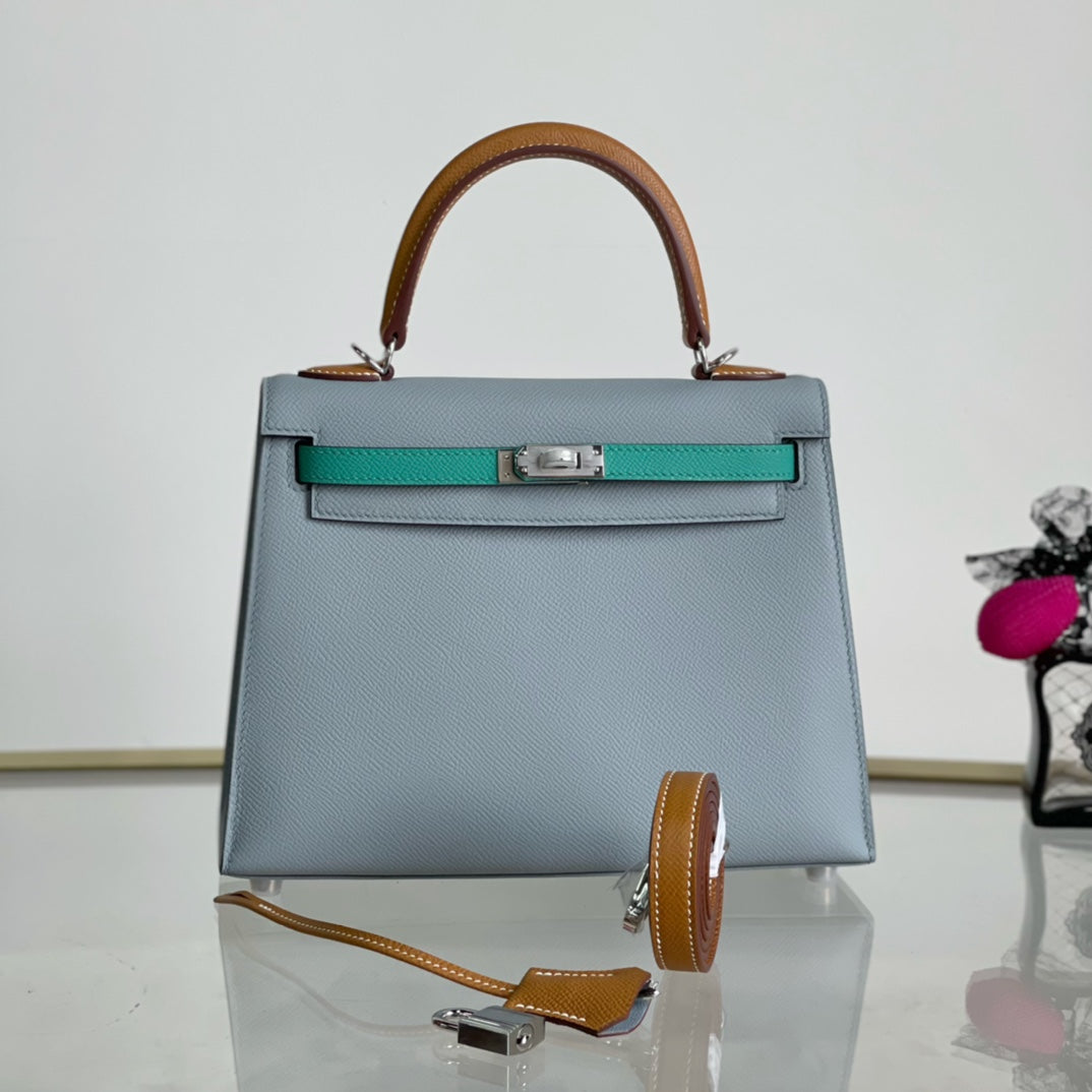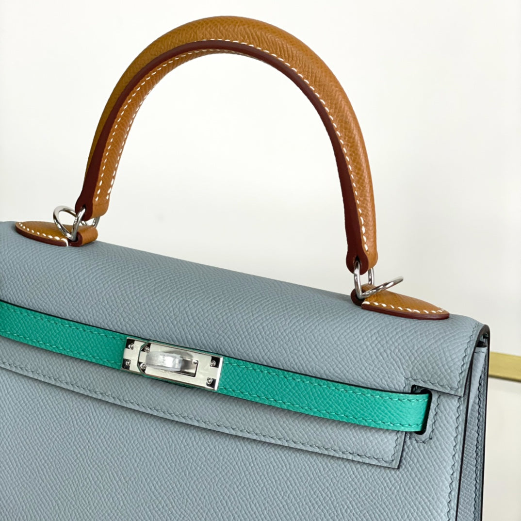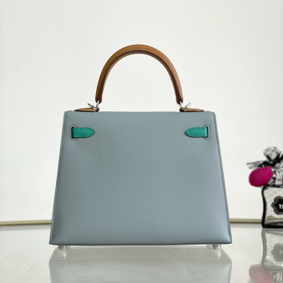 Discover the Kelly 25 handbag, featuring an exclusive EP palm print with three stunning color combinations. Meticulously crafted for a chic yet functional design, this handbag seamlessly complements any outfit. Its matching process ensures a cohesive look, making it the perfect accessory for any occasion. Elevate your style with the distinctive Kelly 25, where luxury meets everyday practicality.