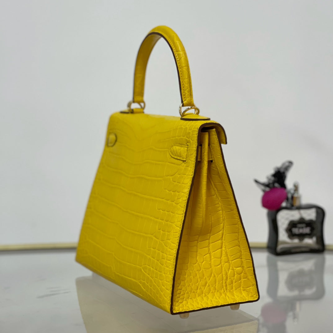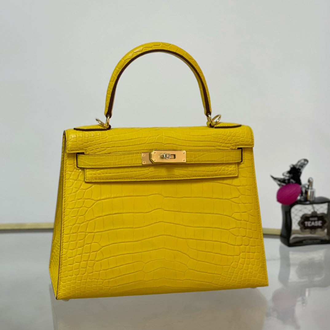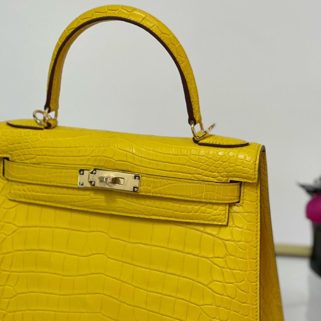Elevate your accessory game with the Kelly 28 Matte Lemon Handbag, featuring a stunning gold buckle for a touch of elegance. Crafted from high-quality materials, this handbag boasts a vibrant lemon hue that adds a pop of color to any outfit. With its spacious interior and sophisticated design, the Kelly 28 is perfect for both everyday use and special occasions. Make a bold statement and embrace luxury with this timeless piece.