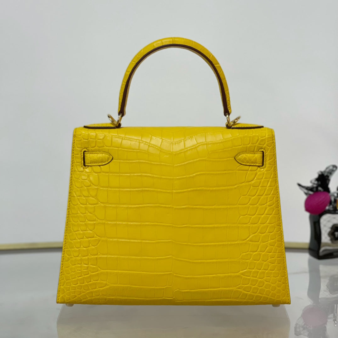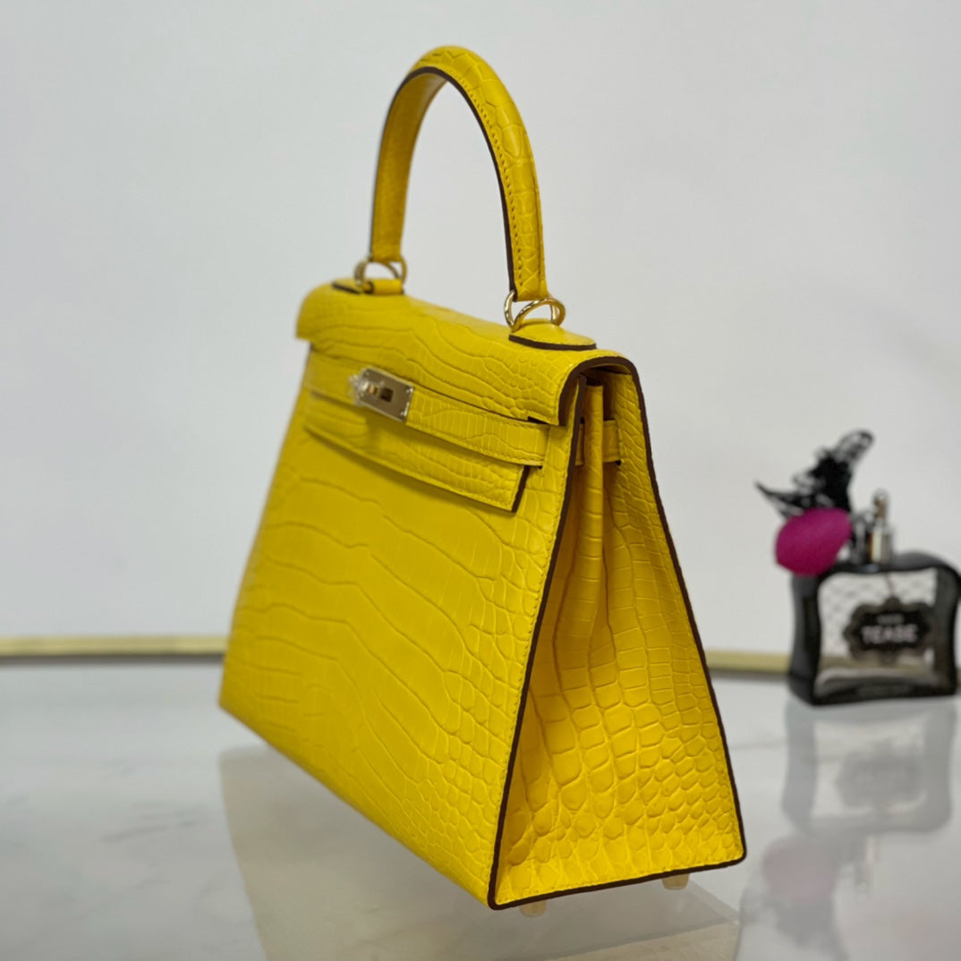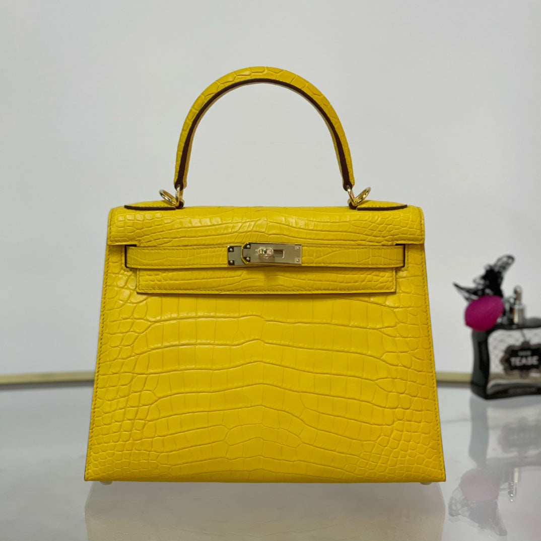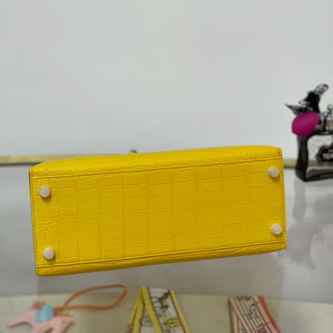 Elevate your accessory game with the Kelly 28 Matte Lemon Handbag, featuring a stunning gold buckle for a touch of elegance. Crafted from high-quality materials, this handbag boasts a vibrant lemon hue that adds a pop of color to any outfit. With its spacious interior and sophisticated design, the Kelly 28 is perfect for both everyday use and special occasions. Make a bold statement and embrace luxury with this timeless piece.