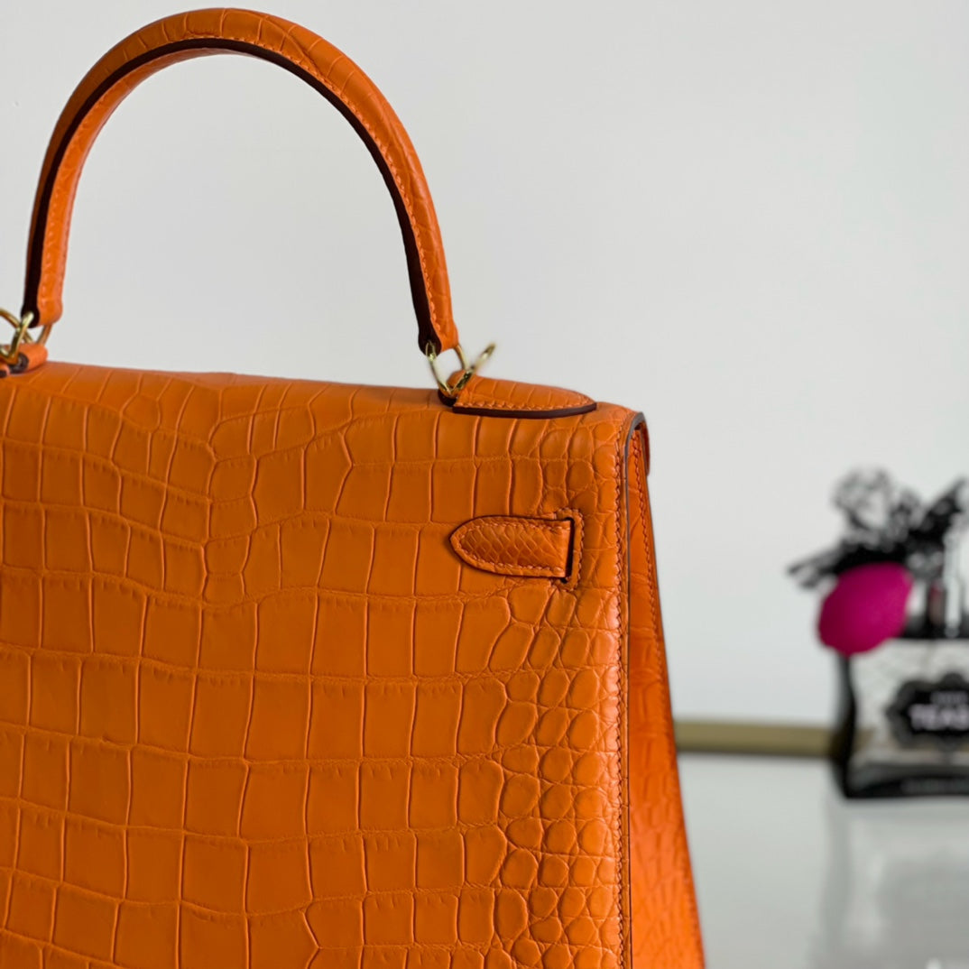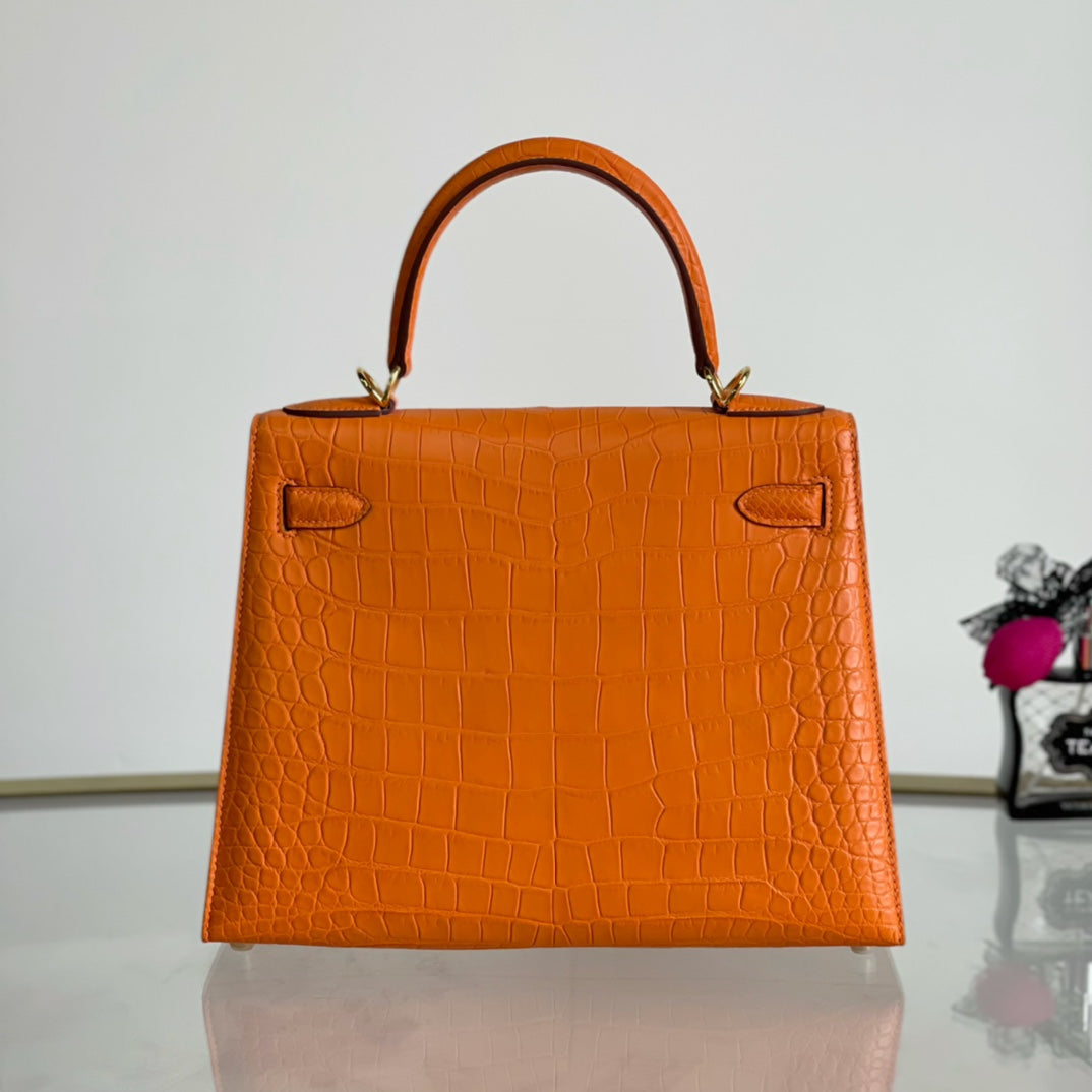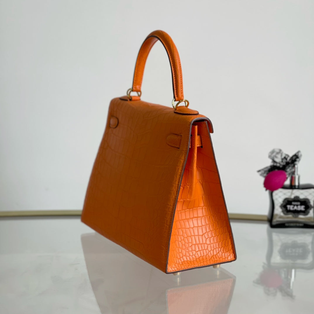 Introducing the Kelly 28 Matte Handbag in a vibrant orange finish, a perfect blend of style and sophistication. This elegant bag features both silver and gold buckles, allowing for versatile styling options to suit any occasion. Crafted for durability and designed with an eye for detail, the Kelly 28 is perfect for those who seek a balance of functionality and fashion. Upgrade your accessory collection with this stunning piece today!