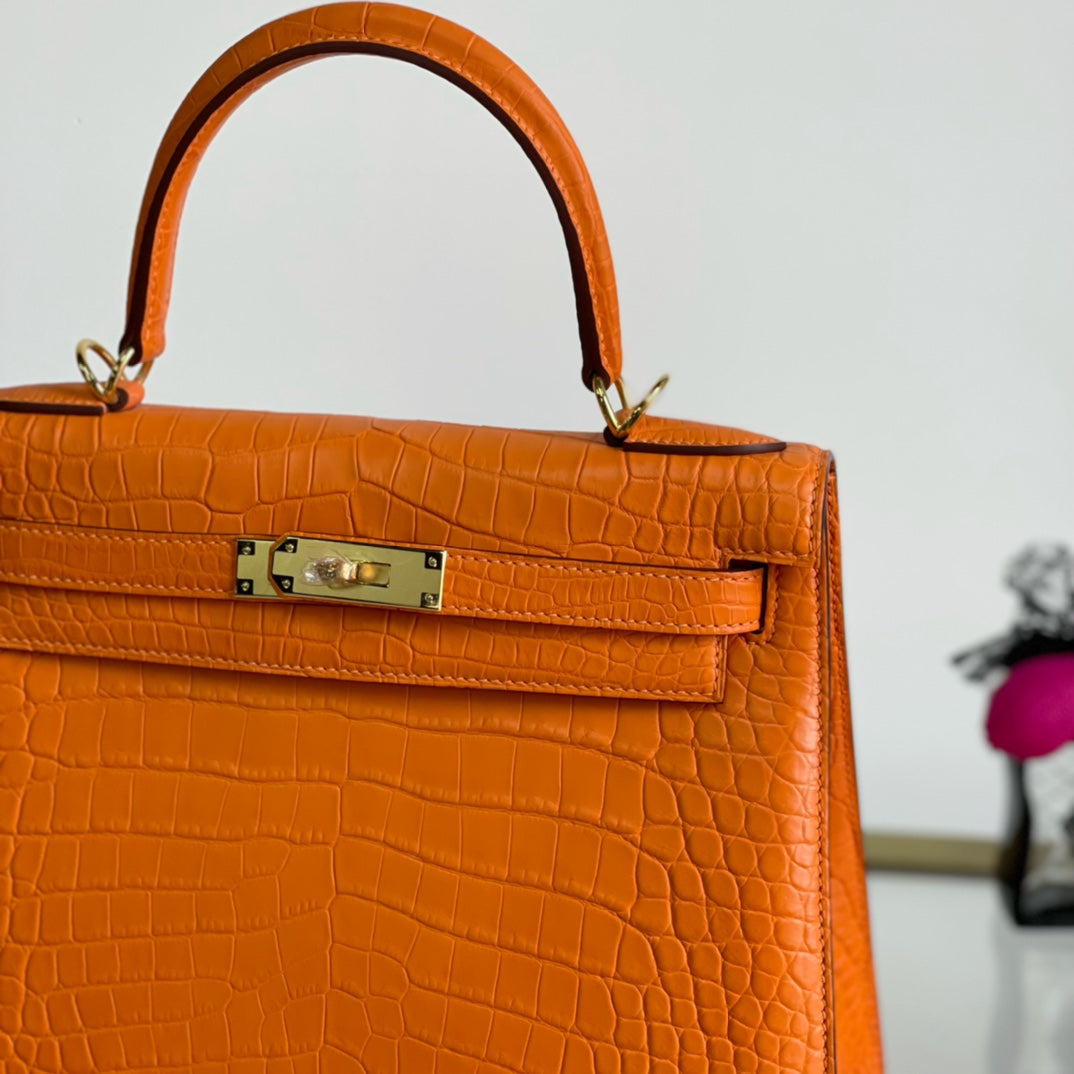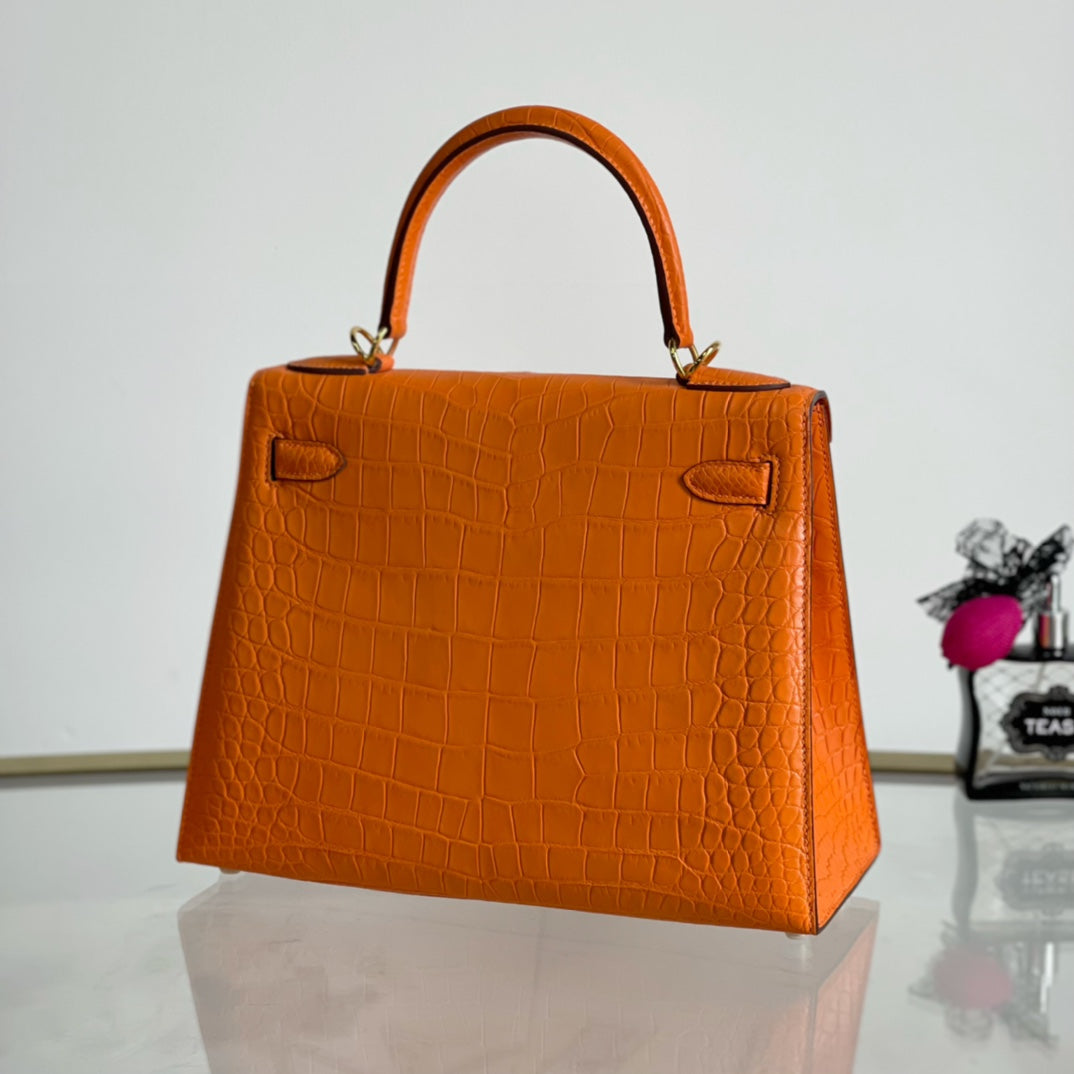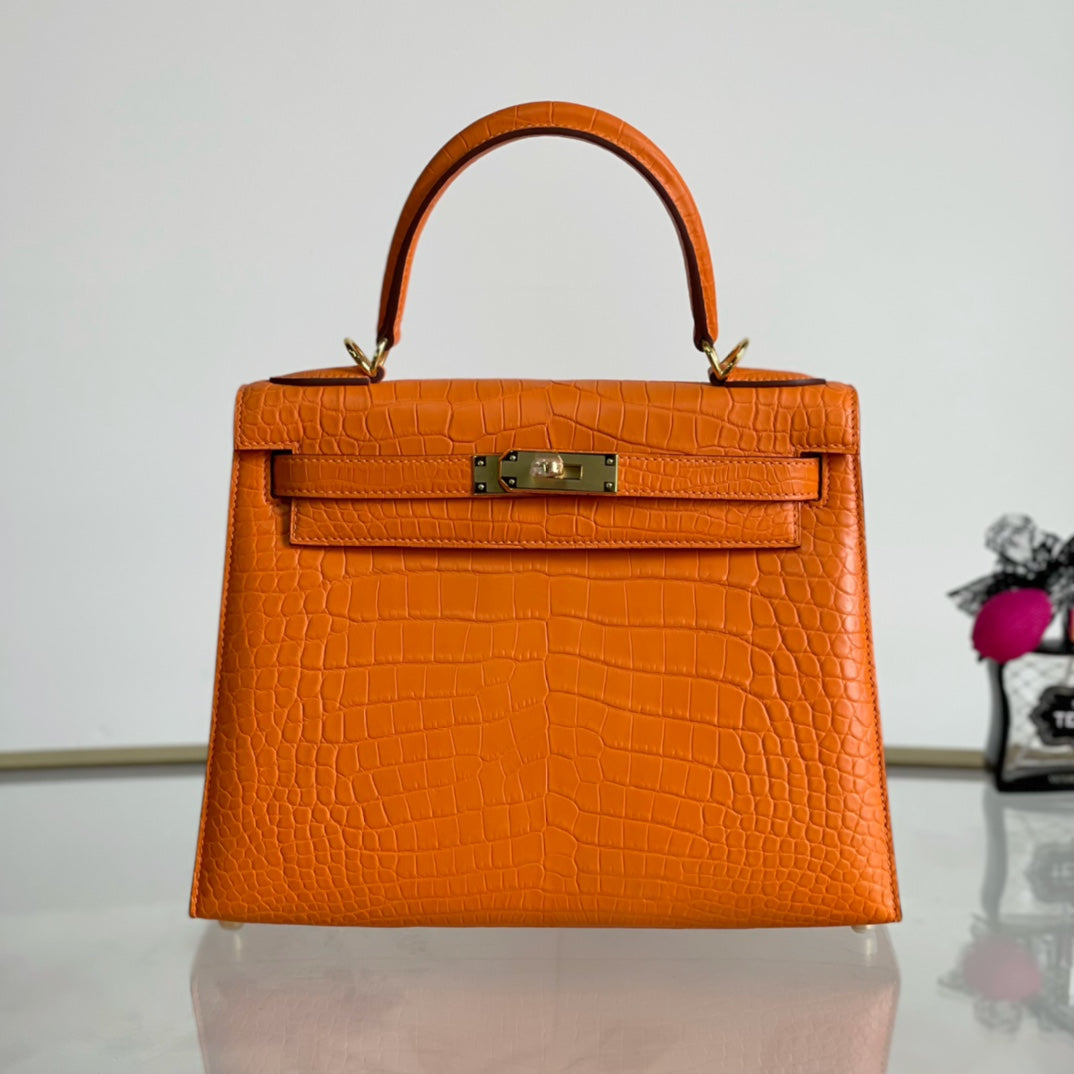 Introducing the Kelly 28 Matte Handbag in a vibrant orange finish, a perfect blend of style and sophistication. This elegant bag features both silver and gold buckles, allowing for versatile styling options to suit any occasion. Crafted for durability and designed with an eye for detail, the Kelly 28 is perfect for those who seek a balance of functionality and fashion. Upgrade your accessory collection with this stunning piece today!