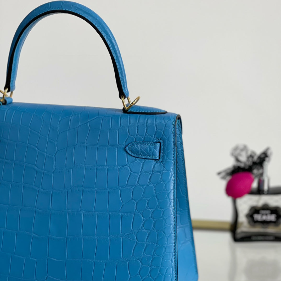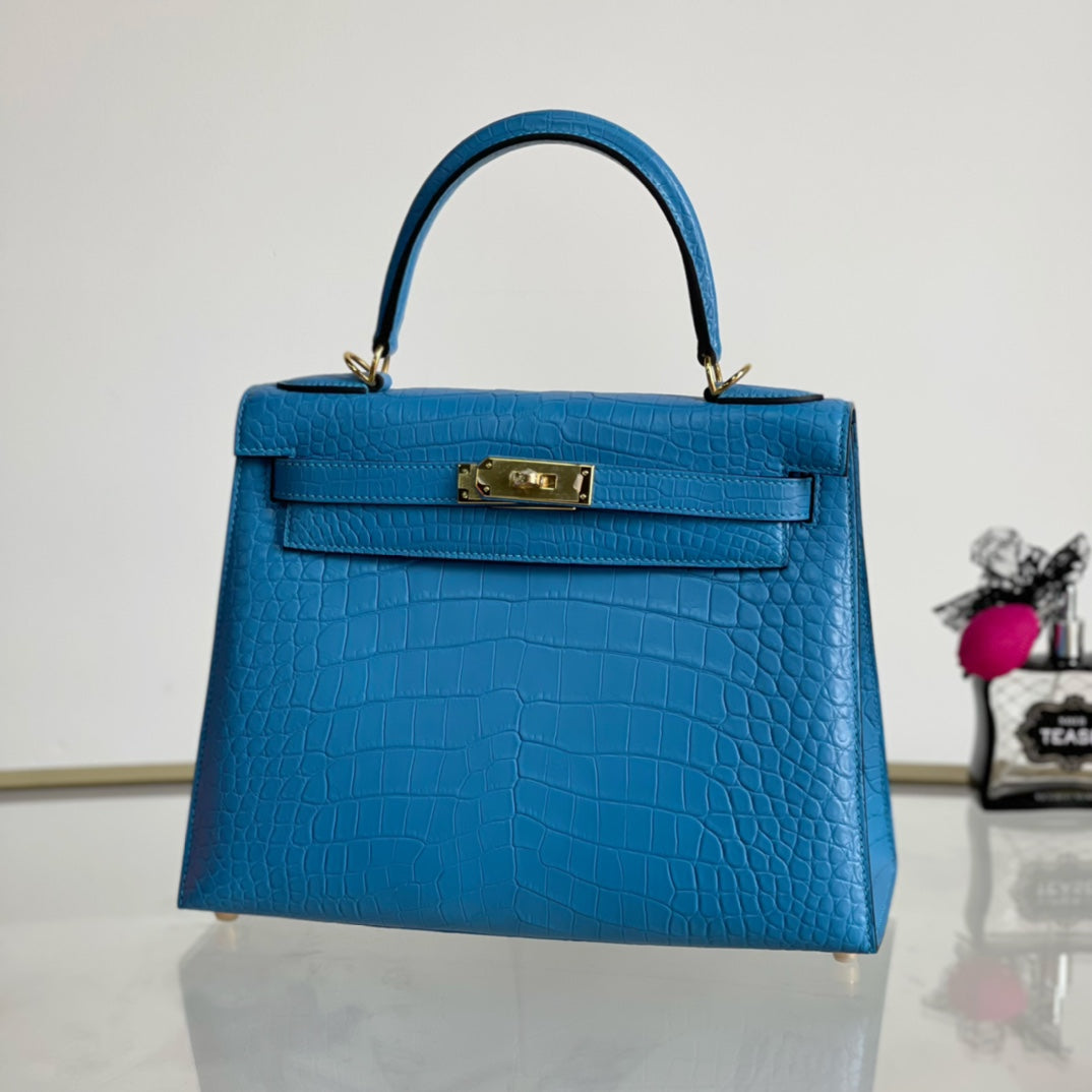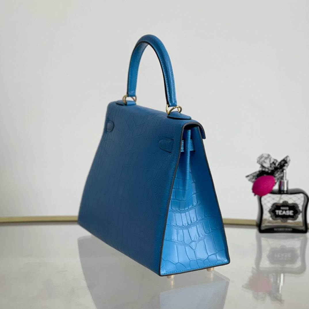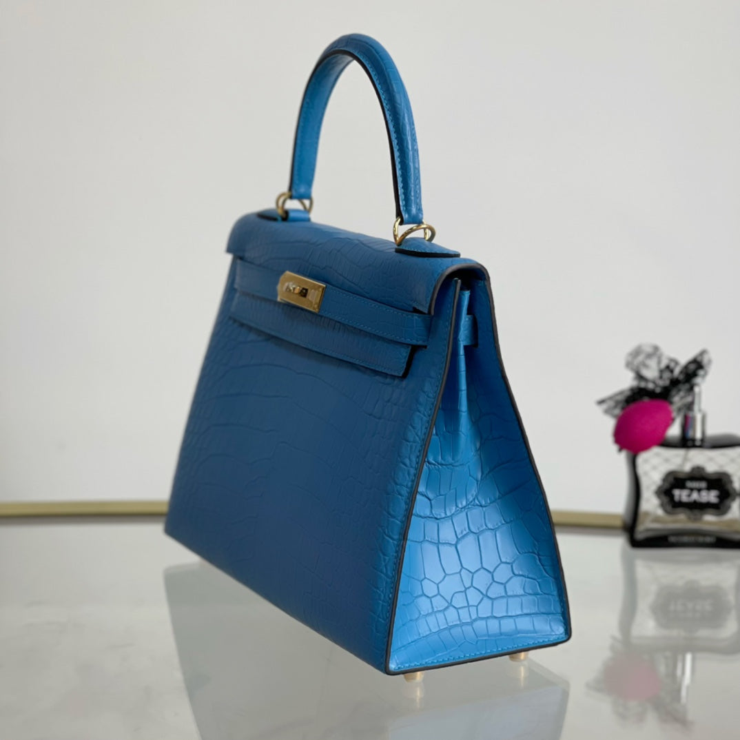Introducing the Kelly 28 Matte Handbag in a stunning sky blue hue, adorned with a luxurious gold buckle. This elegant accessory combines modern sophistication with timeless design. Made from high-quality materials, it features a sleek matte finish that enhances its overall allure. Ideal for any occasion, the Kelly 28 is spacious enough to carry your essentials while making a bold fashion statement. Elevate your style with this must-have handbag that effortlessly transitions from day to night.