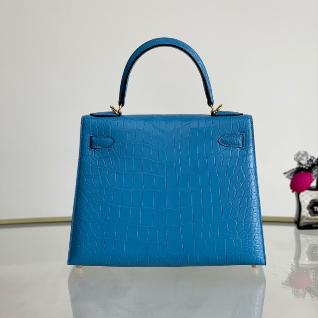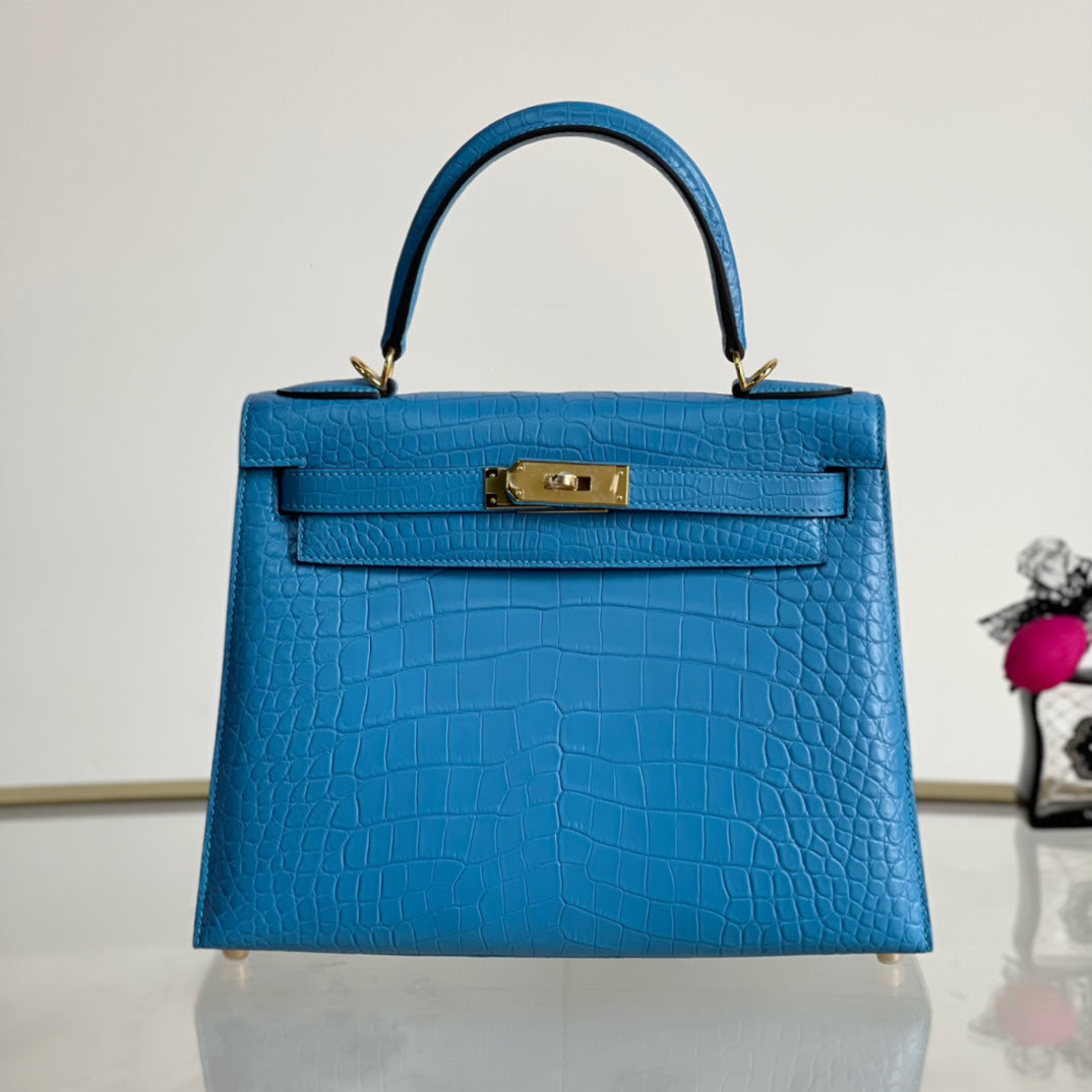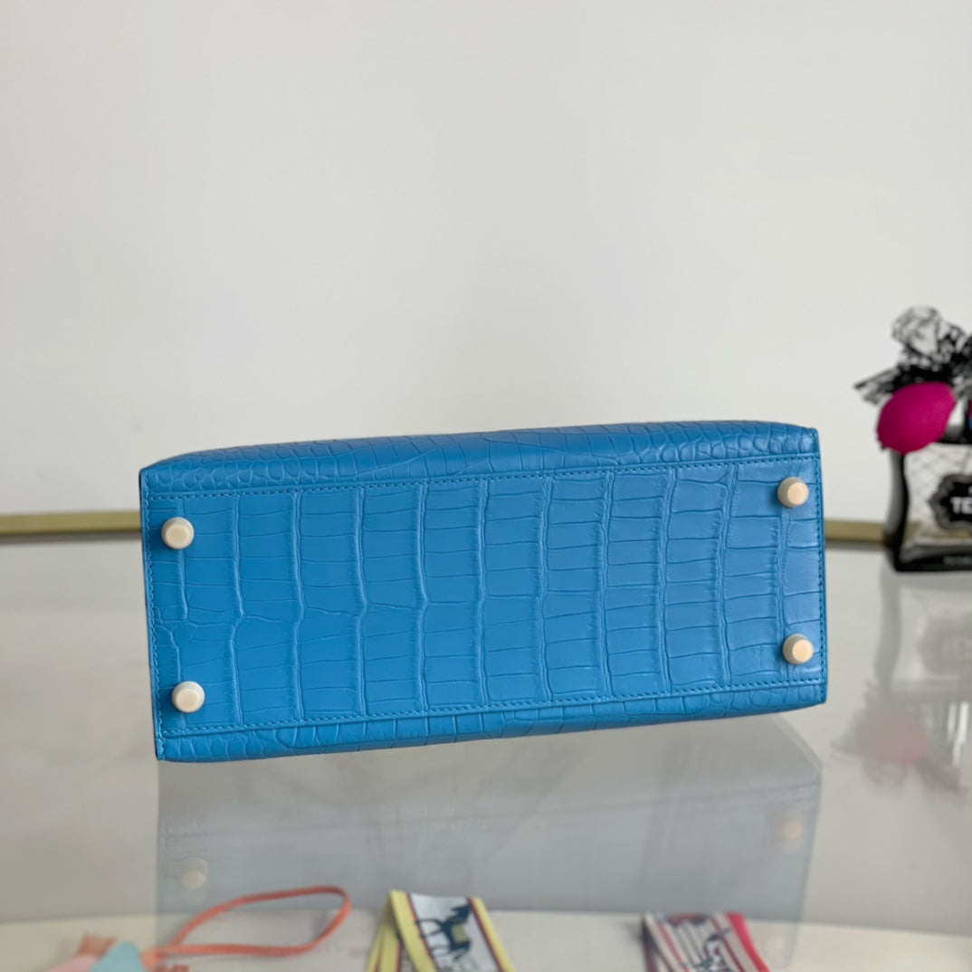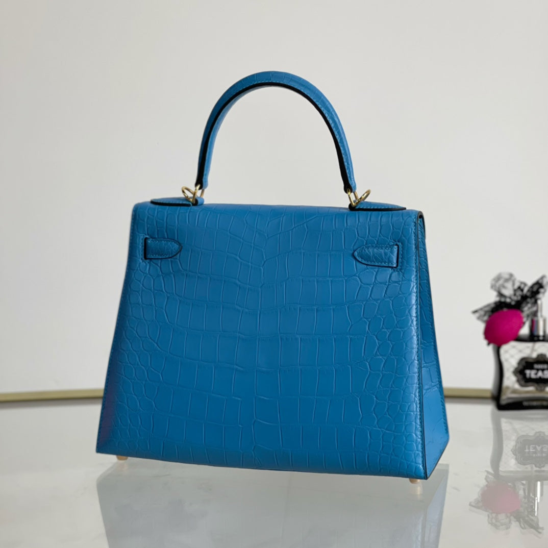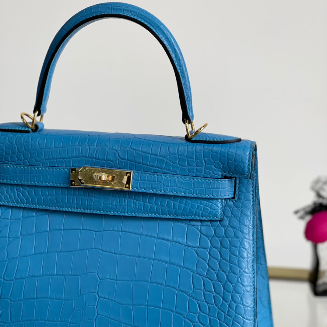Introducing the Kelly 28 Matte Handbag in a stunning sky blue hue, adorned with a luxurious gold buckle. This elegant accessory combines modern sophistication with timeless design. Made from high-quality materials, it features a sleek matte finish that enhances its overall allure. Ideal for any occasion, the Kelly 28 is spacious enough to carry your essentials while making a bold fashion statement. Elevate your style with this must-have handbag that effortlessly transitions from day to night.