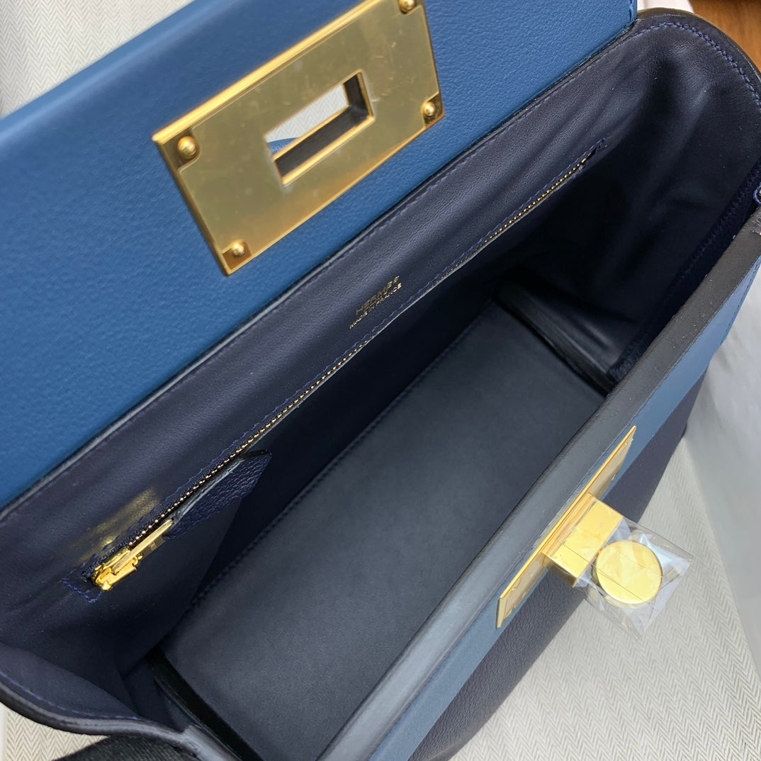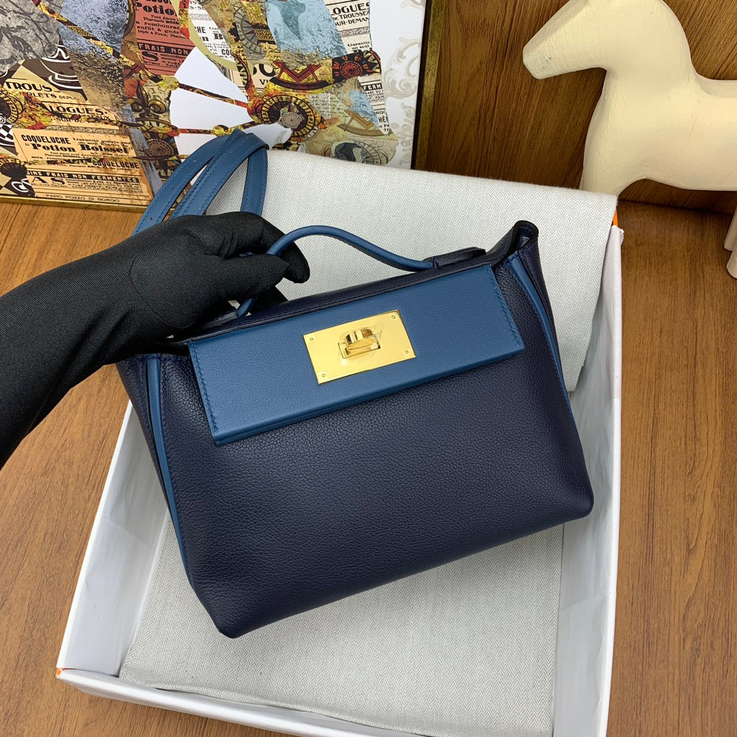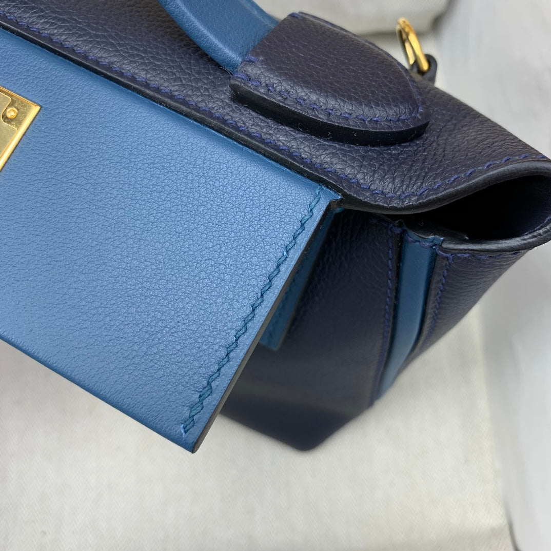 Discover the stunning Kelly Mini 2424, meticulously handcrafted and available in stock. This elegant 21cm handbag is designed with luxurious swift leather in a captivating midnight blue, complemented by a striking navy blue gold buckle.