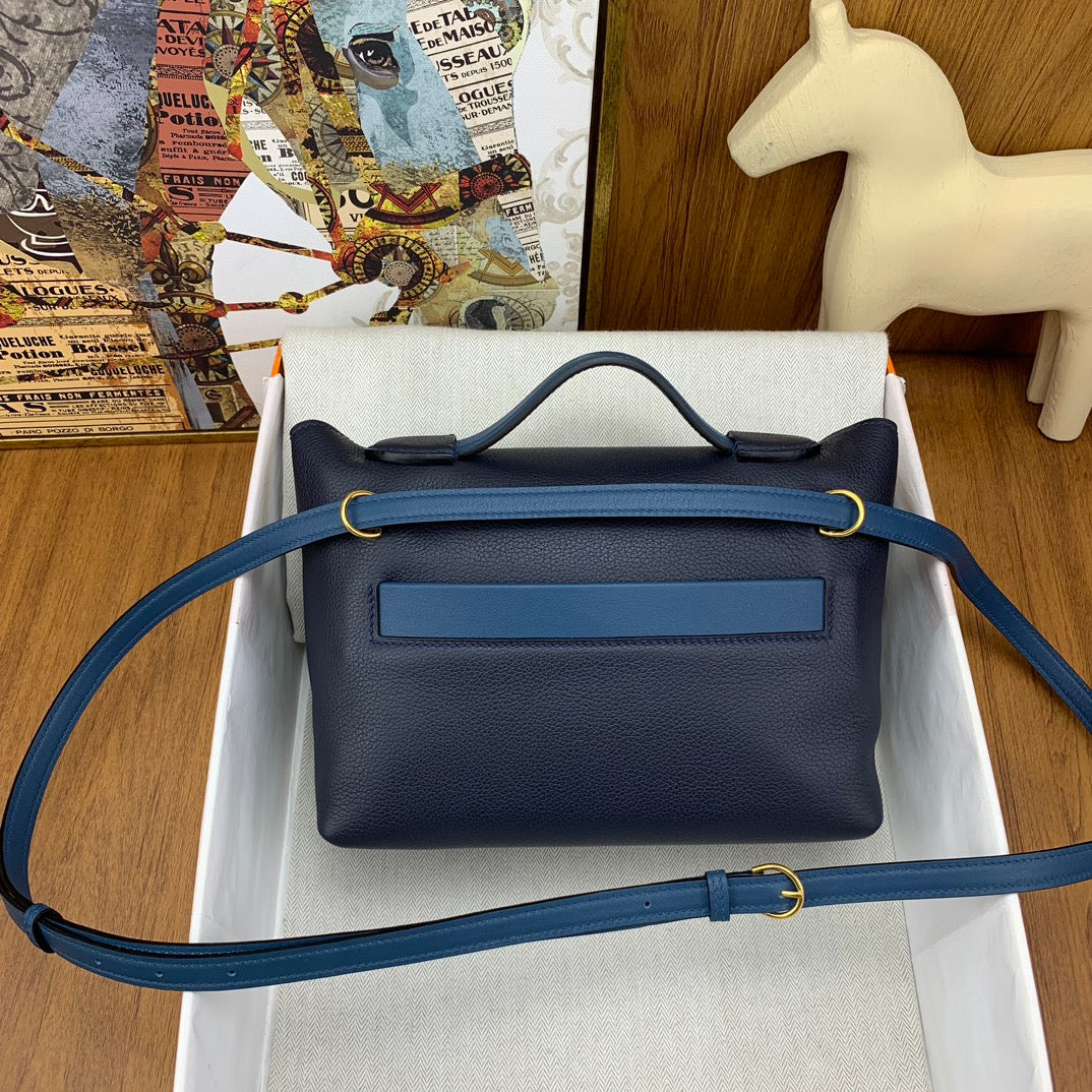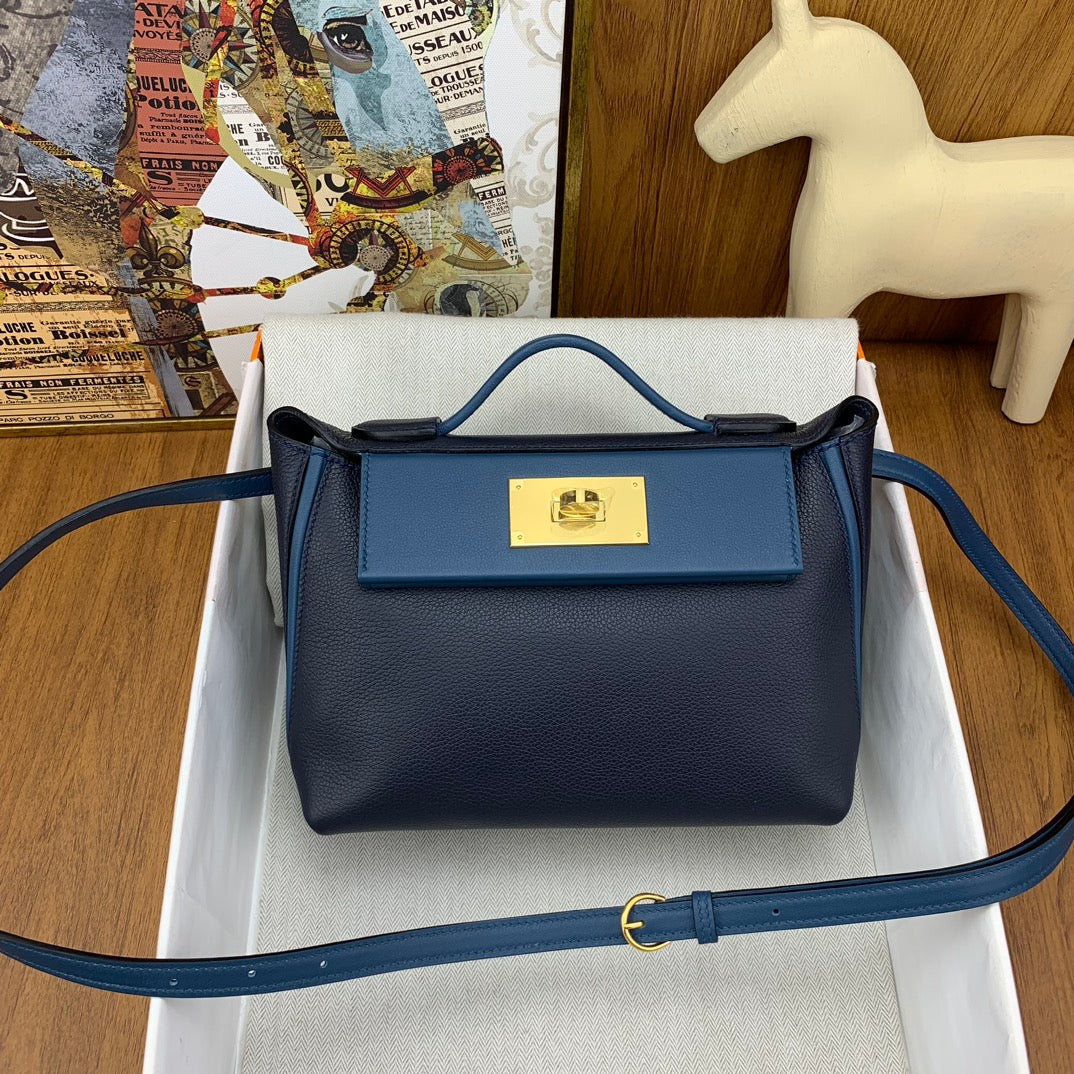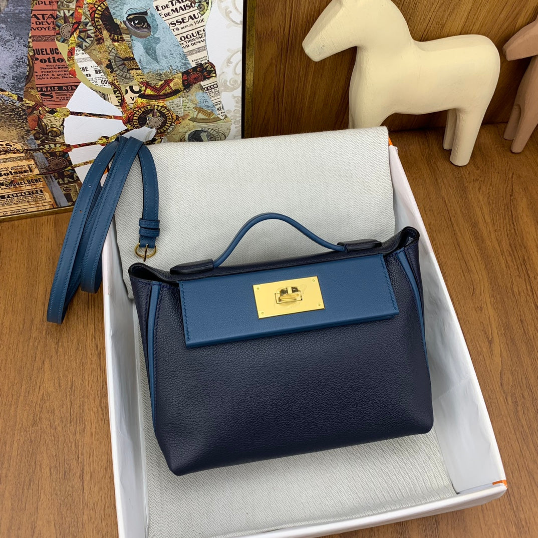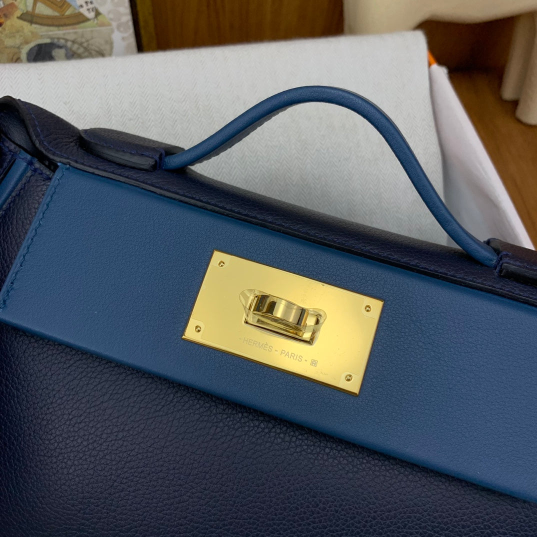 Discover the stunning Kelly Mini 2424, meticulously handcrafted and available in stock. This elegant 21cm handbag is designed with luxurious swift leather in a captivating midnight blue, complemented by a striking navy blue gold buckle.