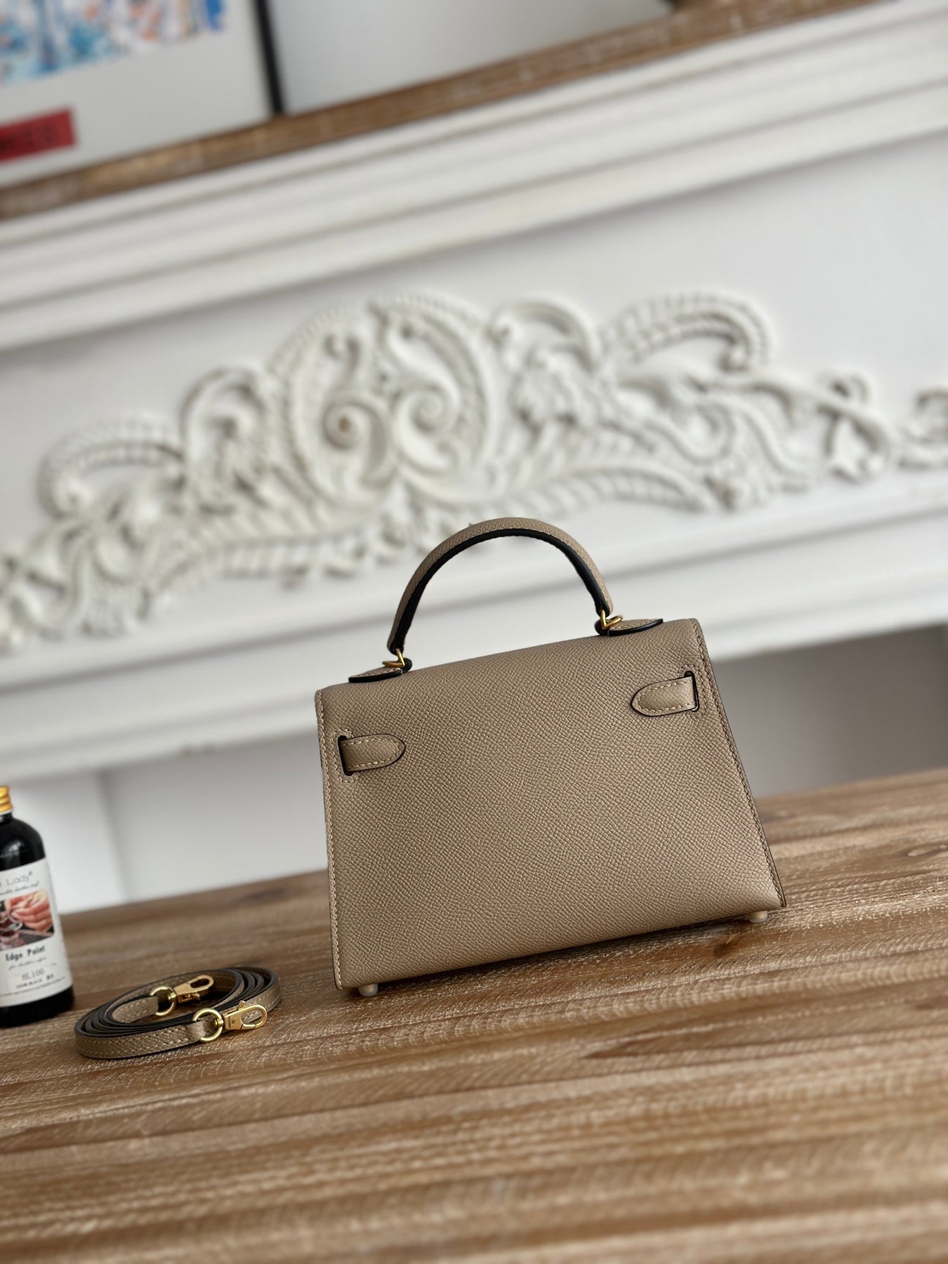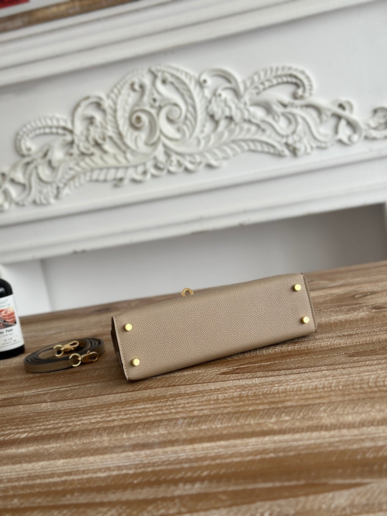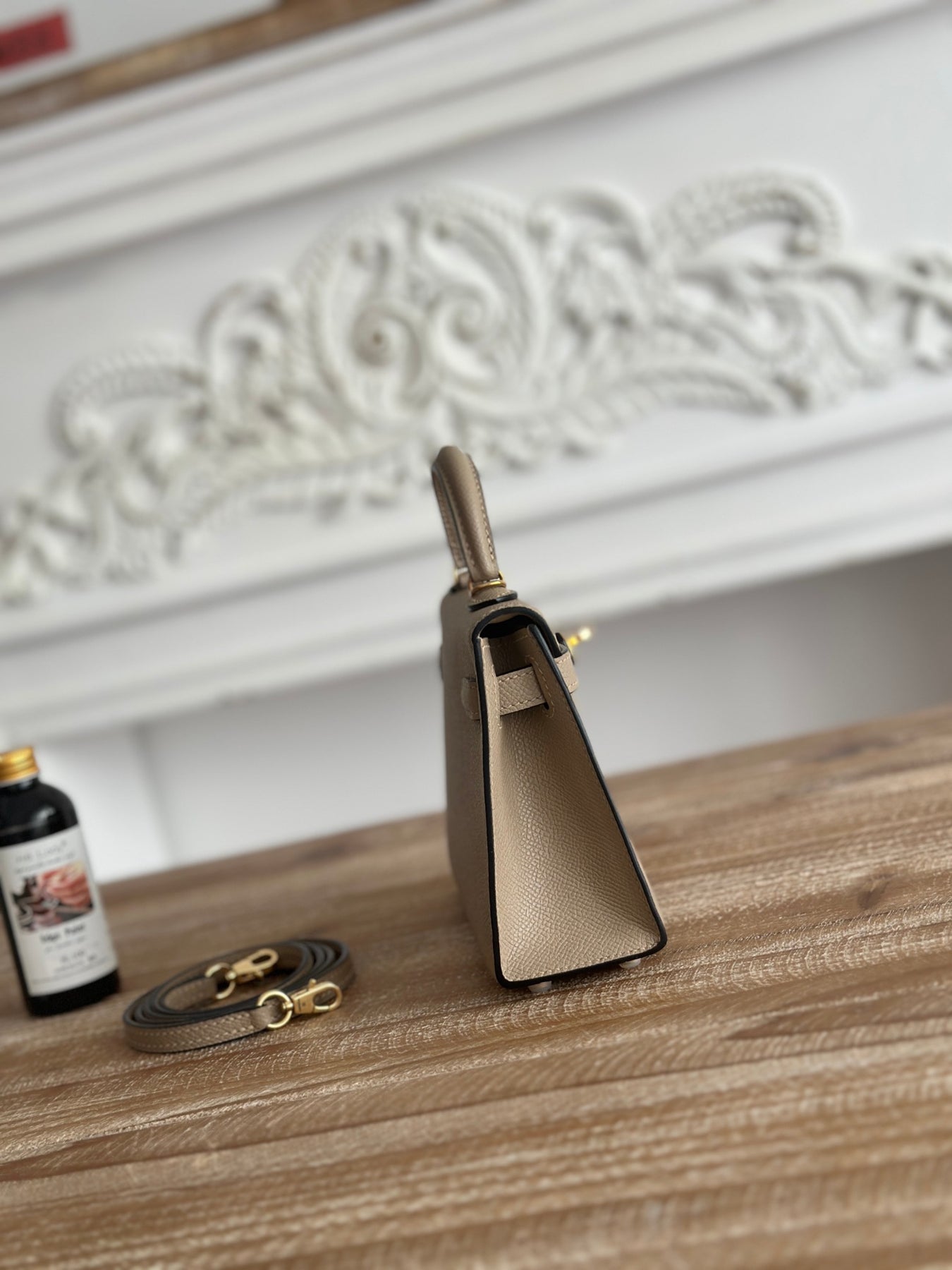 Introducing the second generation Kelly Mini Handbag in a sophisticated windbreaker gray. Crafted with imported Epsom leather, this semi-handmade piece features durable wax thread stitching, ensuring both elegance and quality. Compact at 19cm, it's the perfect accessory for any occasion, combining functionality with timeless style. Elevate your wardrobe with this chic mini handbag today!